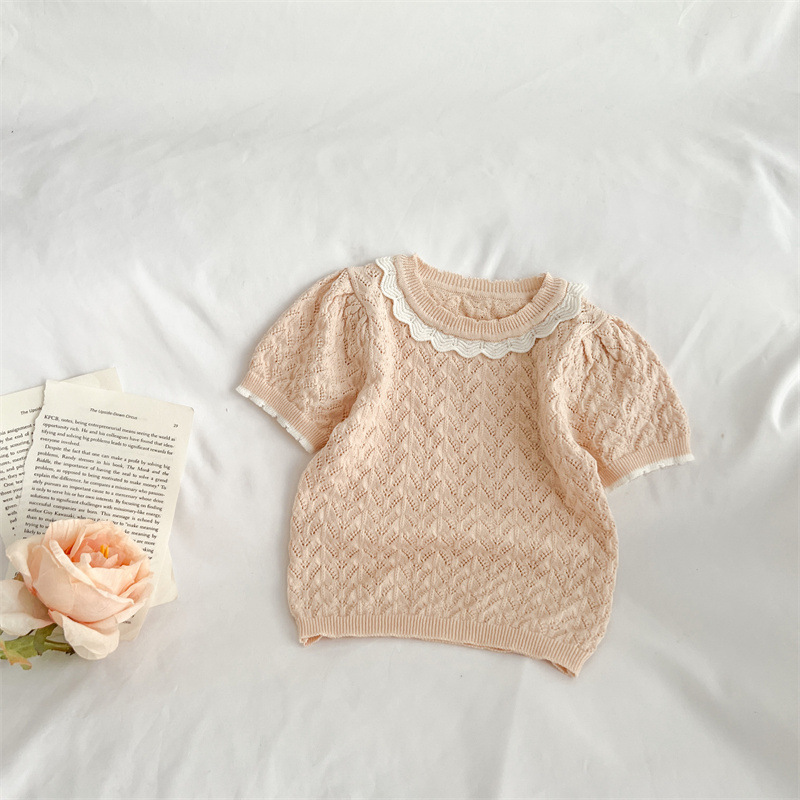 2024 여름 아기 소녀 니트 티셔츠 일본과 한국 스타일 단순 중공 부드러운 밀랍 반팔 레이스 라운드 넥 탑 유행