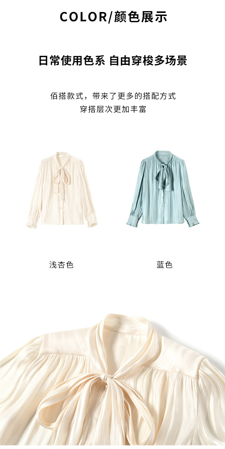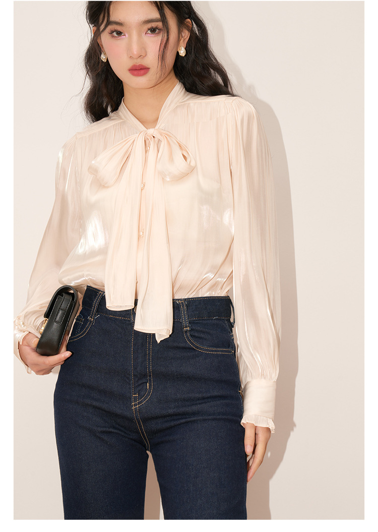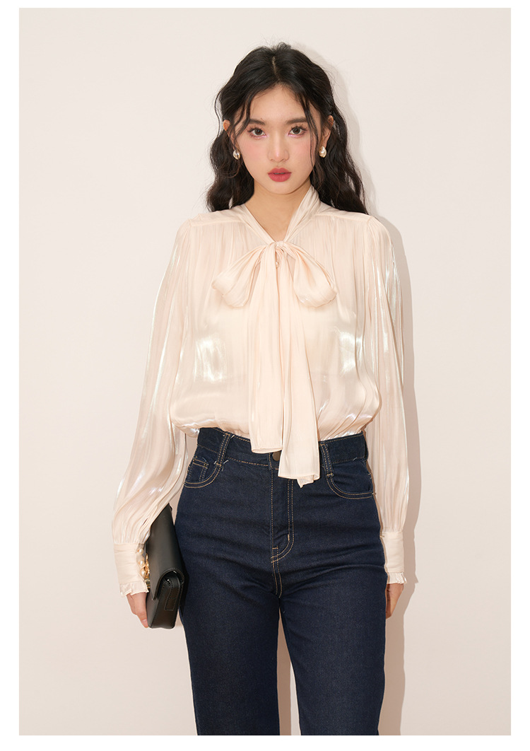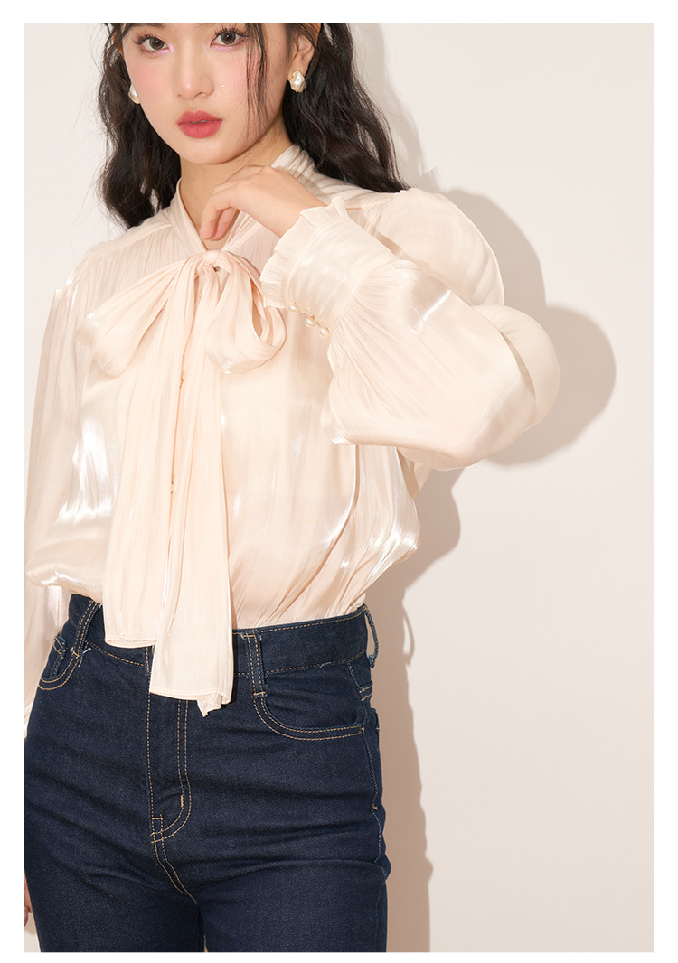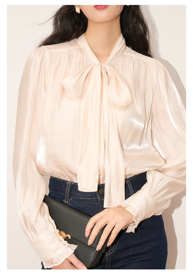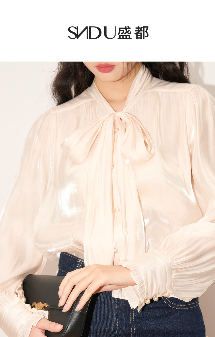 【盛都】봄 신상 프렌치 로맨틱 우아한 광택 리본 레이스업 출퇴근 캐주얼 셔츠