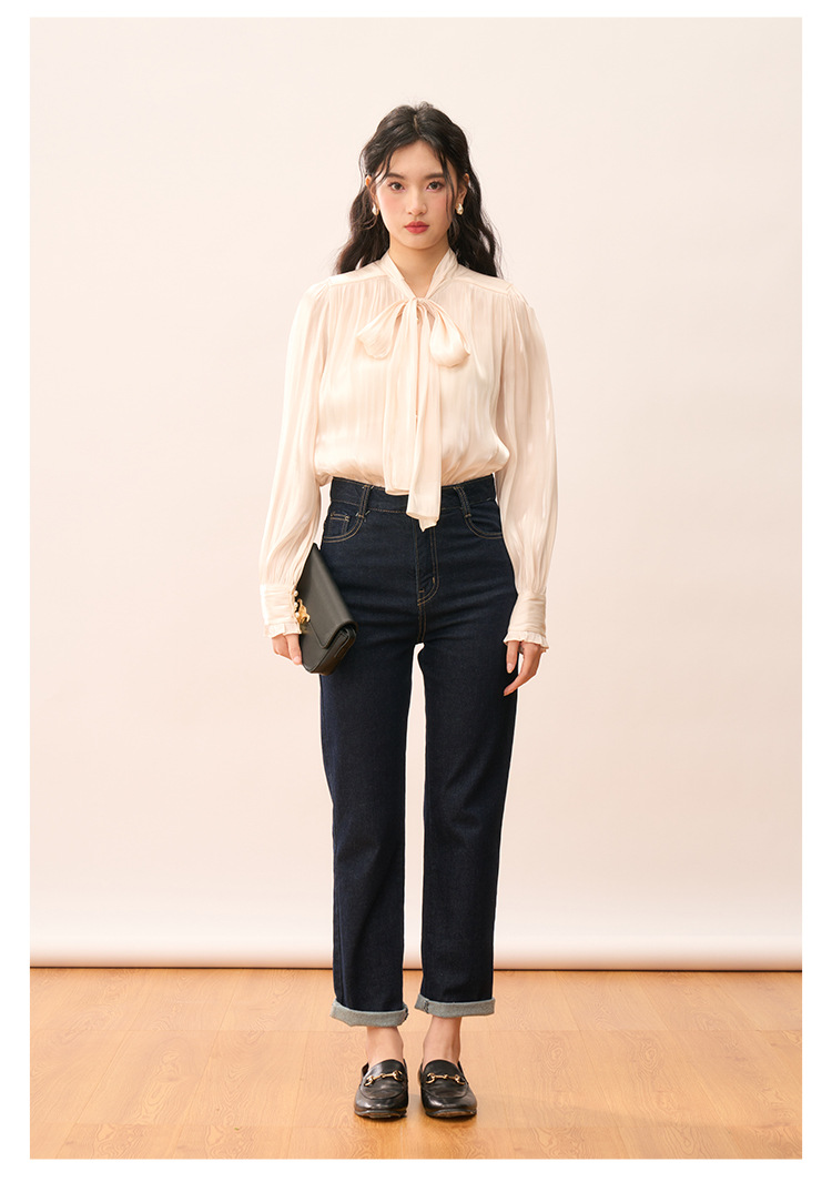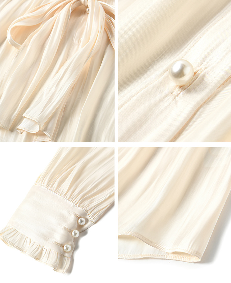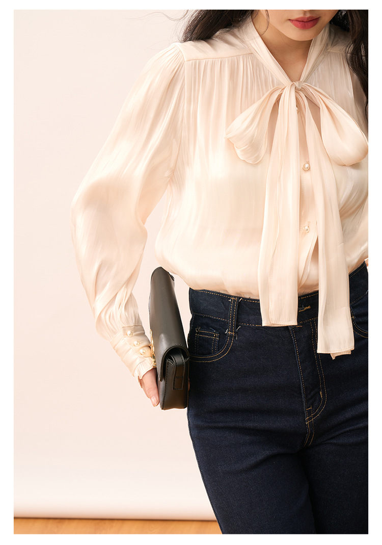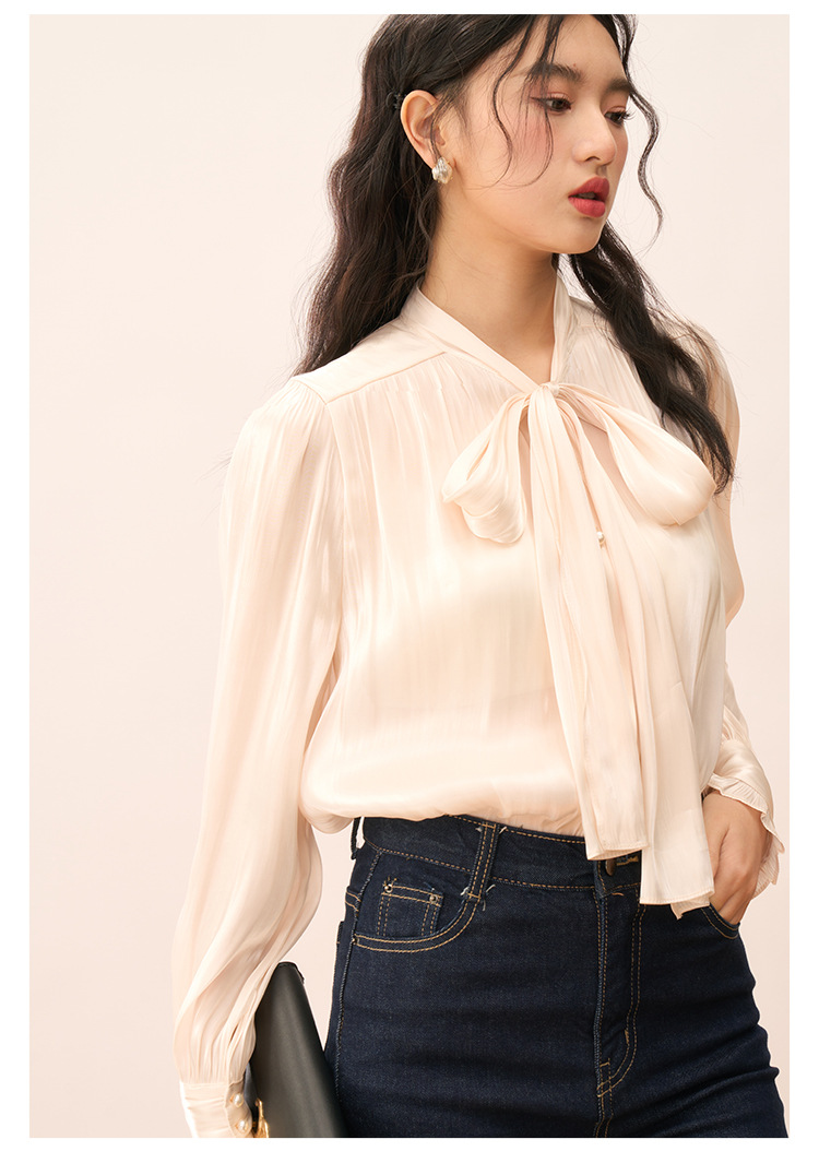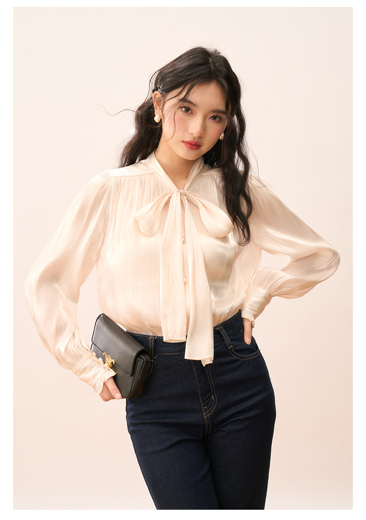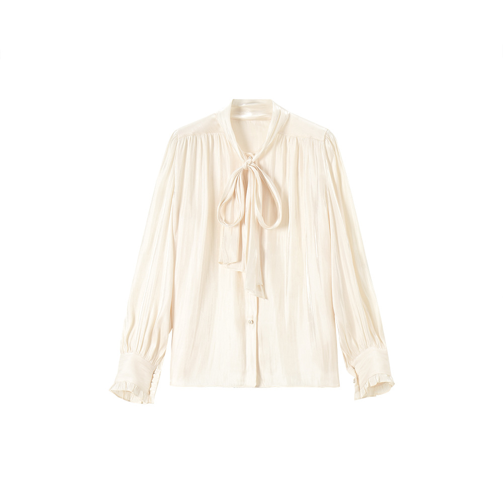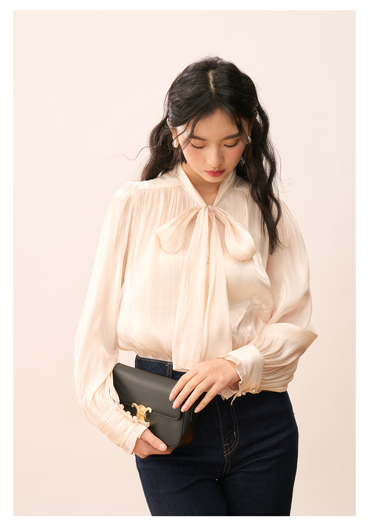 【盛都】봄 신상 프렌치 로맨틱 우아한 광택 리본 레이스업 출퇴근 캐주얼 셔츠