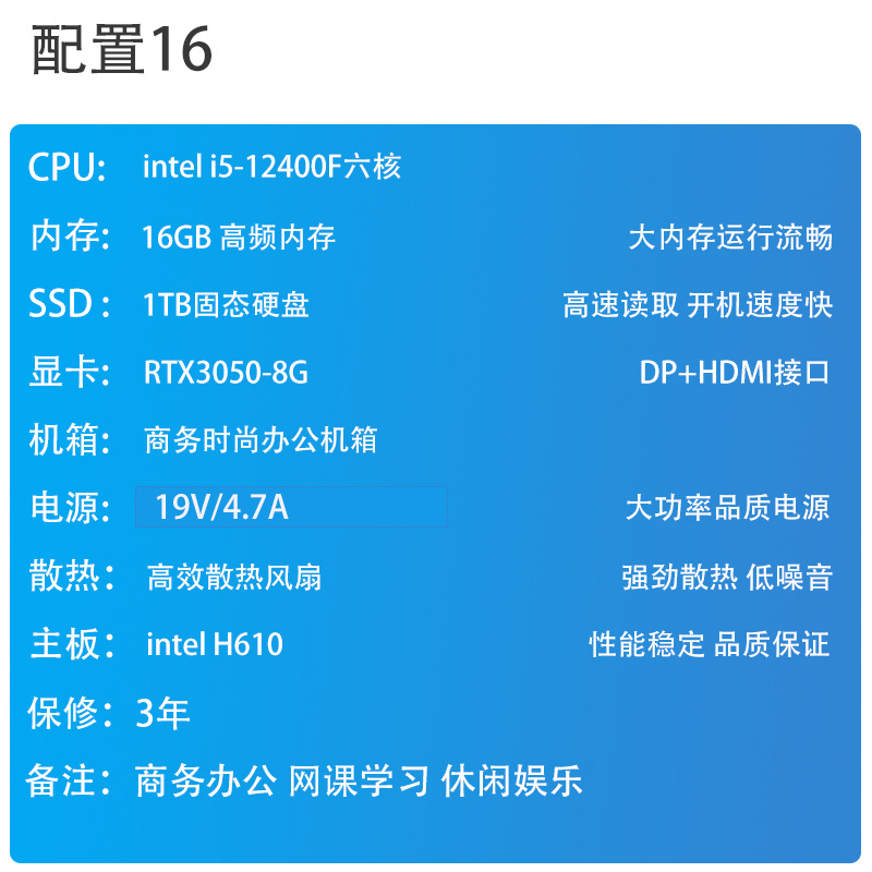 • 16:H610 마더 보드 i5/12400FCPU 16G 메모리 1T 솔리드 스테이트 3050/8G 그래픽 카드