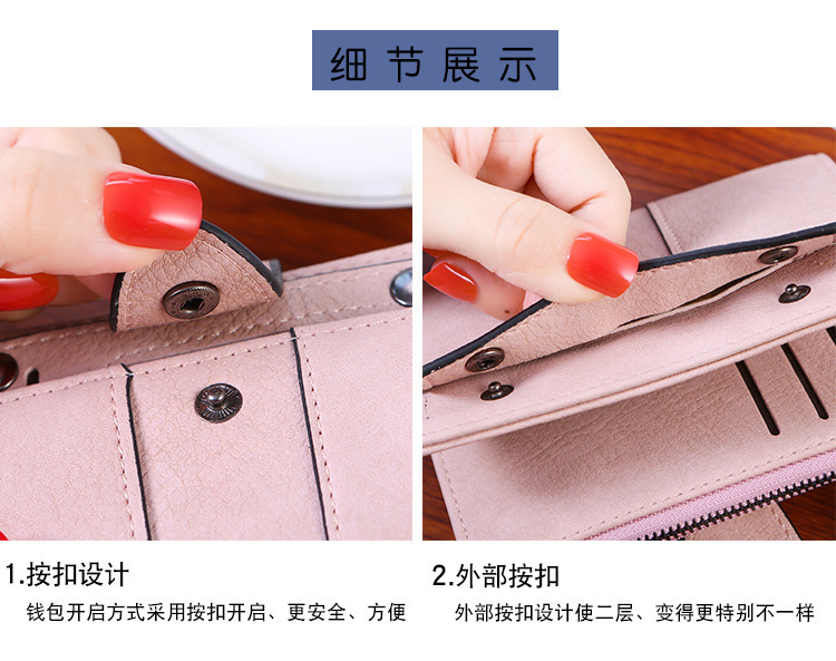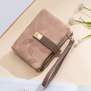 短款磨砂钱包亚马逊外贸复古叶子搭扣竖款拉链零钱包简约时尚皮夹