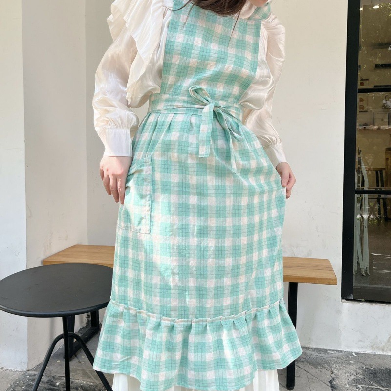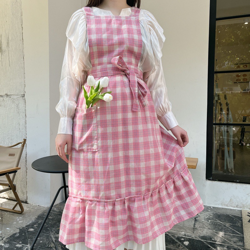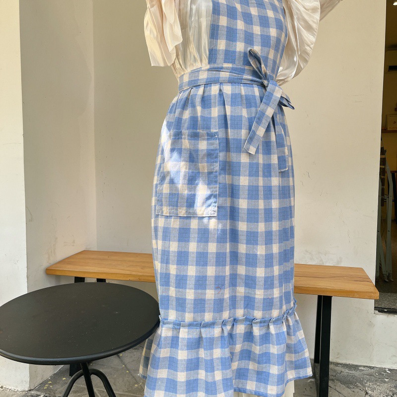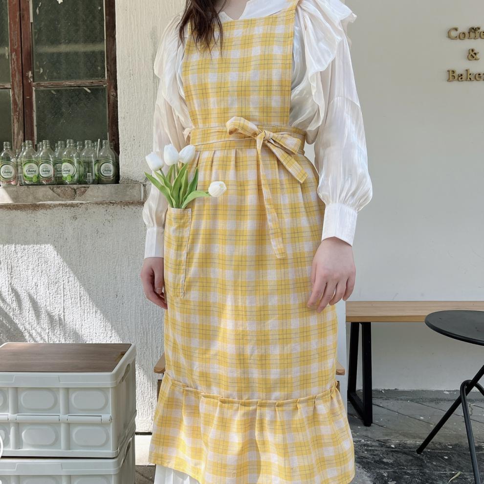 앞치마 인스 스튜디오 체크무늬 피쉬테일 플라워 아트 플리츠 문예 카페 아트 가든 작업복