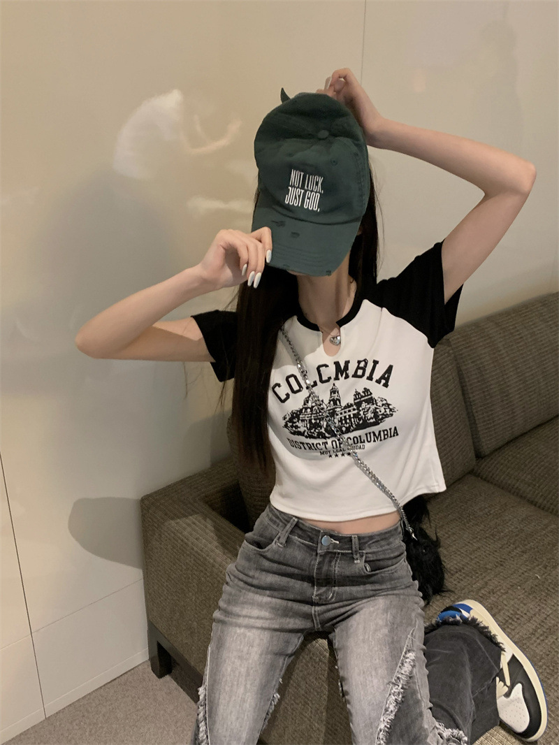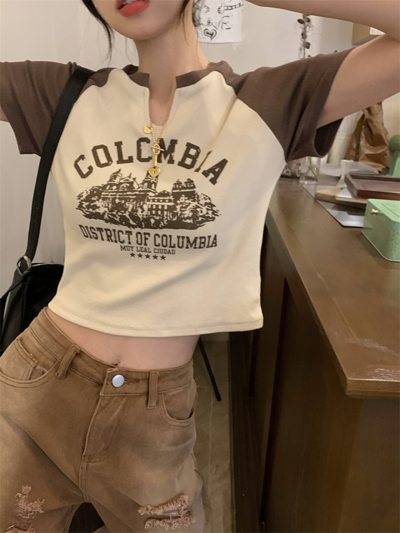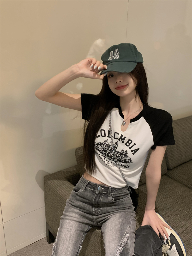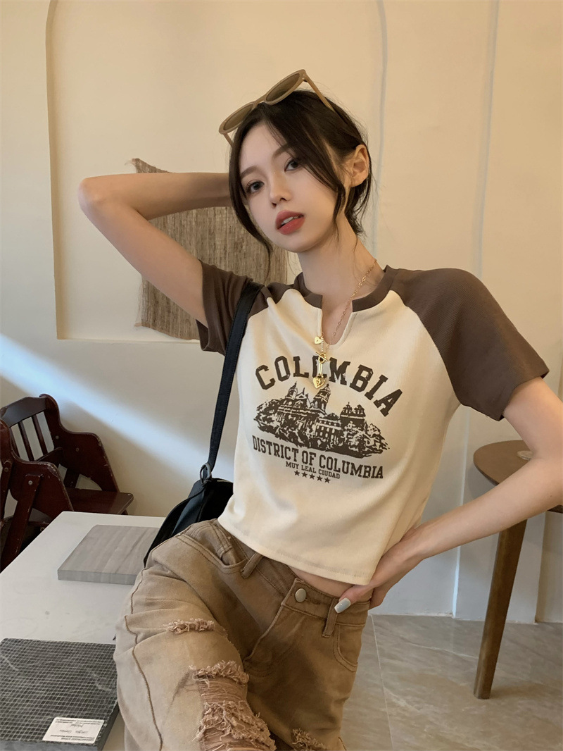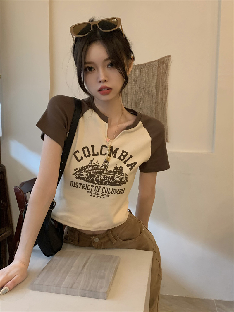 여름용 레이디스 브이넥 반팔 티셔츠 2025년 신상 달콤하고 매혹적인 아메리칸 레트로 디자인 짧은 학생용 상의 트렌디스토어 가기