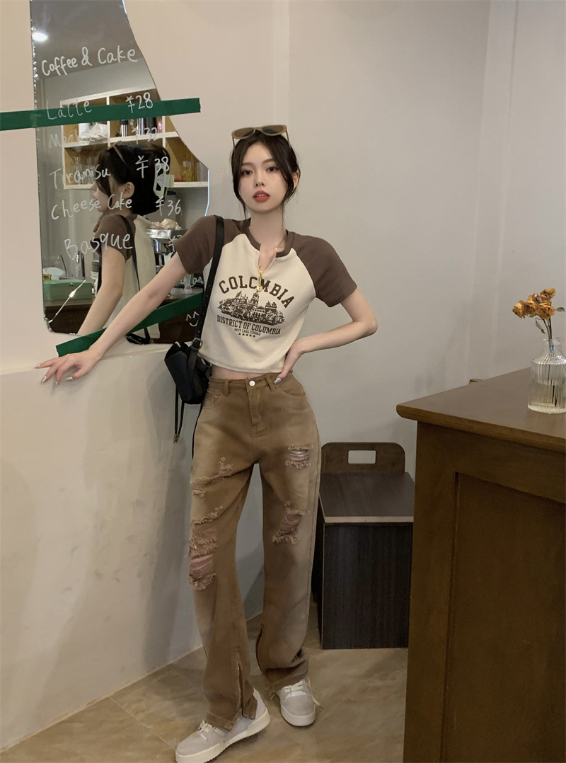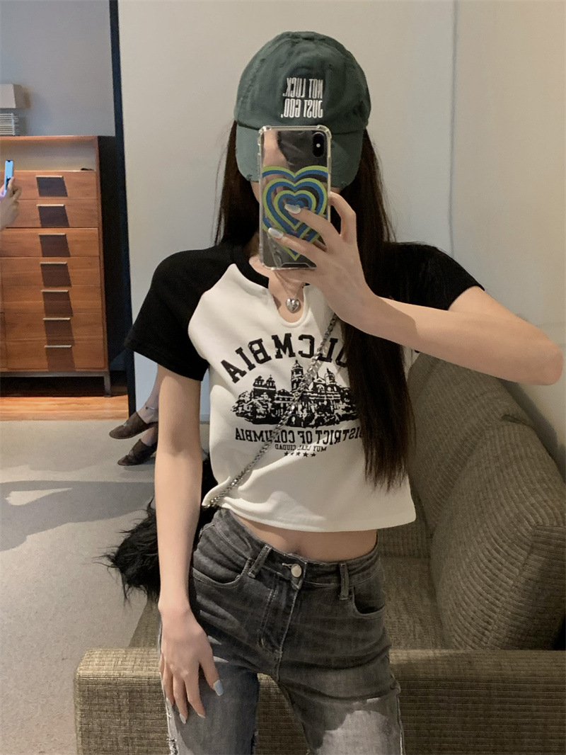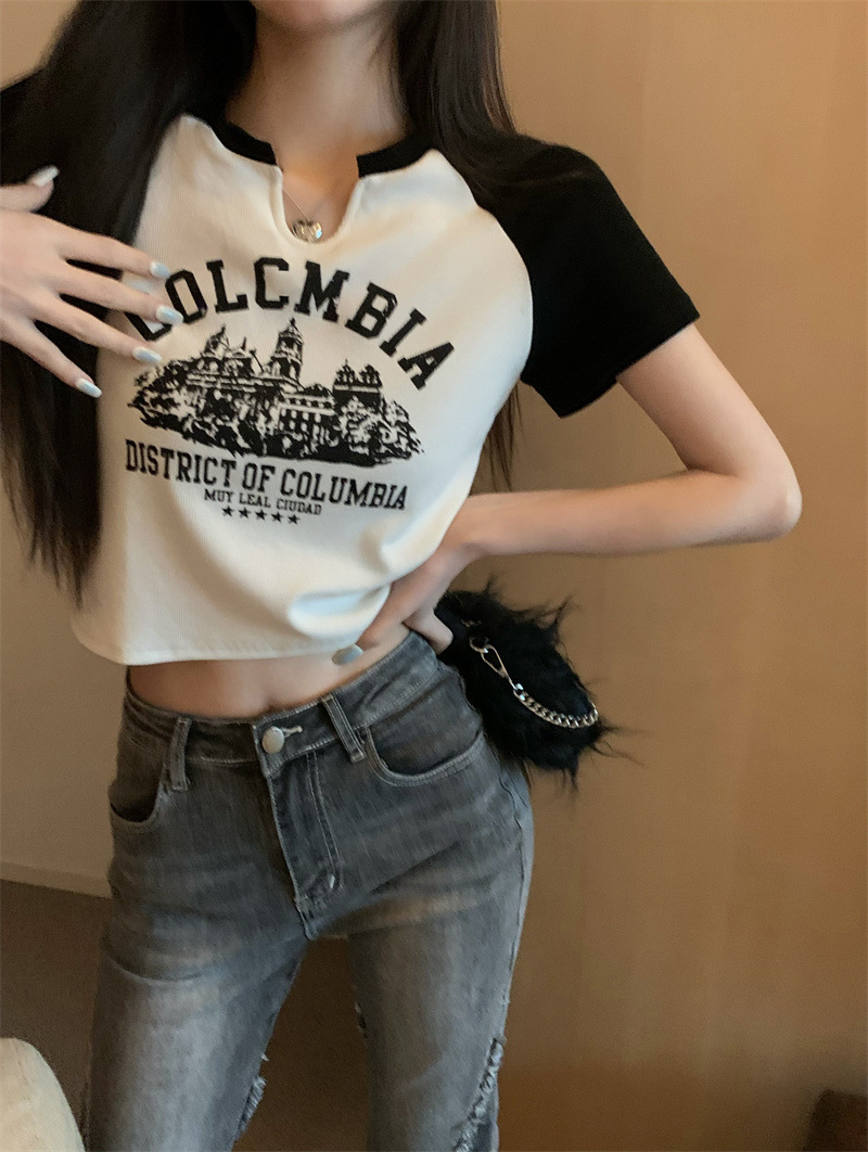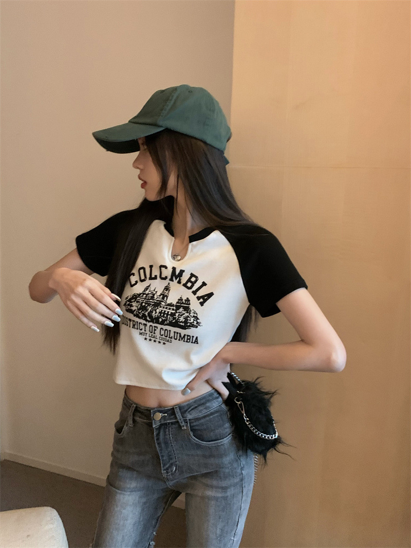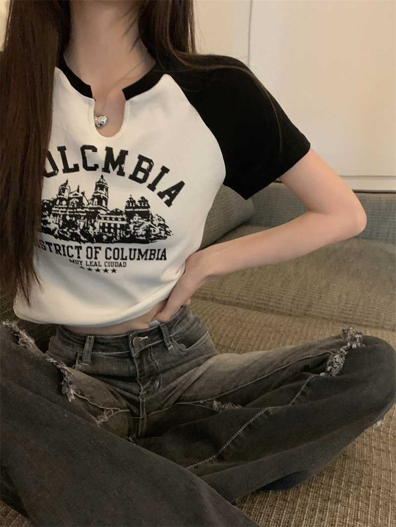 여름용 레이디스 브이넥 반팔 티셔츠 2025년 신상 달콤하고 매혹적인 아메리칸 레트로 디자인 짧은 학생용 상의 트렌디스토어 가기