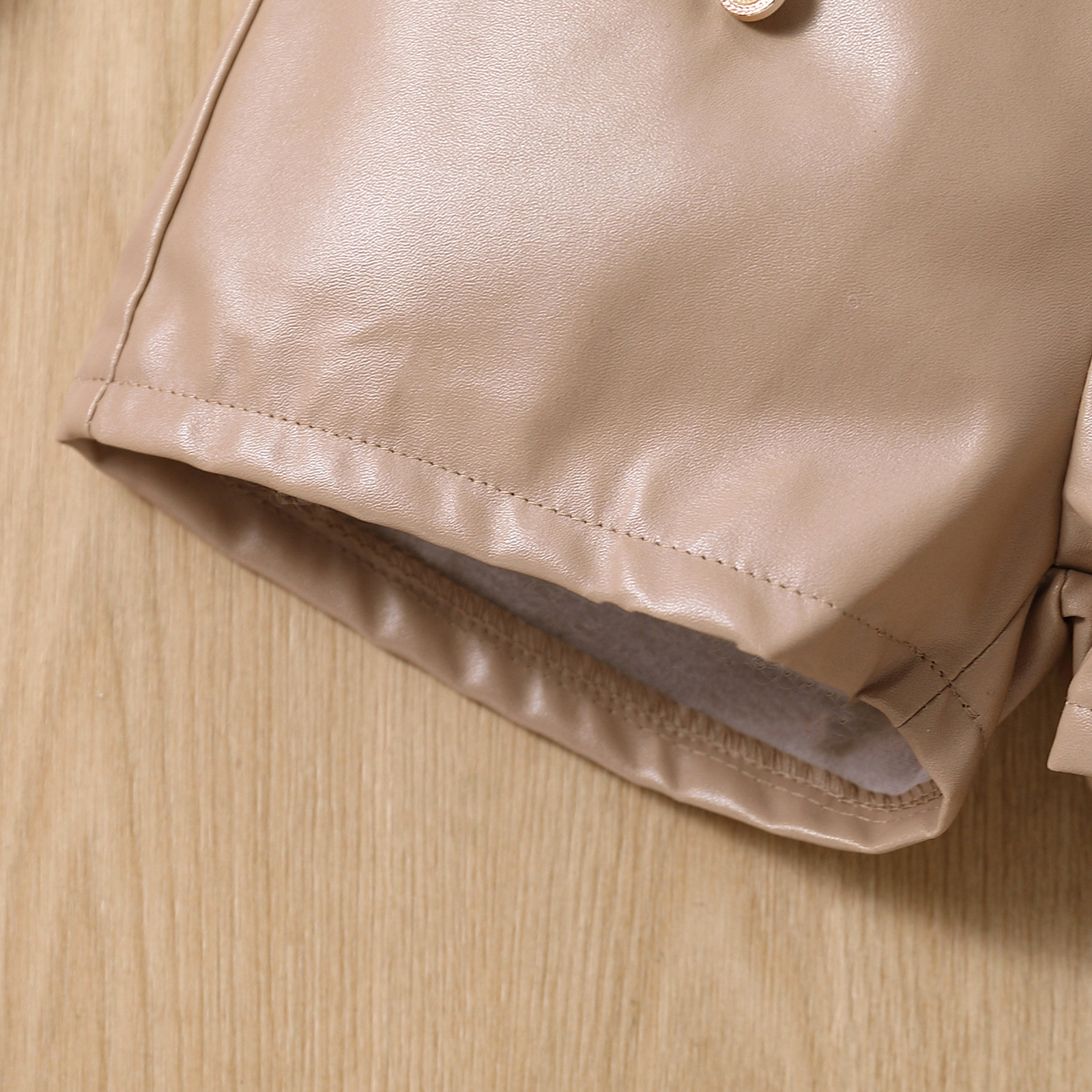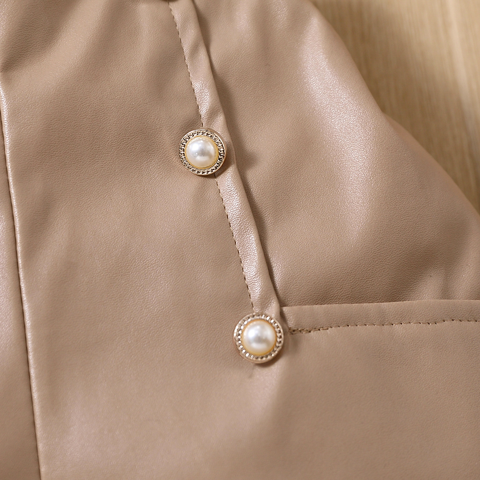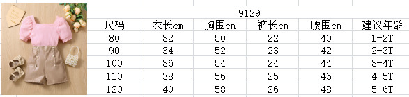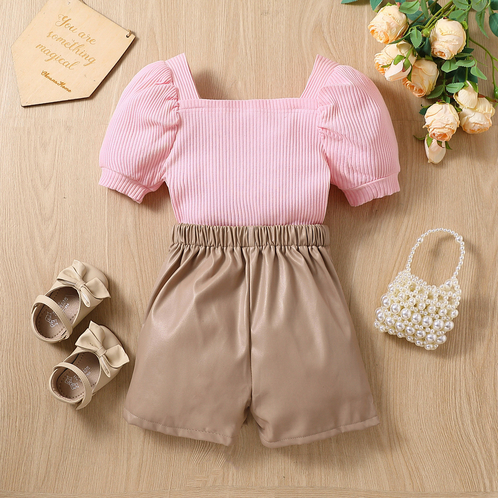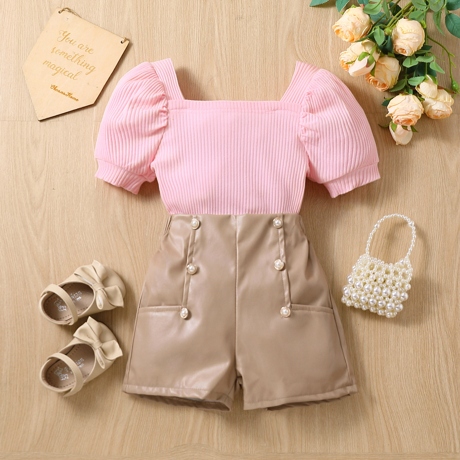 Baopin 아동복 유럽과 미국 새 여아 면 스퀘어 칼라 버블 반팔 탑 비드 포켓 얕은 카페 가죽 바지 세트