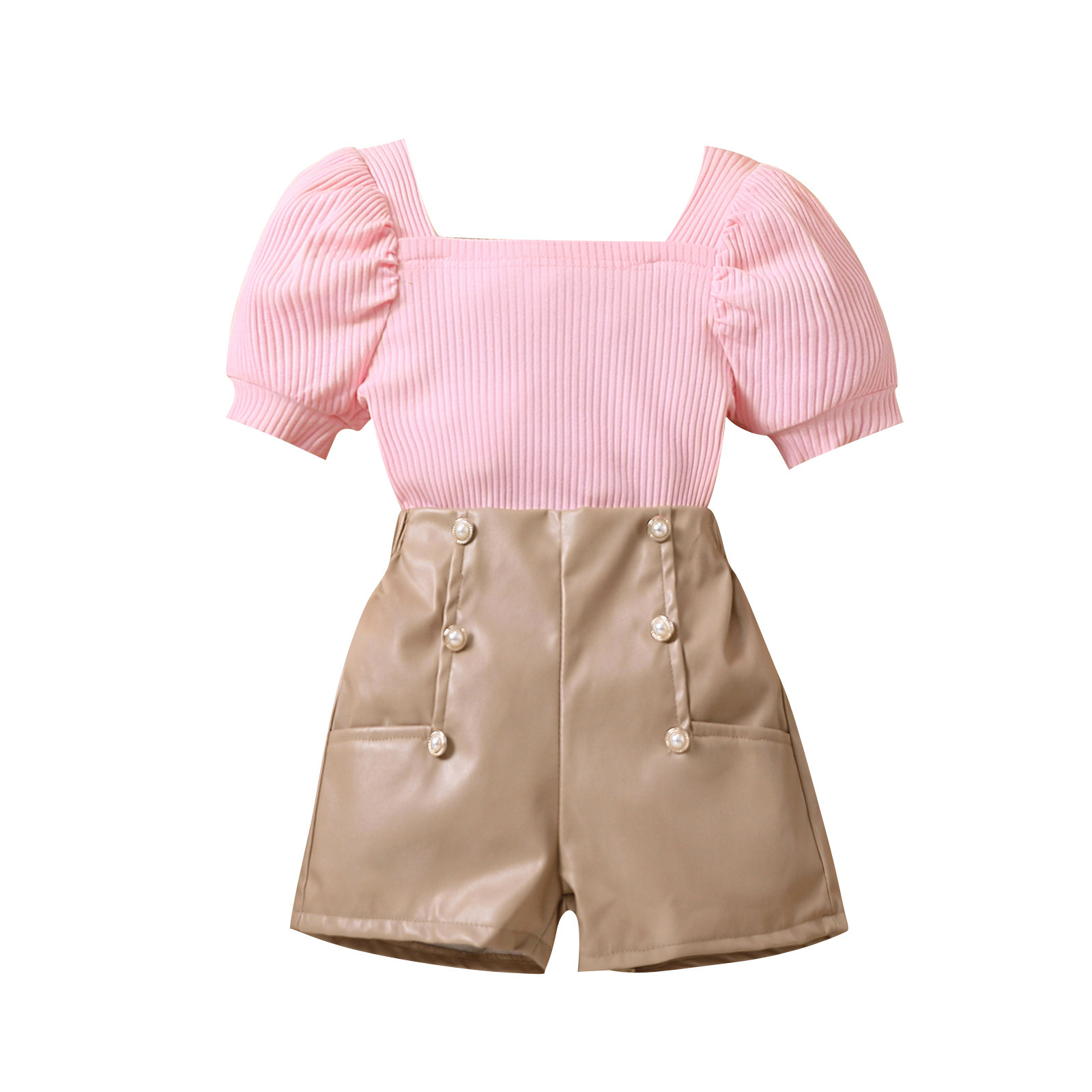 Baopin 아동복 유럽과 미국 새 여아 면 스퀘어 칼라 버블 반팔 탑 비드 포켓 얕은 카페 가죽 바지 세트스토어 가기