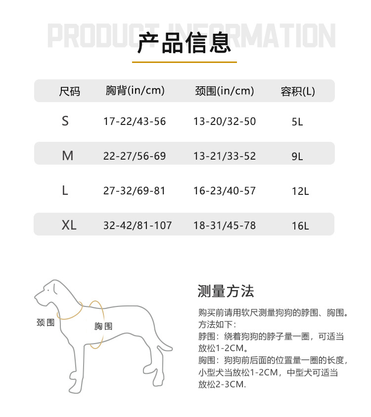 • XL: 가슴둘레 85-102cm, 목둘레 65-81cm, 용량 16L