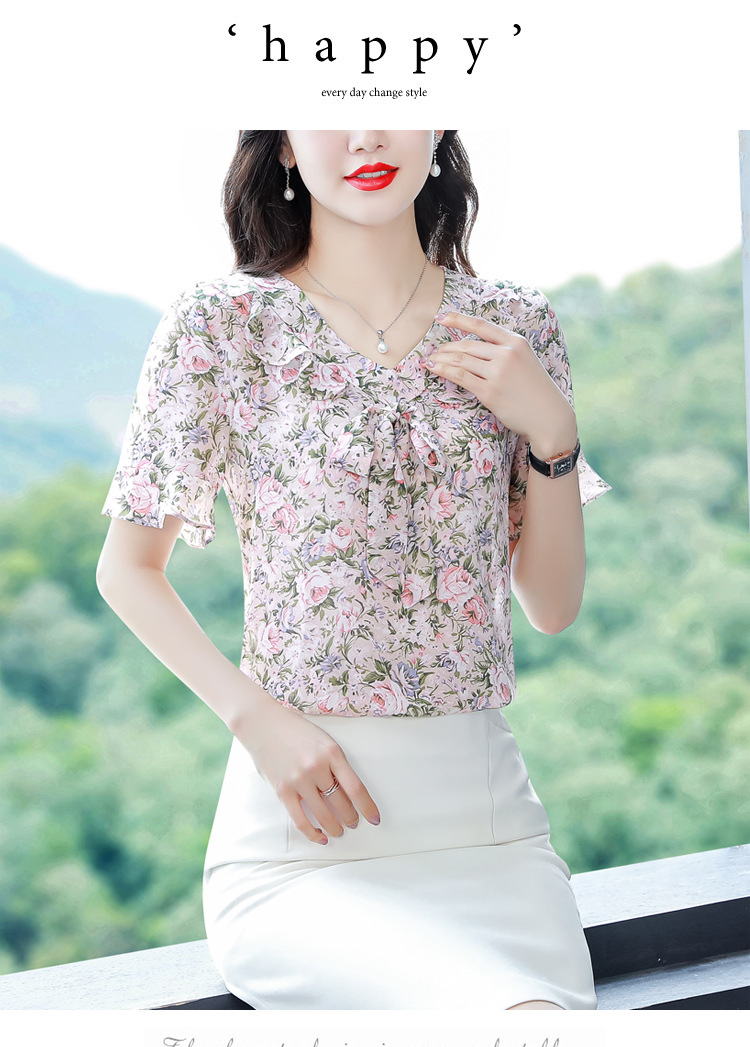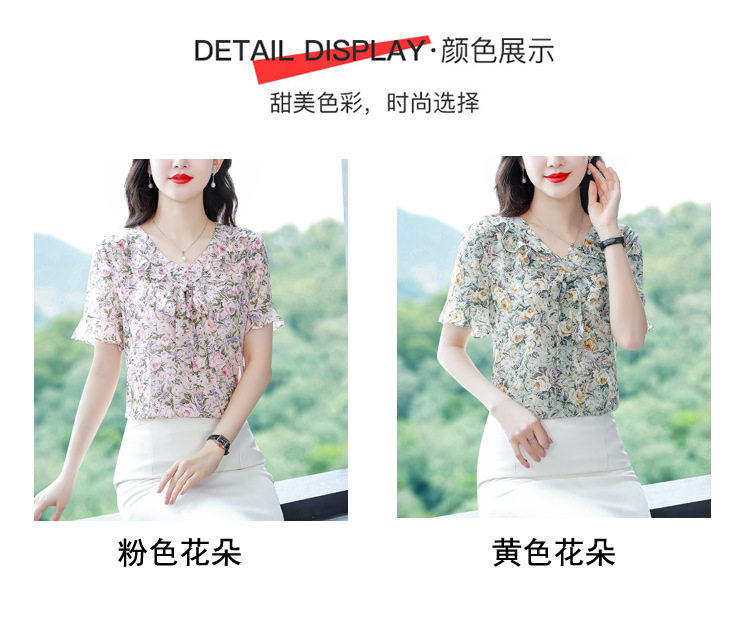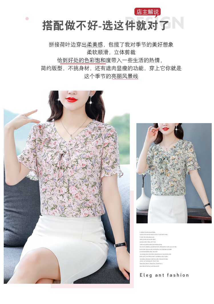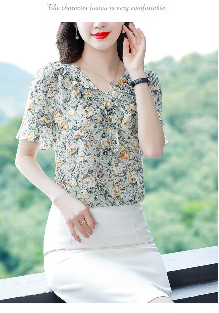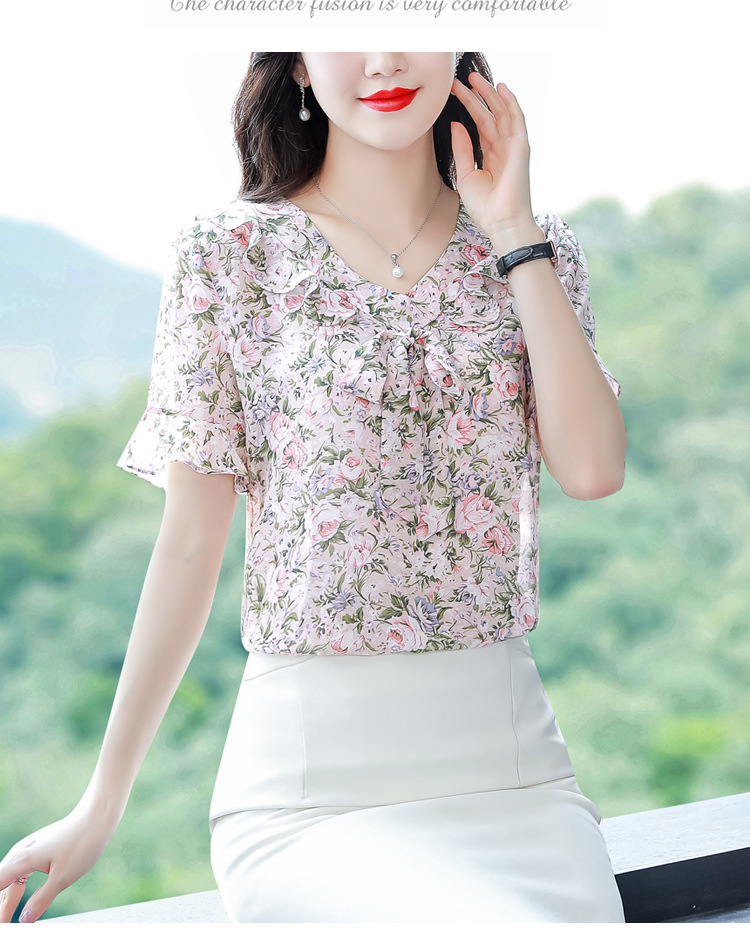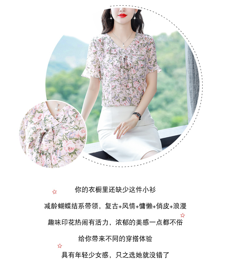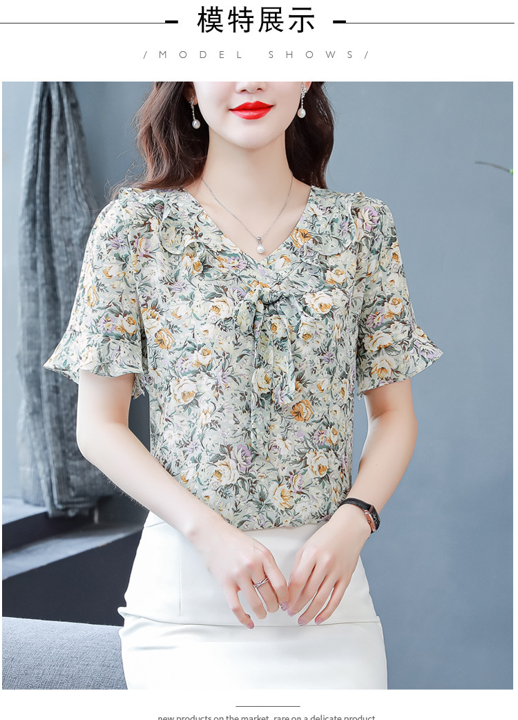 공장 직접 판매 여성을위한 꽃 무늬 작은 셔츠 여름 2024 새로운 다재다능한 서양 스타일 러플 짧은 소매 최고 쉬폰 셔츠스토어 가기