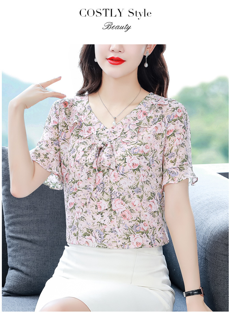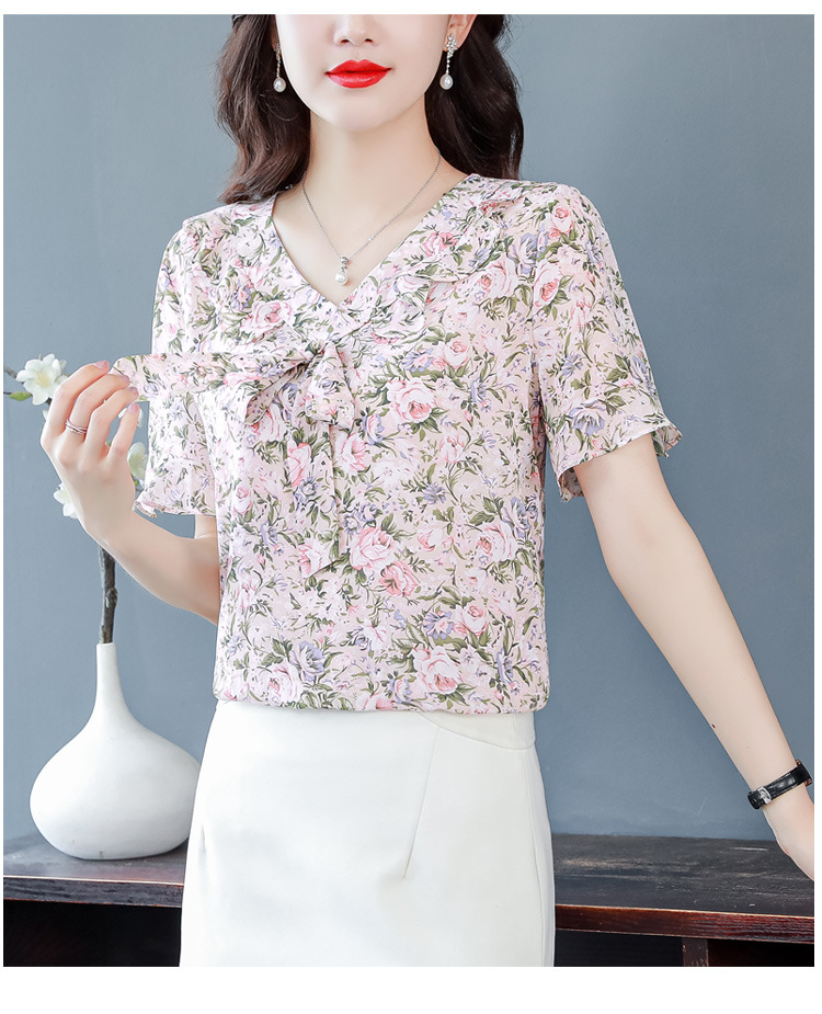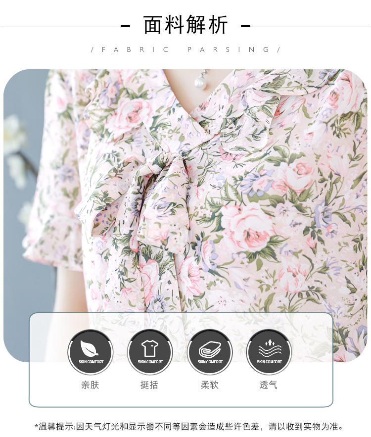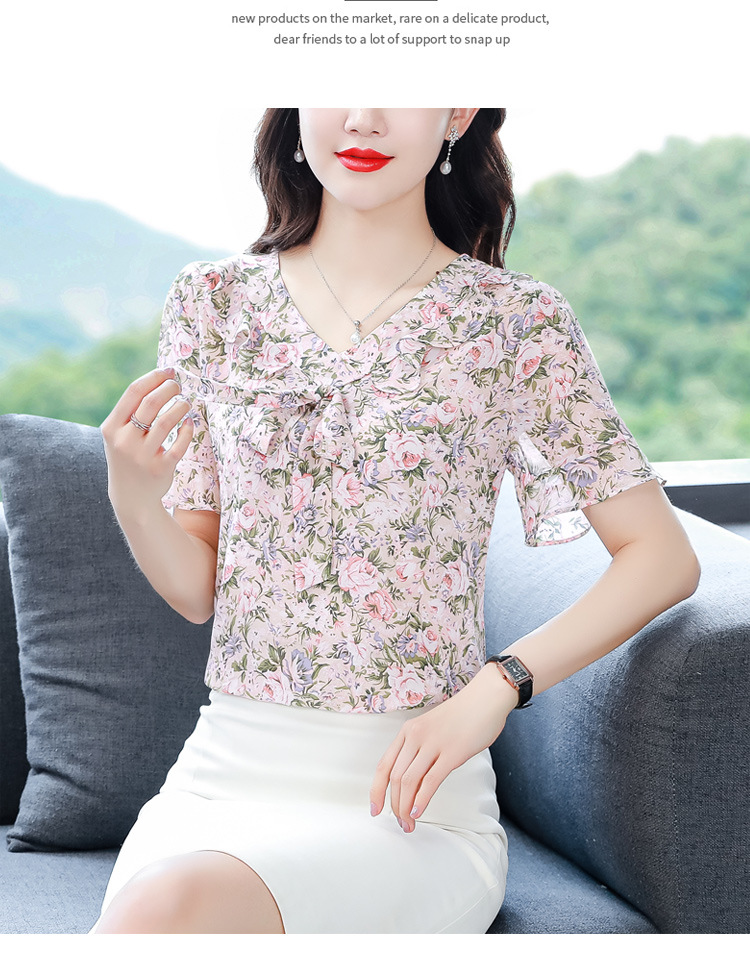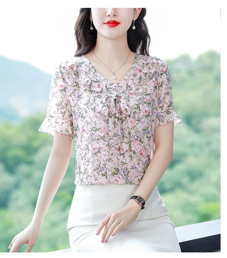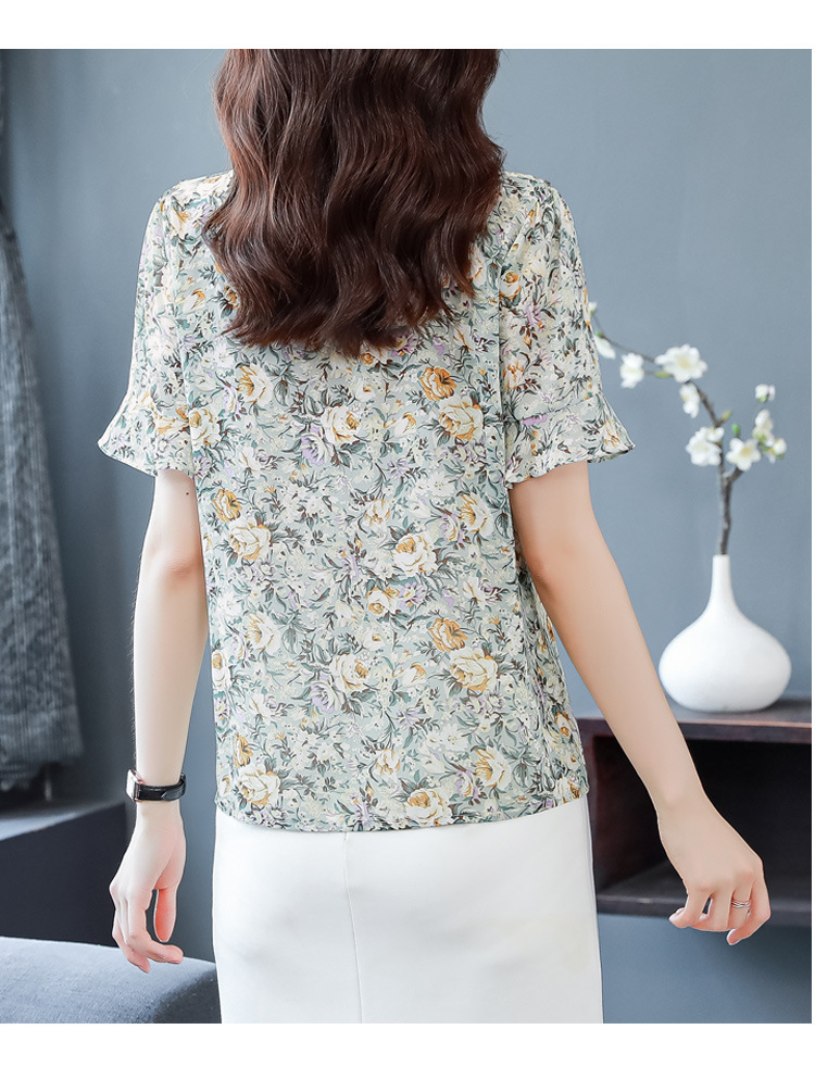 공장 직접 판매 여성을위한 꽃 무늬 작은 셔츠 여름 2024 새로운 다재다능한 서양 스타일 러플 짧은 소매 최고 쉬폰 셔츠스토어 가기