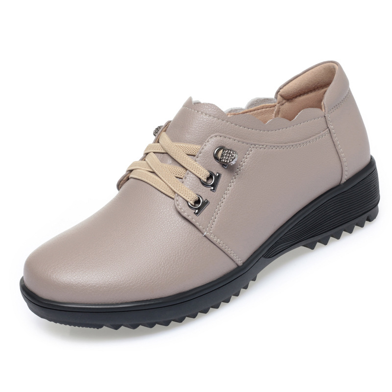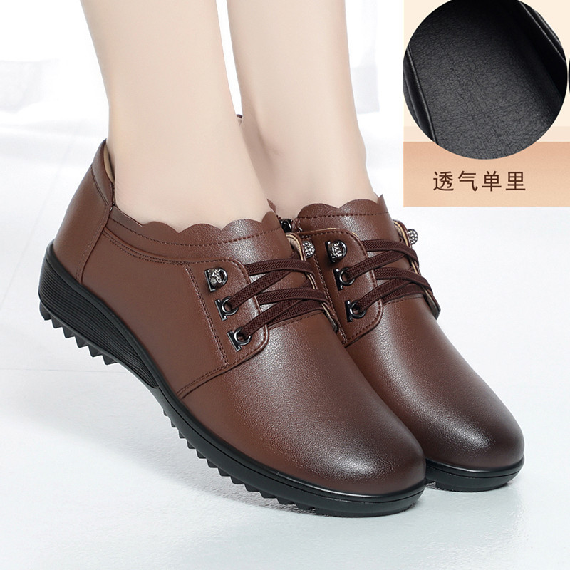 패션 새로운 정품 가죽 어머니 신발 단일 레이어 신발 봄과 가을 여성의 편안한 미끄럼 방지 부드러운 가죽 부드러운 바닥 기모 중년 및 노인 여성 신발