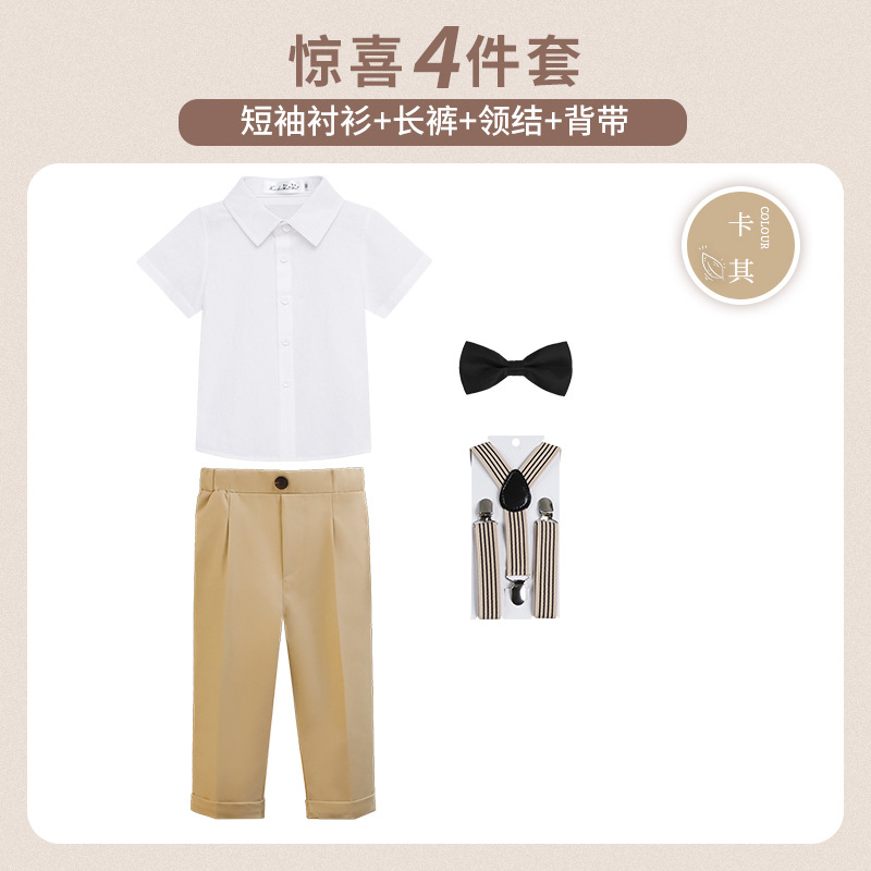 • 카키색 반팔 4종 세트 (반팔 셔츠 + 긴바지 + 멜빵 + 보타이)