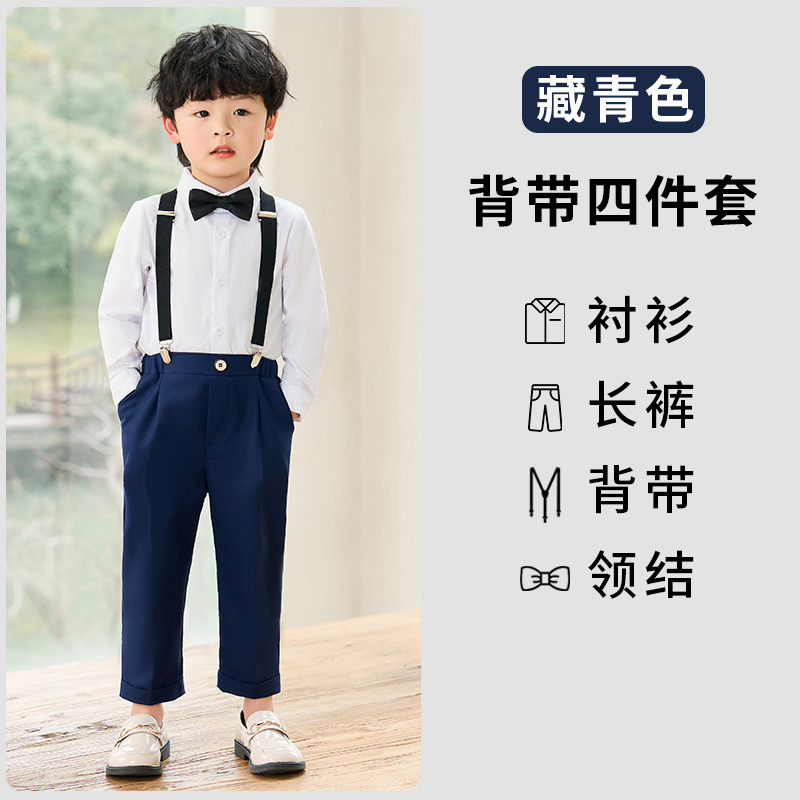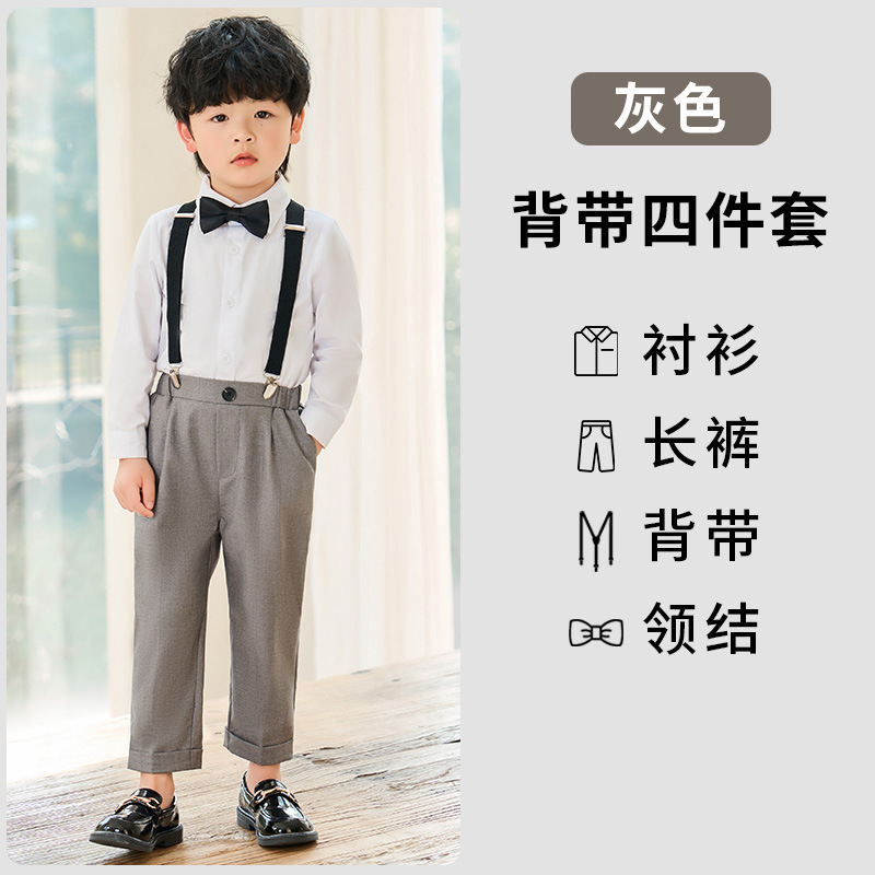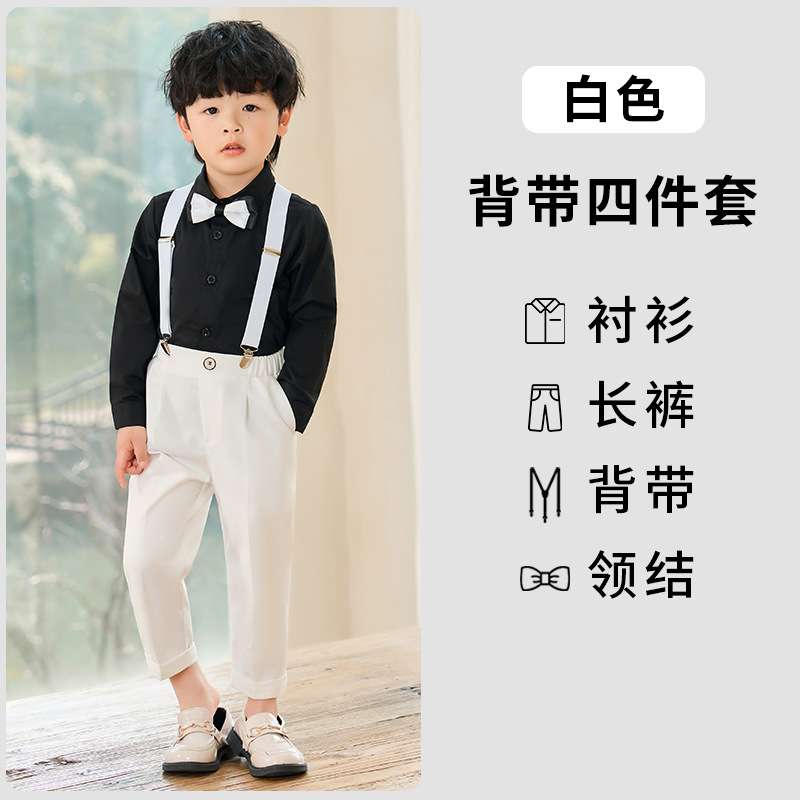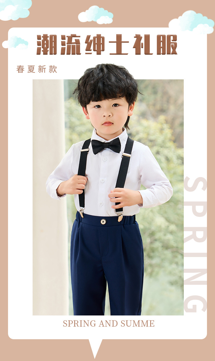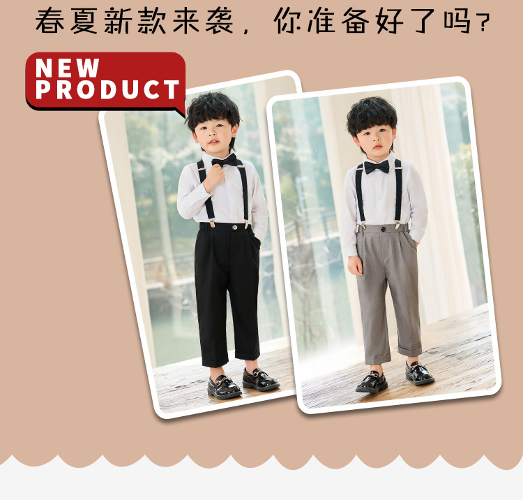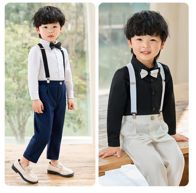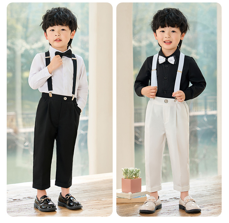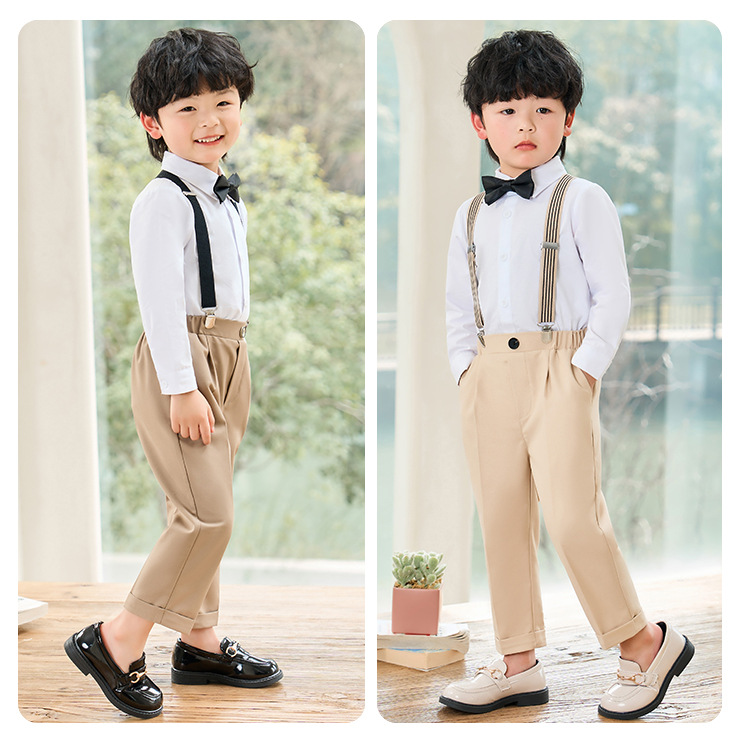 어린이 원피스 봄과 여름 한국어 단색 멜빵 바지 소년 캐주얼 셔츠 세트 아기 생일 사진 옷