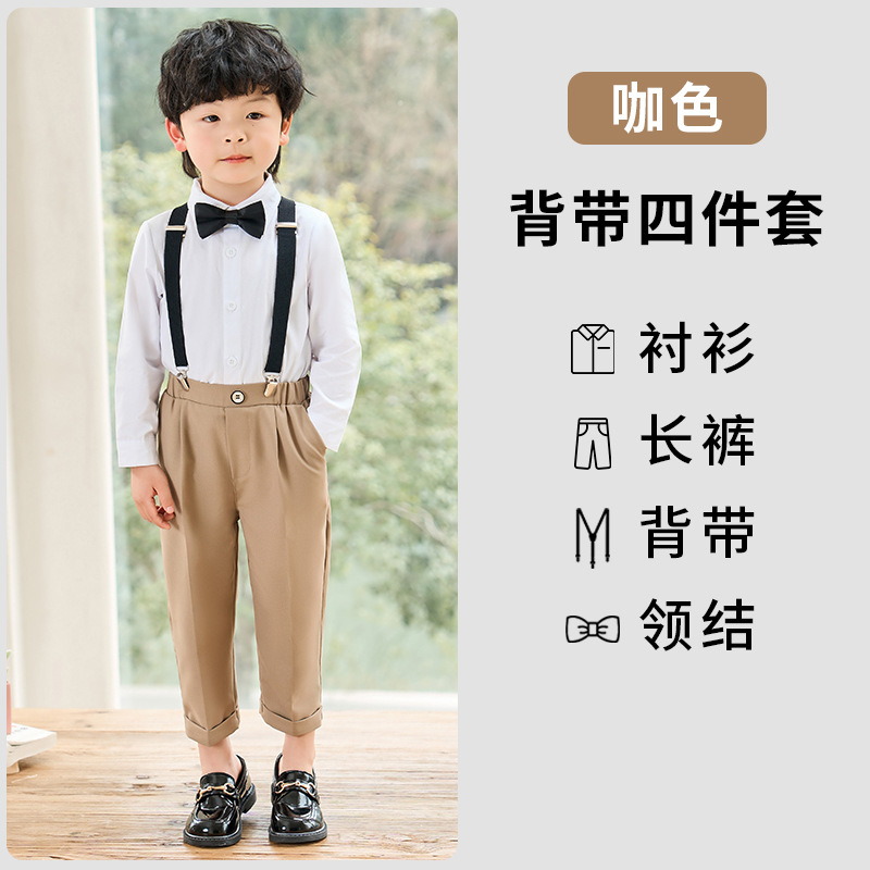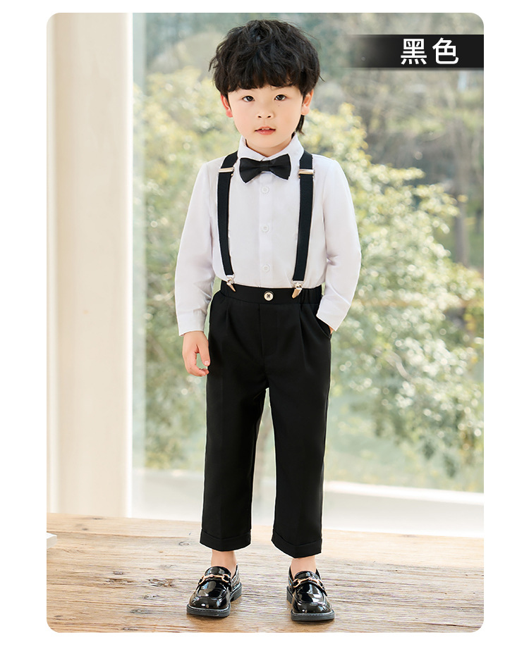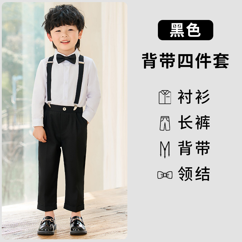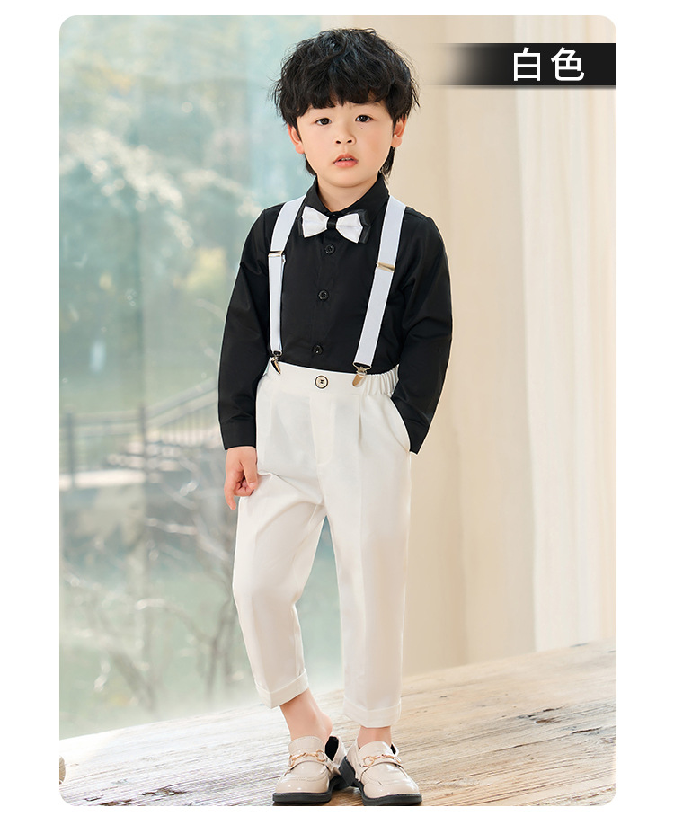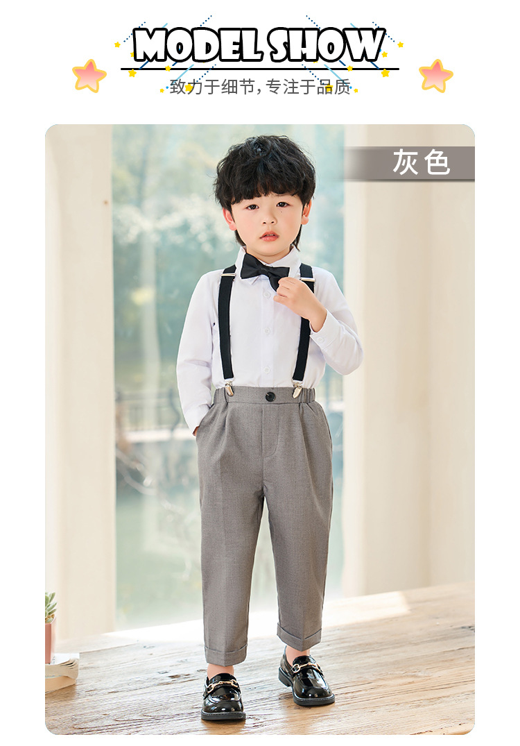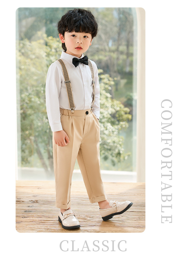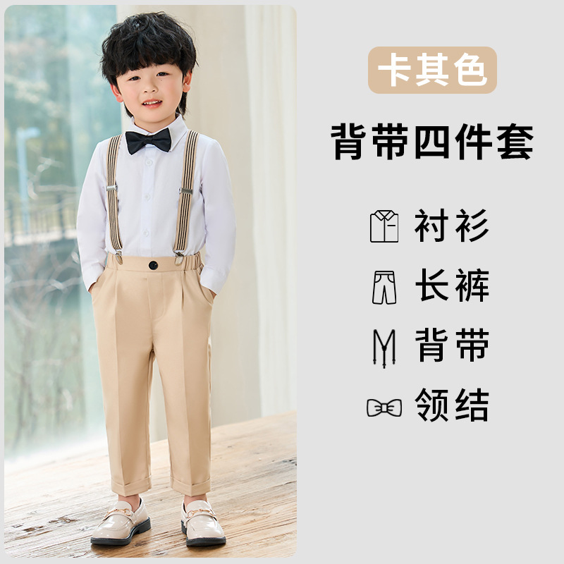 어린이 원피스 봄과 여름 한국어 단색 멜빵 바지 소년 캐주얼 셔츠 세트 아기 생일 사진 옷