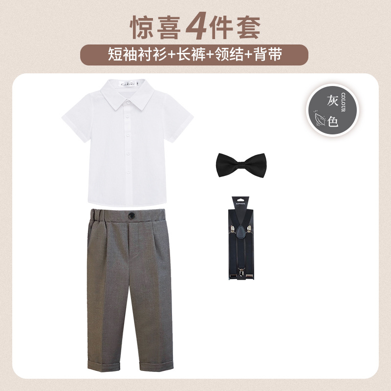 • 회색 반팔 4종 세트 (반팔 셔츠 + 긴바지 + 멜빵 + 보타이)