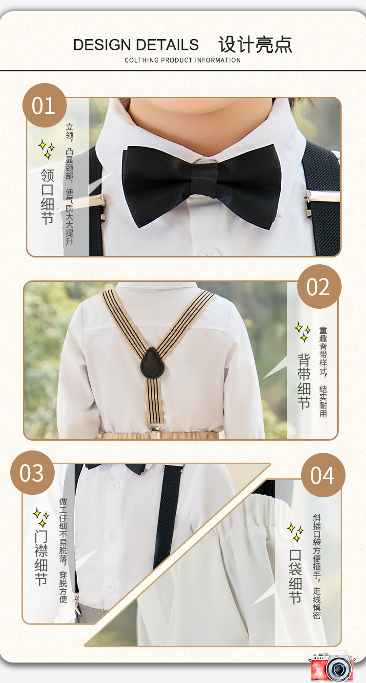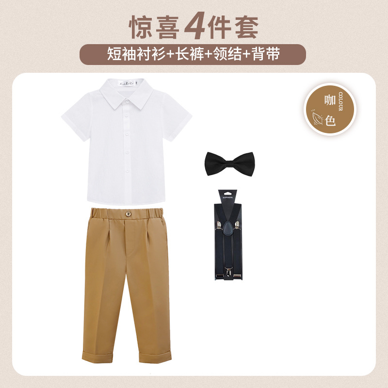 • 카멜 색상 반팔 4종 세트 (반팔 셔츠 + 긴 바지 + 멜빵 + 보타이)
