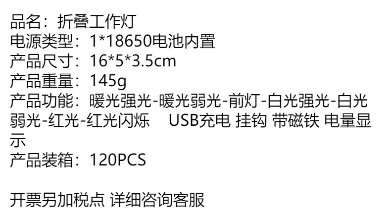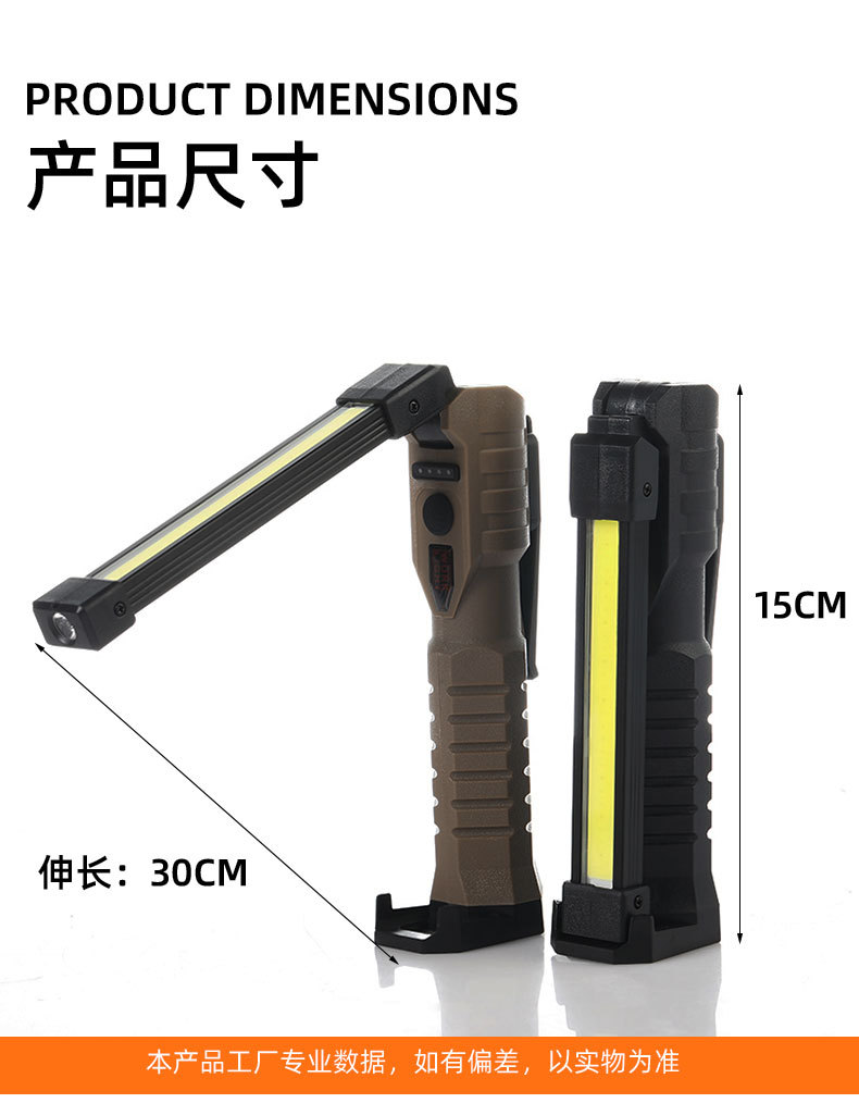 강력한 빛 손전등, 매우 밝은 COB 접이식 작업등, 충전식 휴대용 후크, 자석 부착 점검등, 적색 경고등