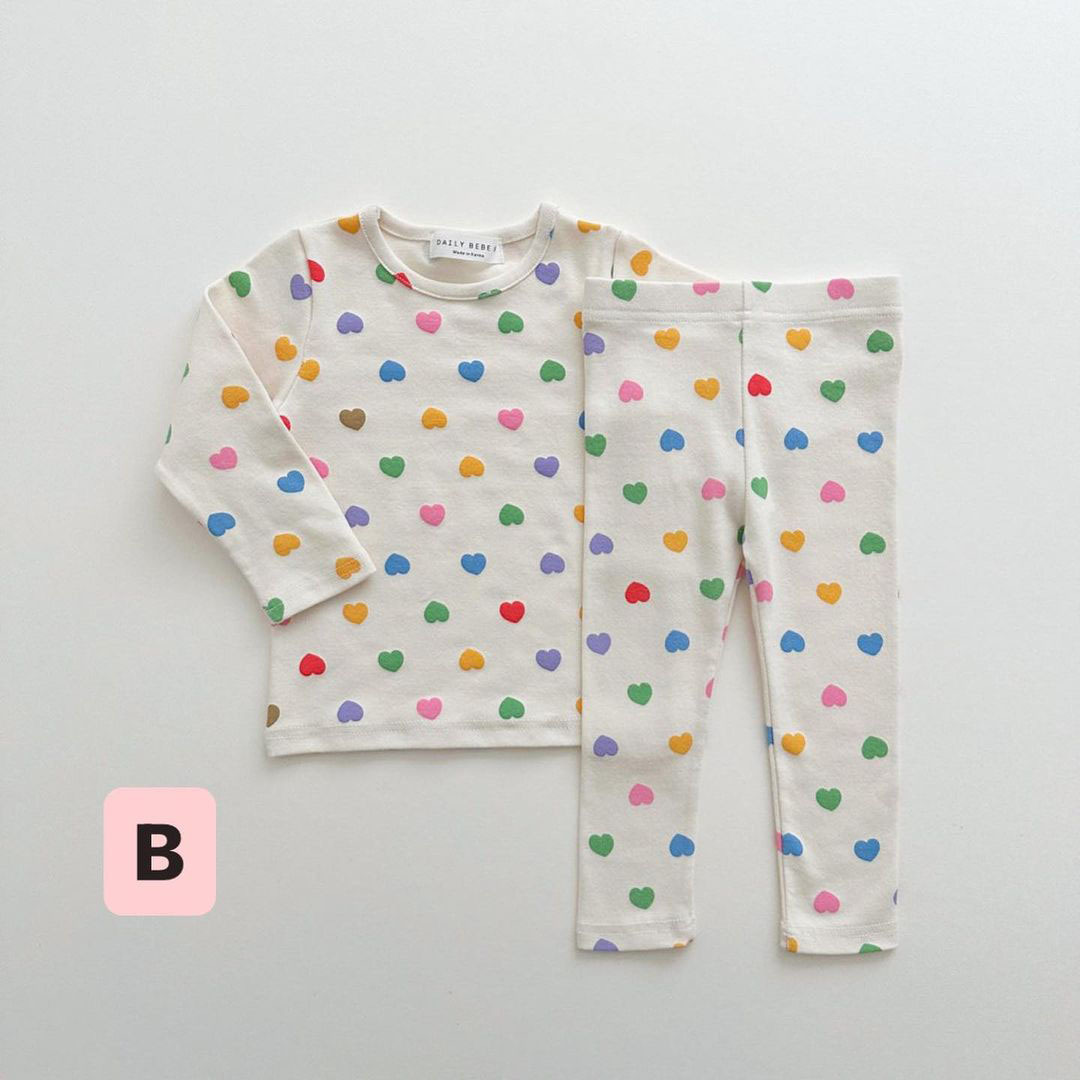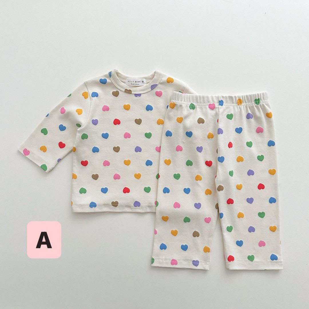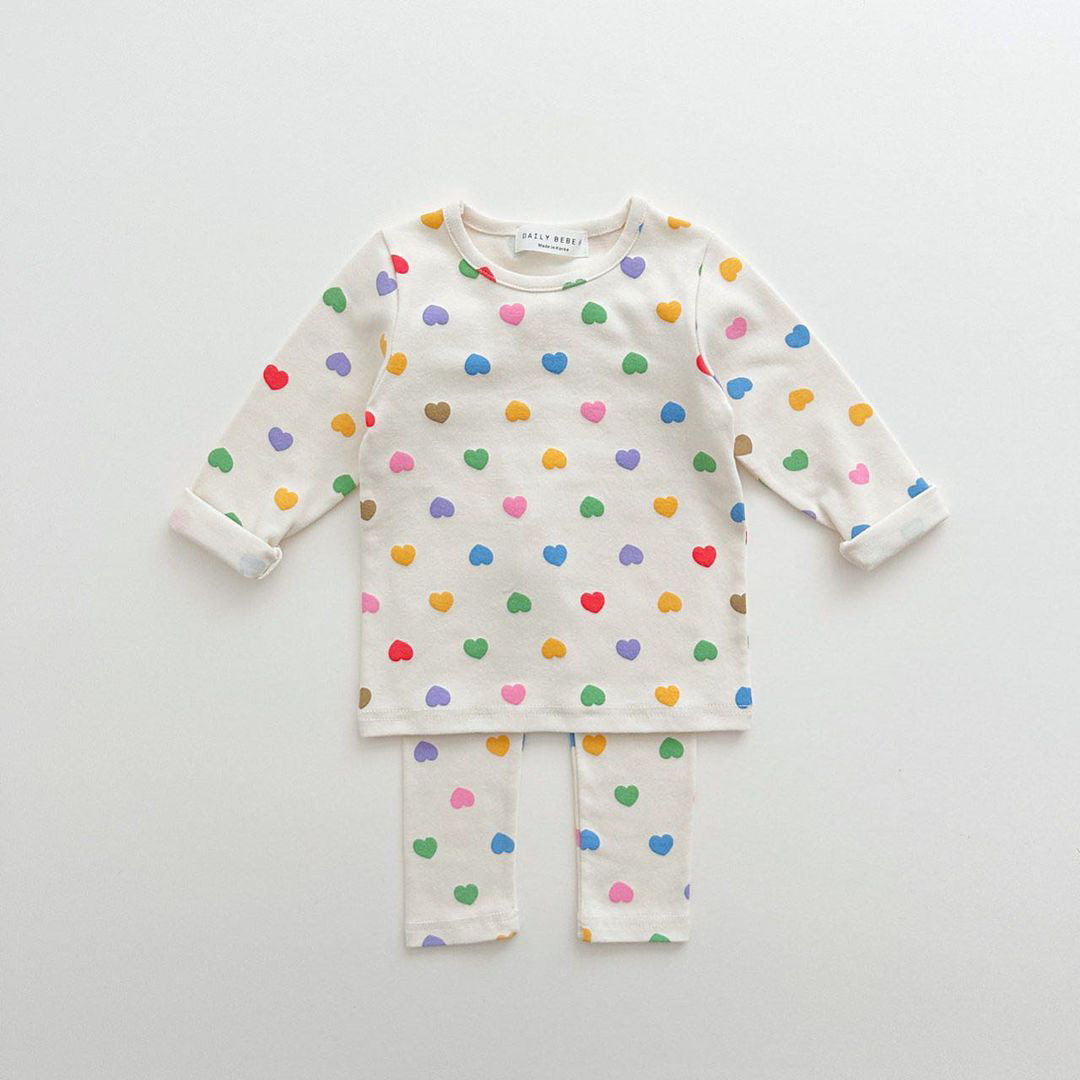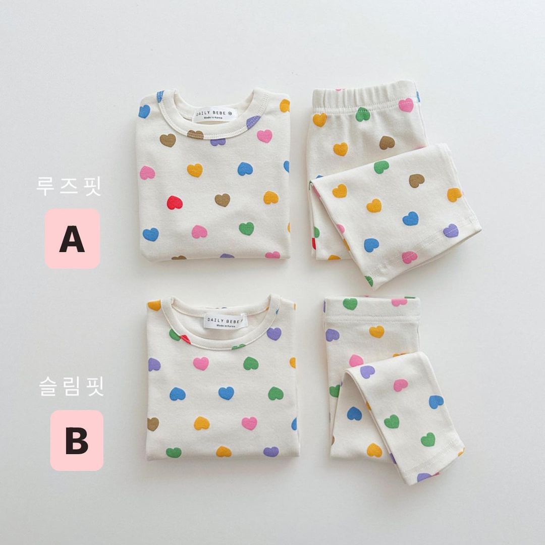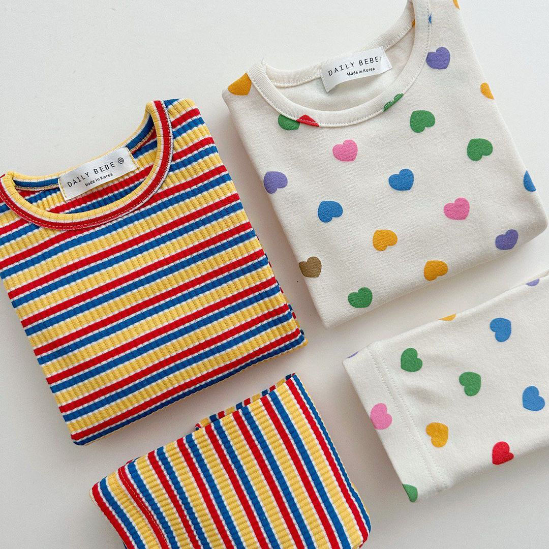 2025 신제품 한국판 봄여름 여아 AB형 아기 컬러풀 하트 홈웨어 세트 크롤링복스토어 가기