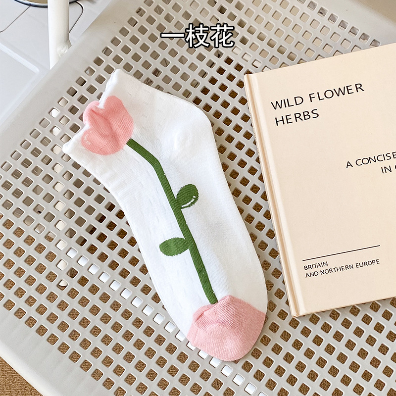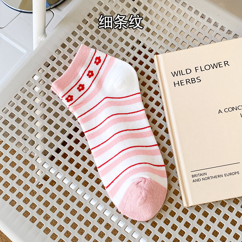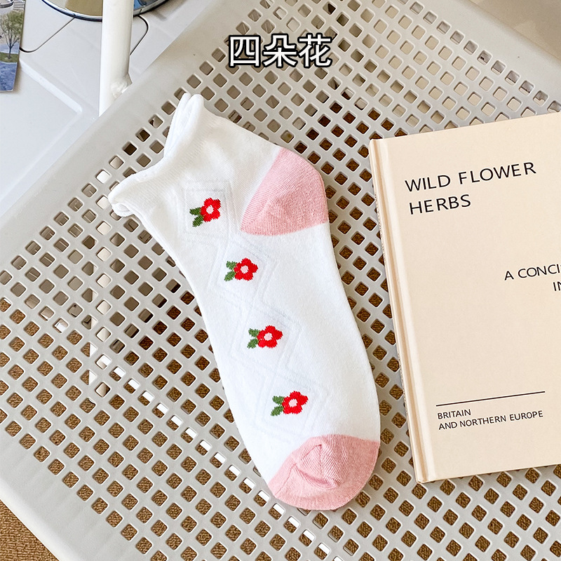 양말 여성용 봄과 여름 핑크 대학 스타일 여성용 보트 양말 컬러 매칭 짧은 튜브 플로렛 여성용 양말 여성용 면 땀 흡수 양말
