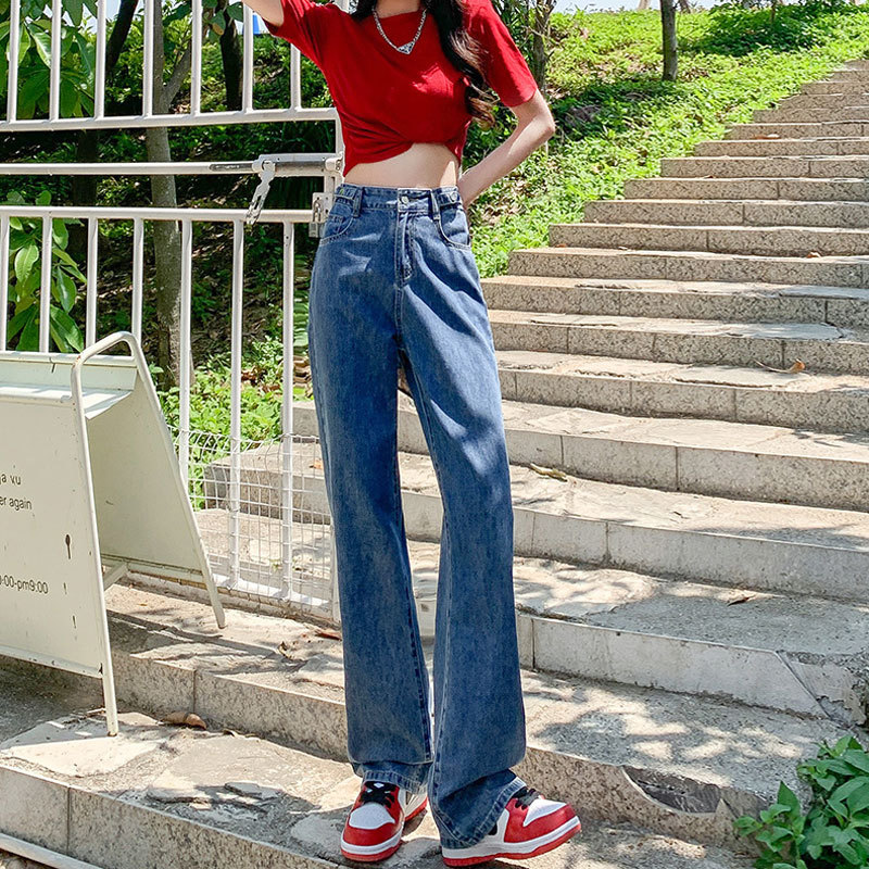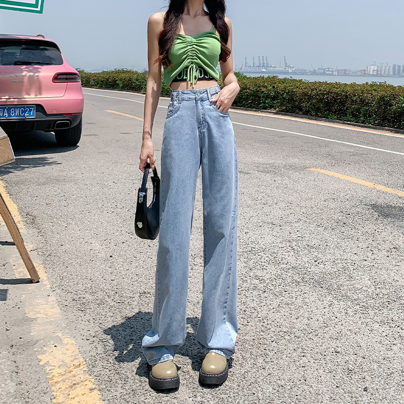 한국식 조절 가능한 하이 웨이스트 청바지 여성용 배 모양의 느슨한 디자인 센스 세련된 스타일 와이드 레그 스트레이트 팬츠