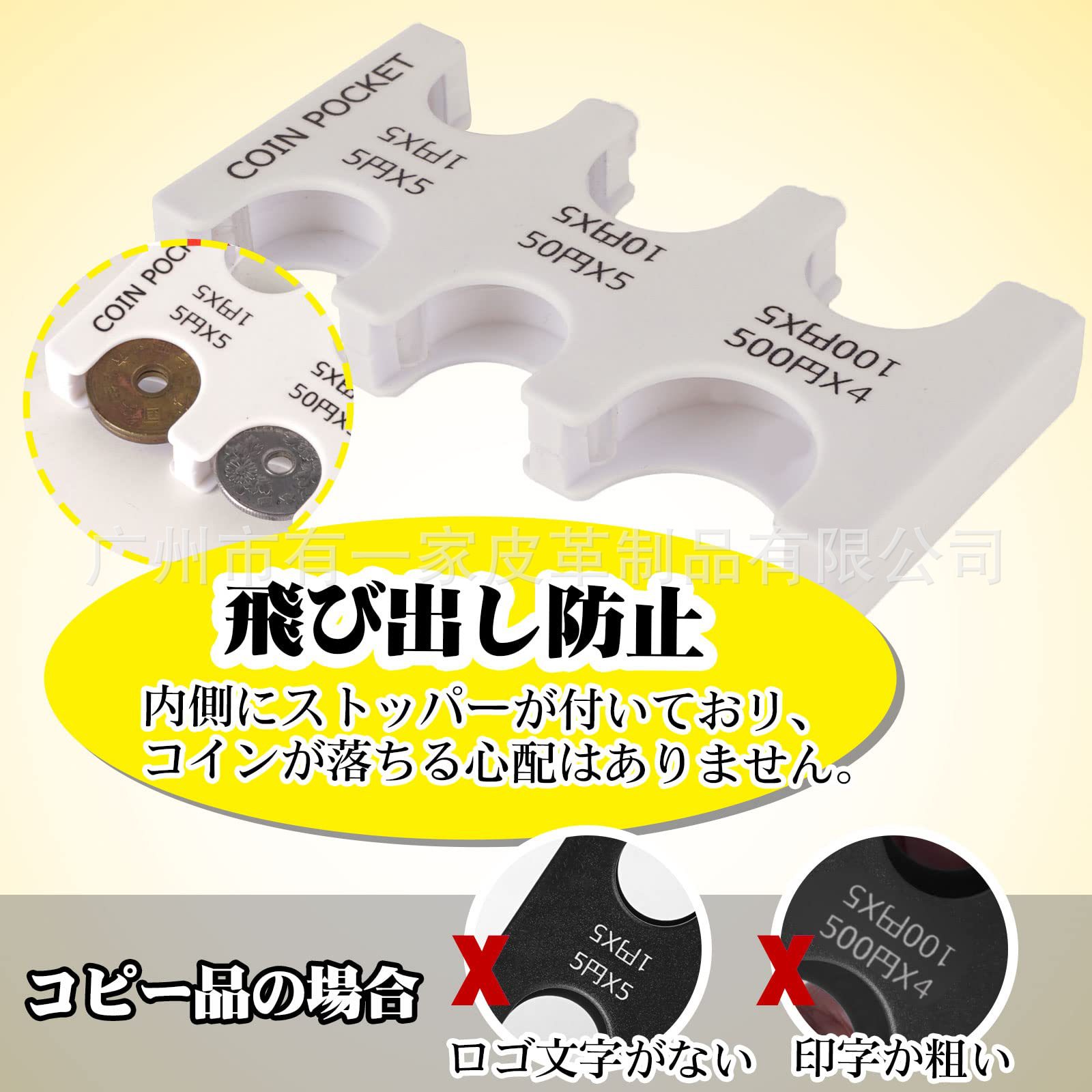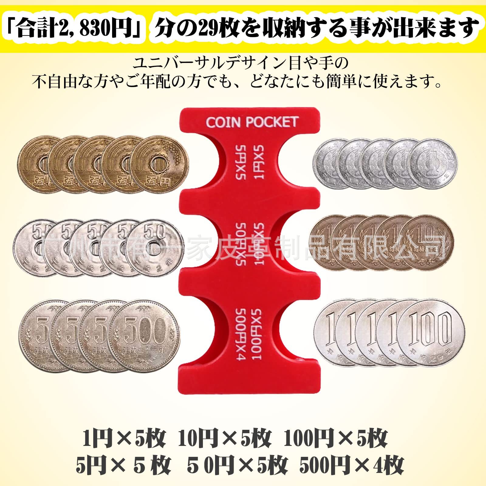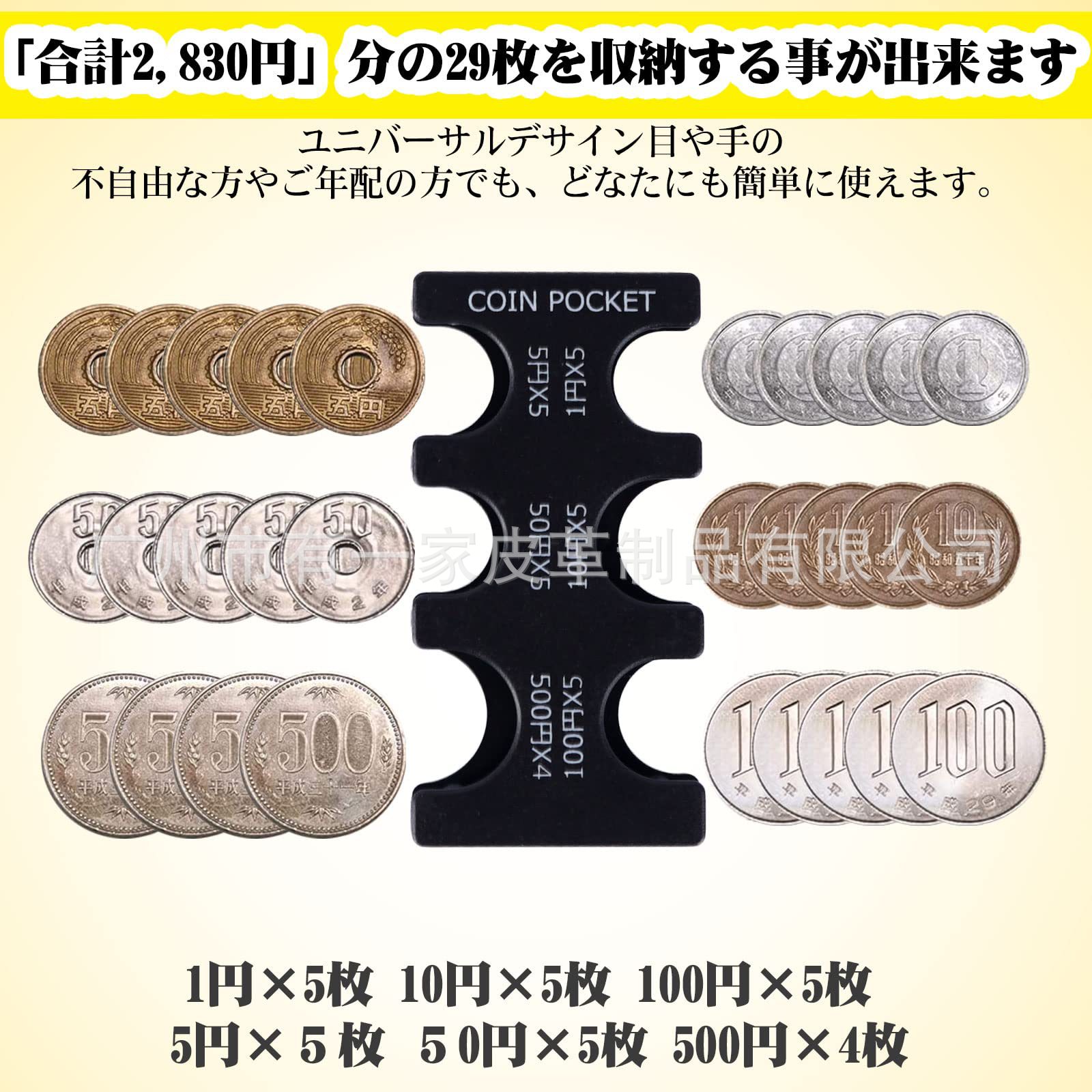 【可收纳2830日元】改良版收纳硬币夹是日本硬币专用的。 零钱分为6种,分别可收纳4~5张,固定器可以牢牢固定。 将"1日元・10日元・100日元・5日元・50日元"分别为5张,500日元*4张,合计"2,830日元",是一款方便收纳29张零钱的便携式零钱包。 可以分别收纳日本币的优良产品。 超市购物时十分方便。 ※日本圆硬币以外的东西请勿收纳。