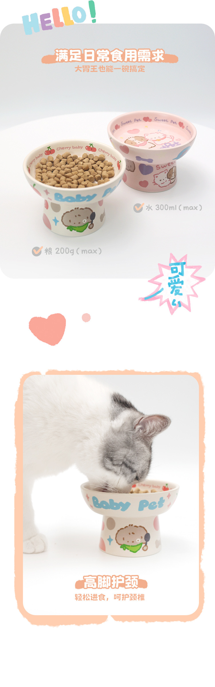[NianGao NianGao] 어린이 재미있는 세라믹 고양이 그릇 더블 그릇 강아지 분지 고양이 먹이 분지는 척추 애완 동물을 보호합니다