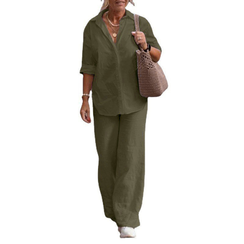 유럽과 미국의 국경 여성 투피스 세트 여성 2025 옷깃 긴팔 셔츠 봄, 가을 캐주얼 솔리드 컬러 바지 와이드 레그 슈트