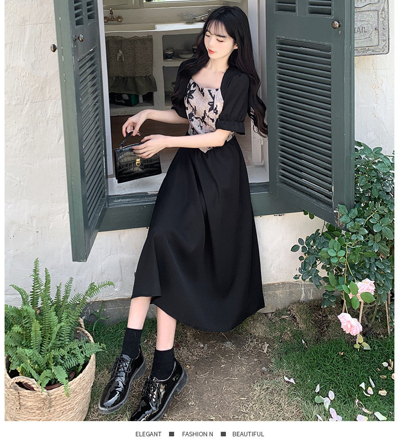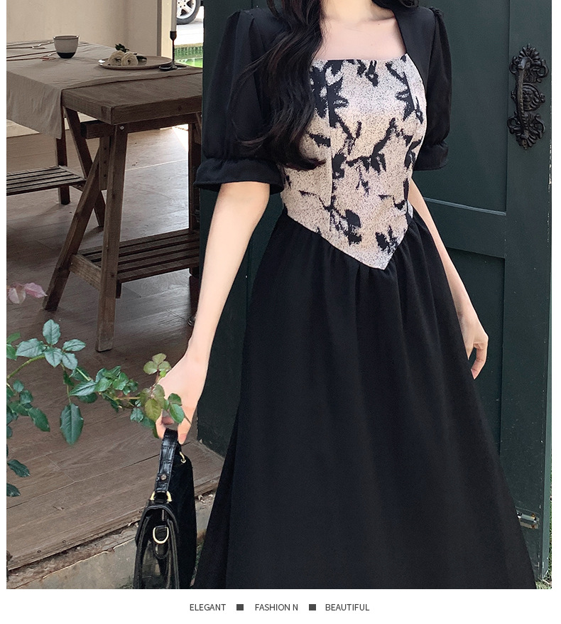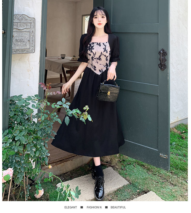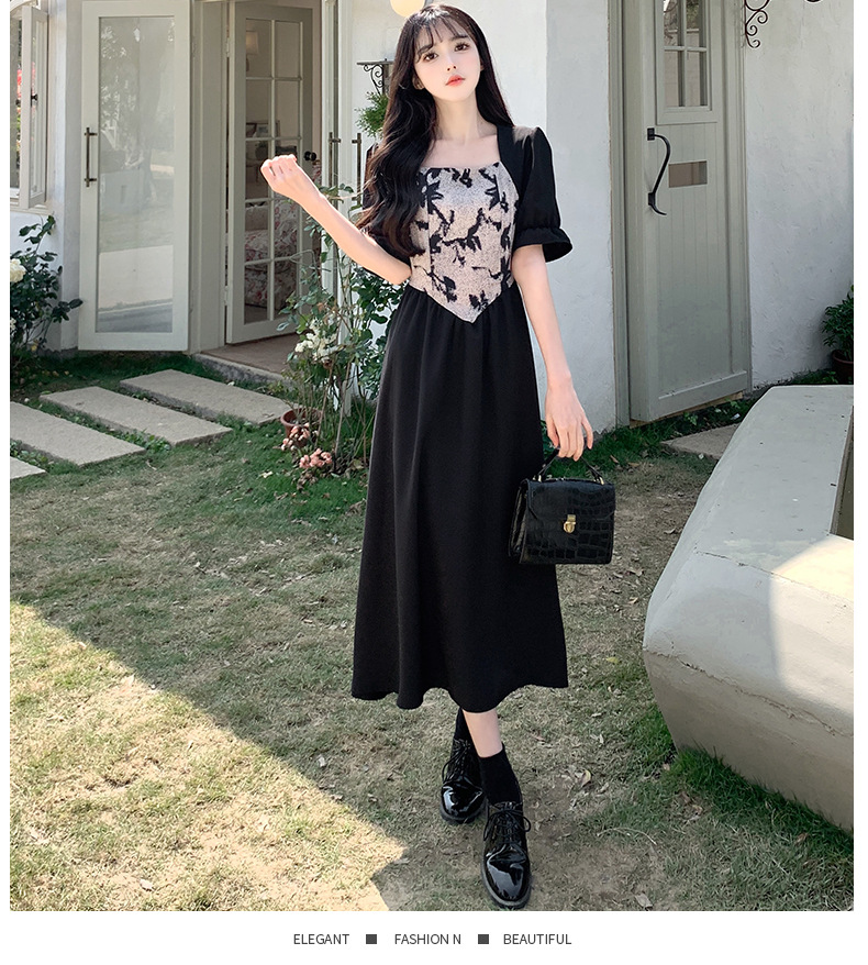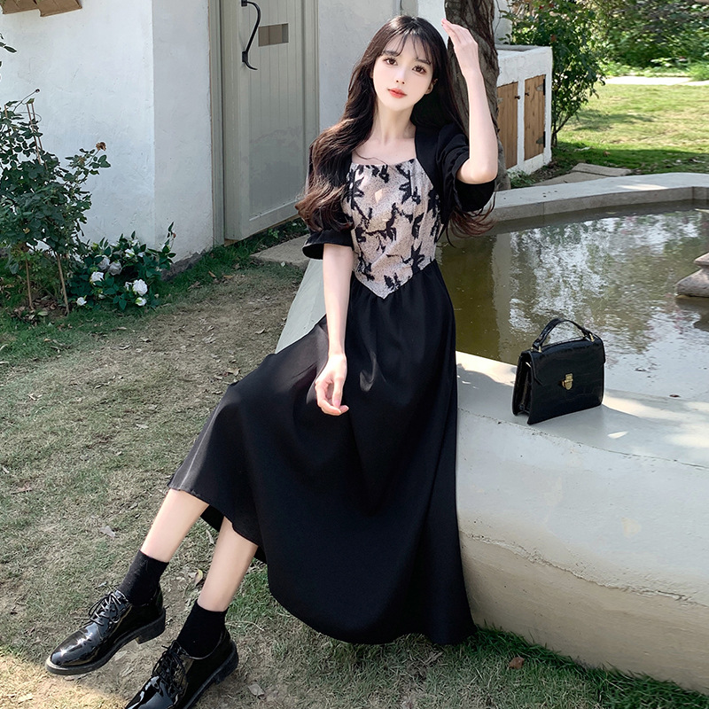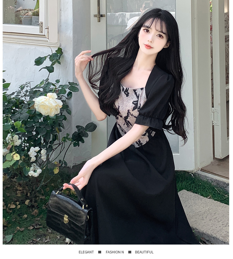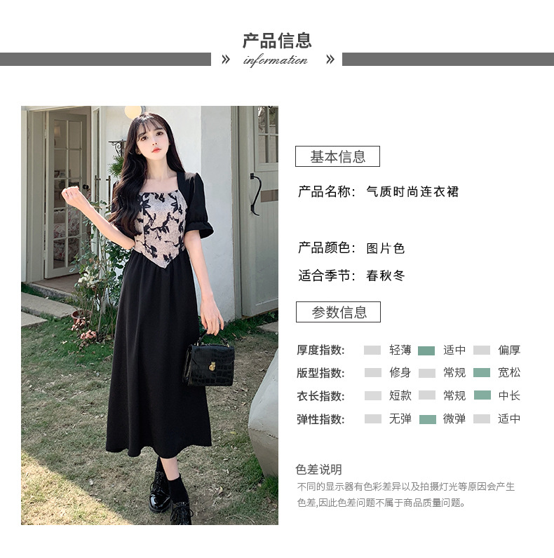 플러스 사이즈 햅번 스타일 스퀘어 칼라 우아한 블랙 원피스 여자의 가을 통통녀 꽉 허리 바느질 디자인 프랑스 스타일 긴 원피스스토어 가기