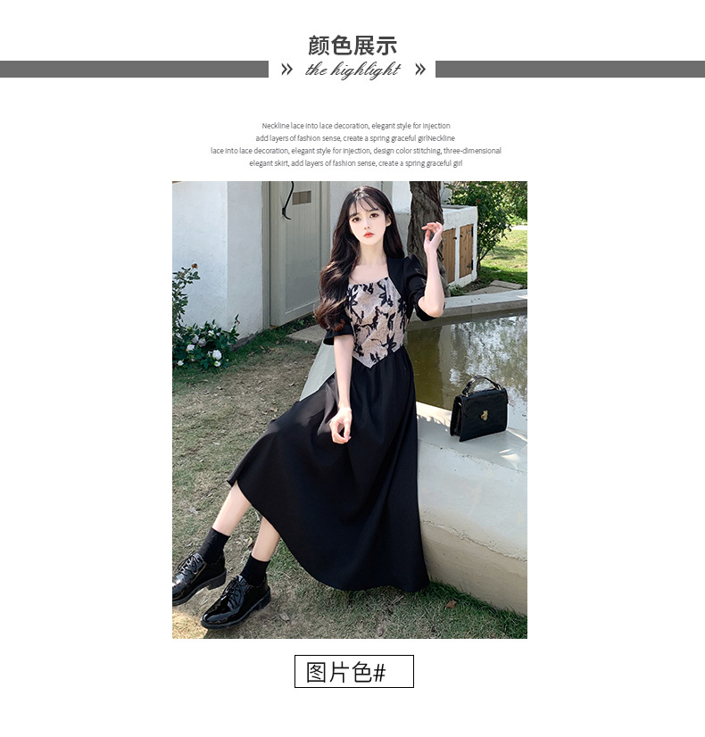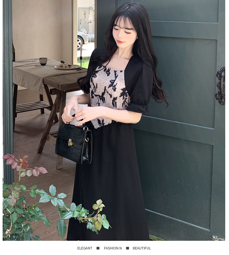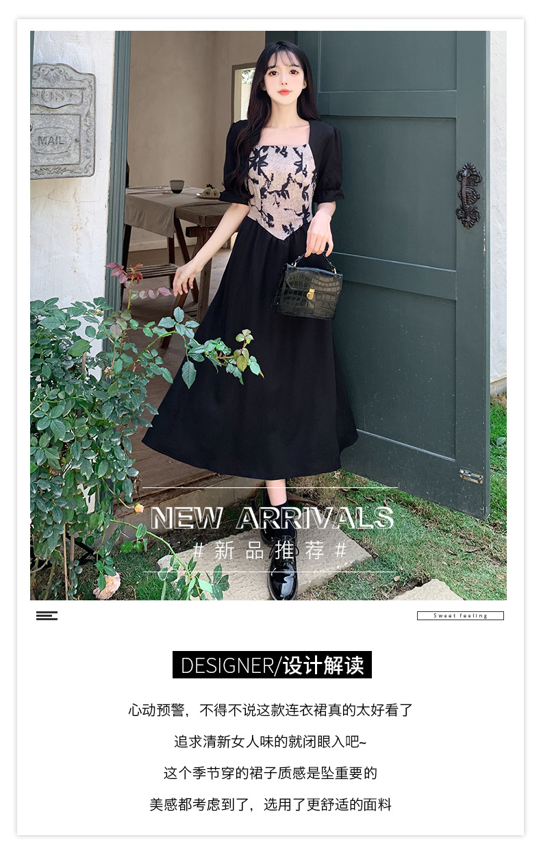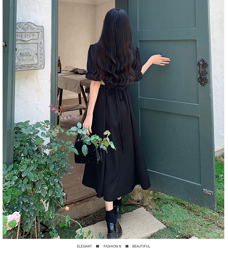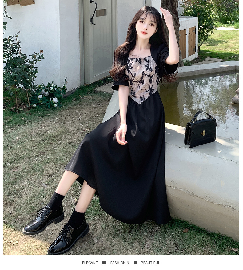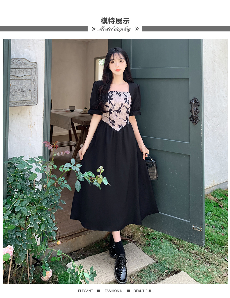 플러스 사이즈 햅번 스타일 스퀘어 칼라 우아한 블랙 원피스 여자의 가을 통통녀 꽉 허리 바느질 디자인 프랑스 스타일 긴 원피스스토어 가기