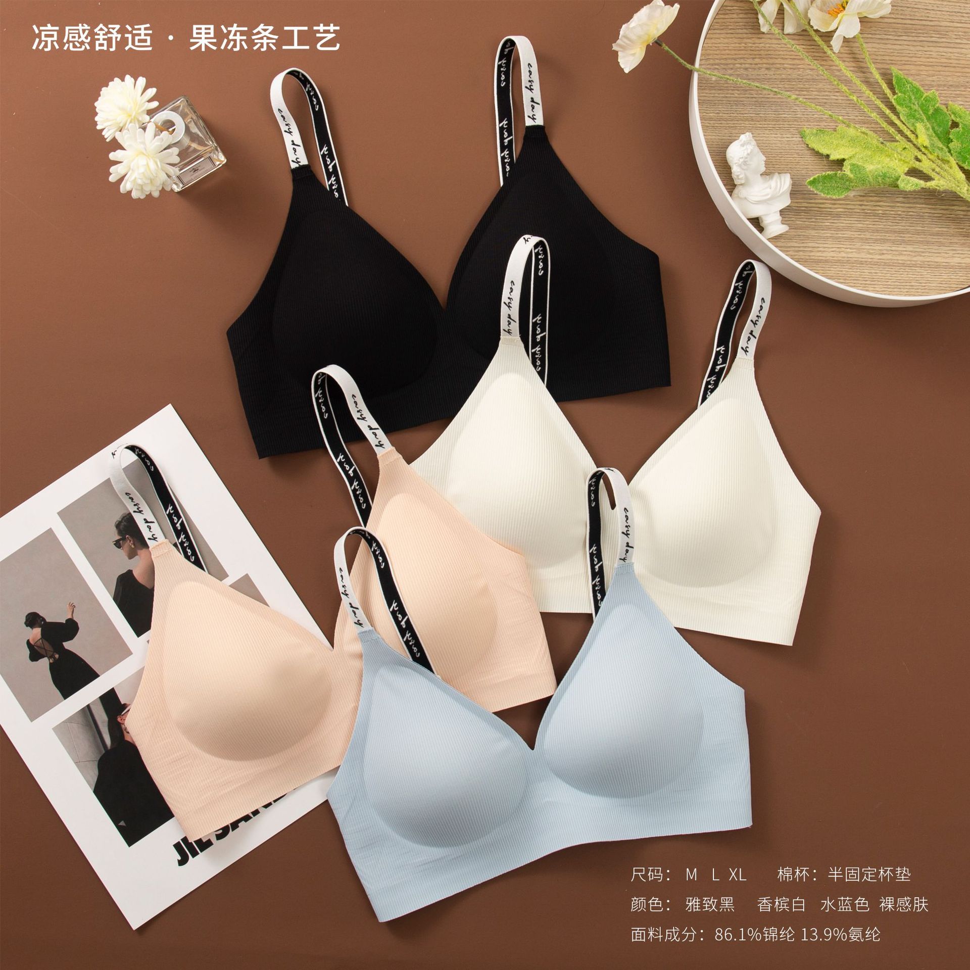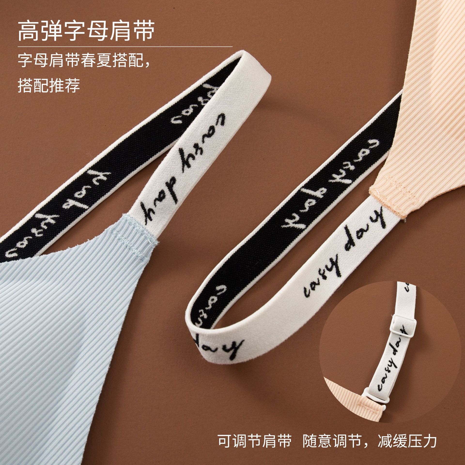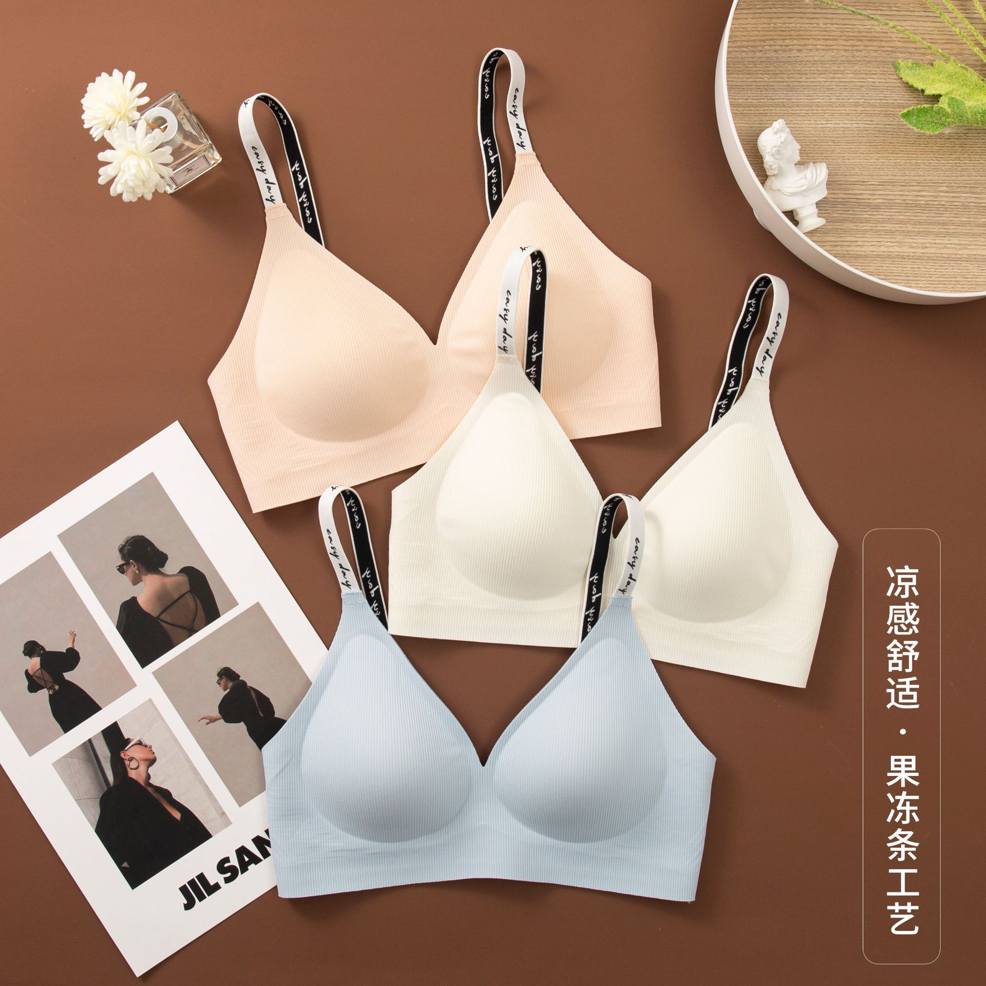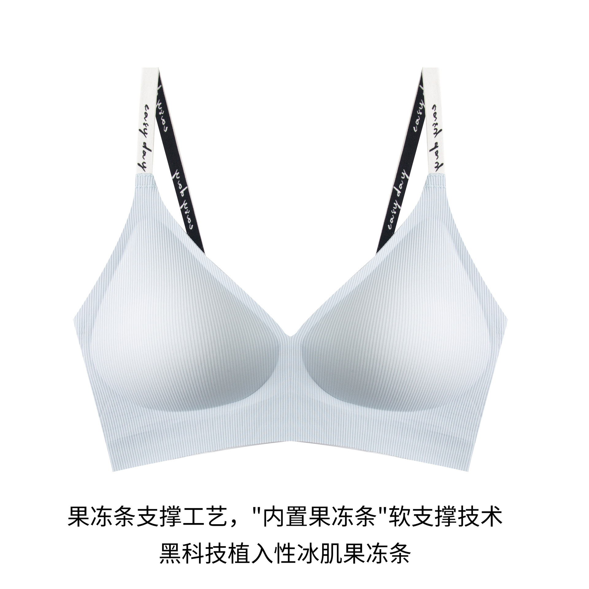 와이어 프리 젤리 스트립, 편안하고 부드러운 지지력, 스레드 문자 어깨 끈 브라, 심리스 고정 컵 조끼, 여성 속옷스토어 가기