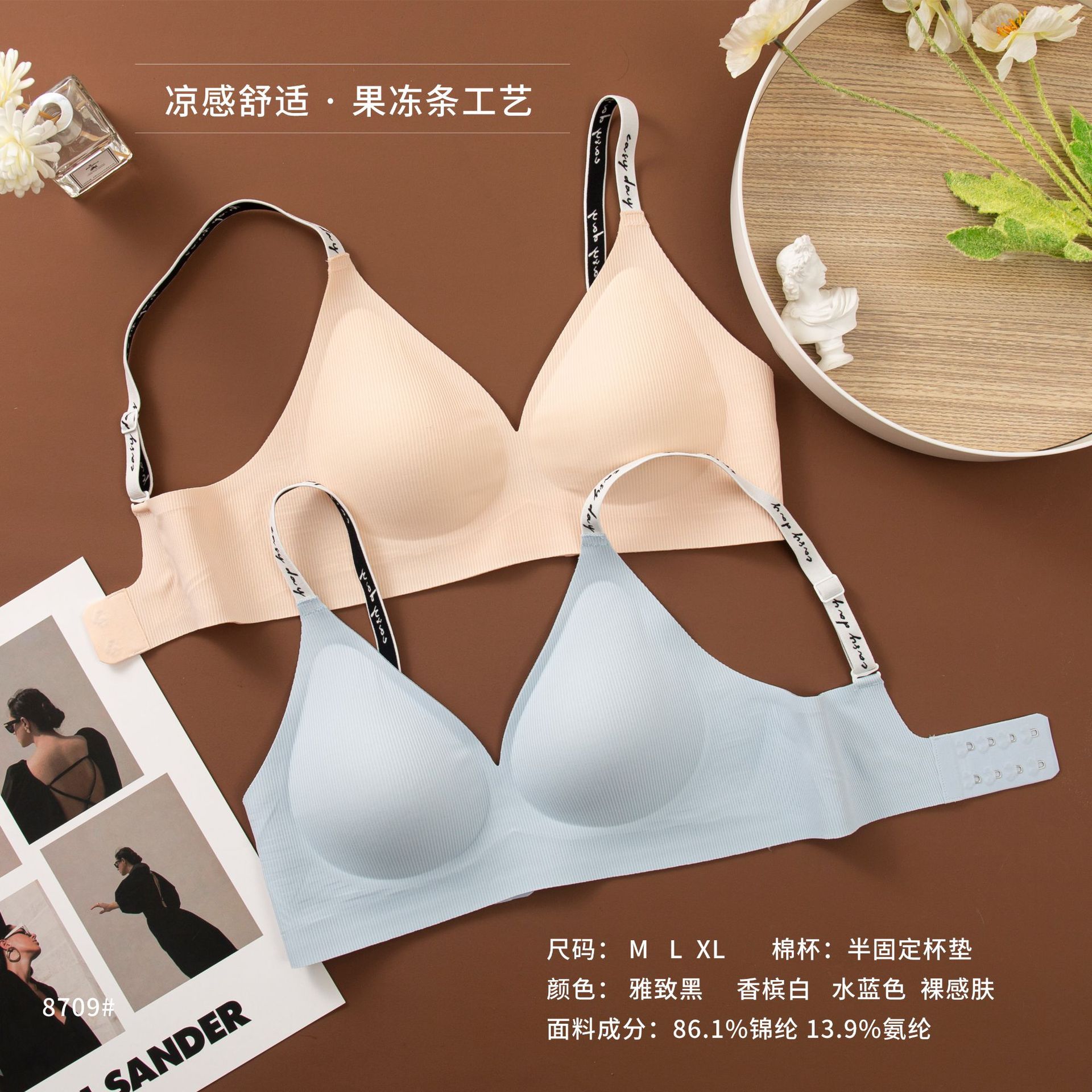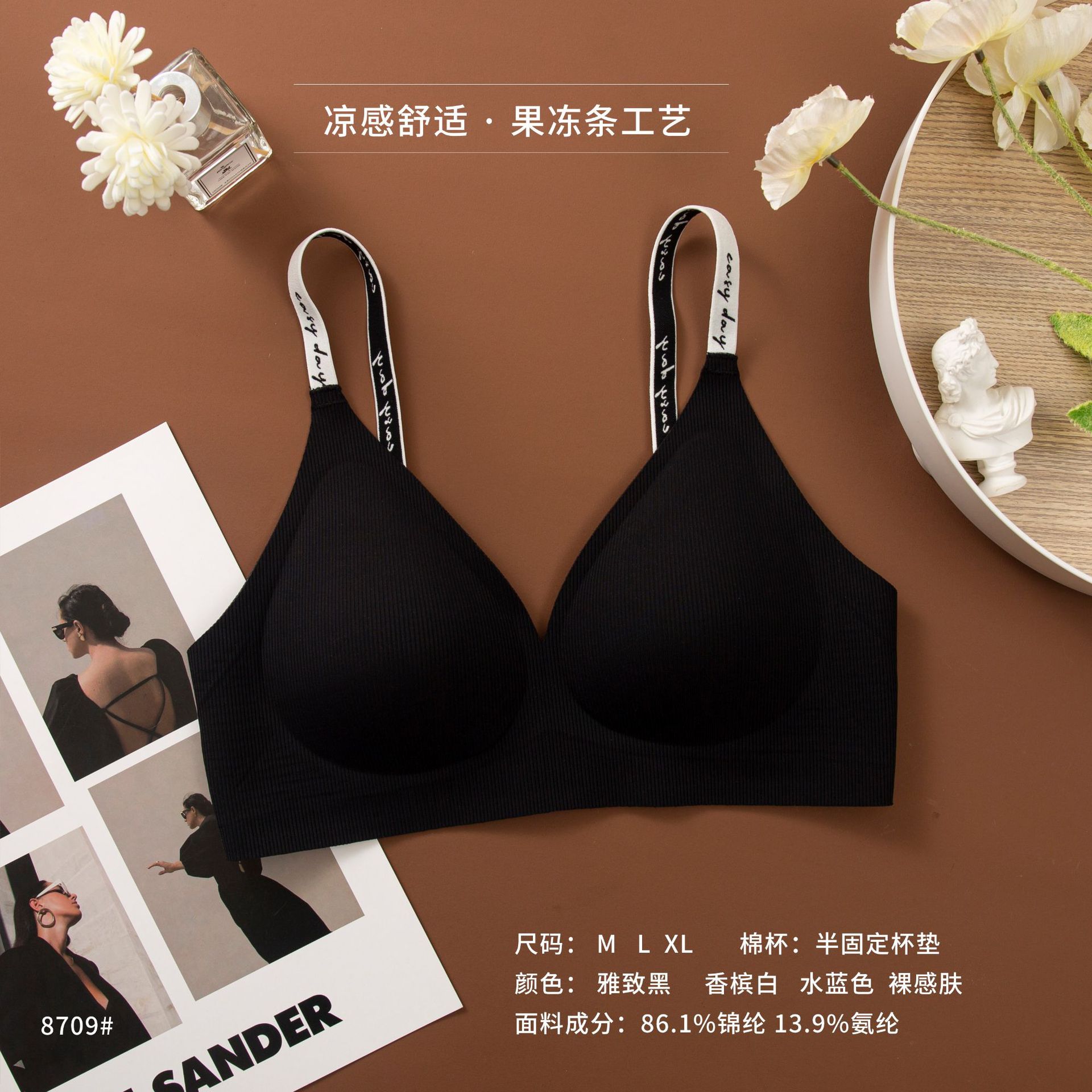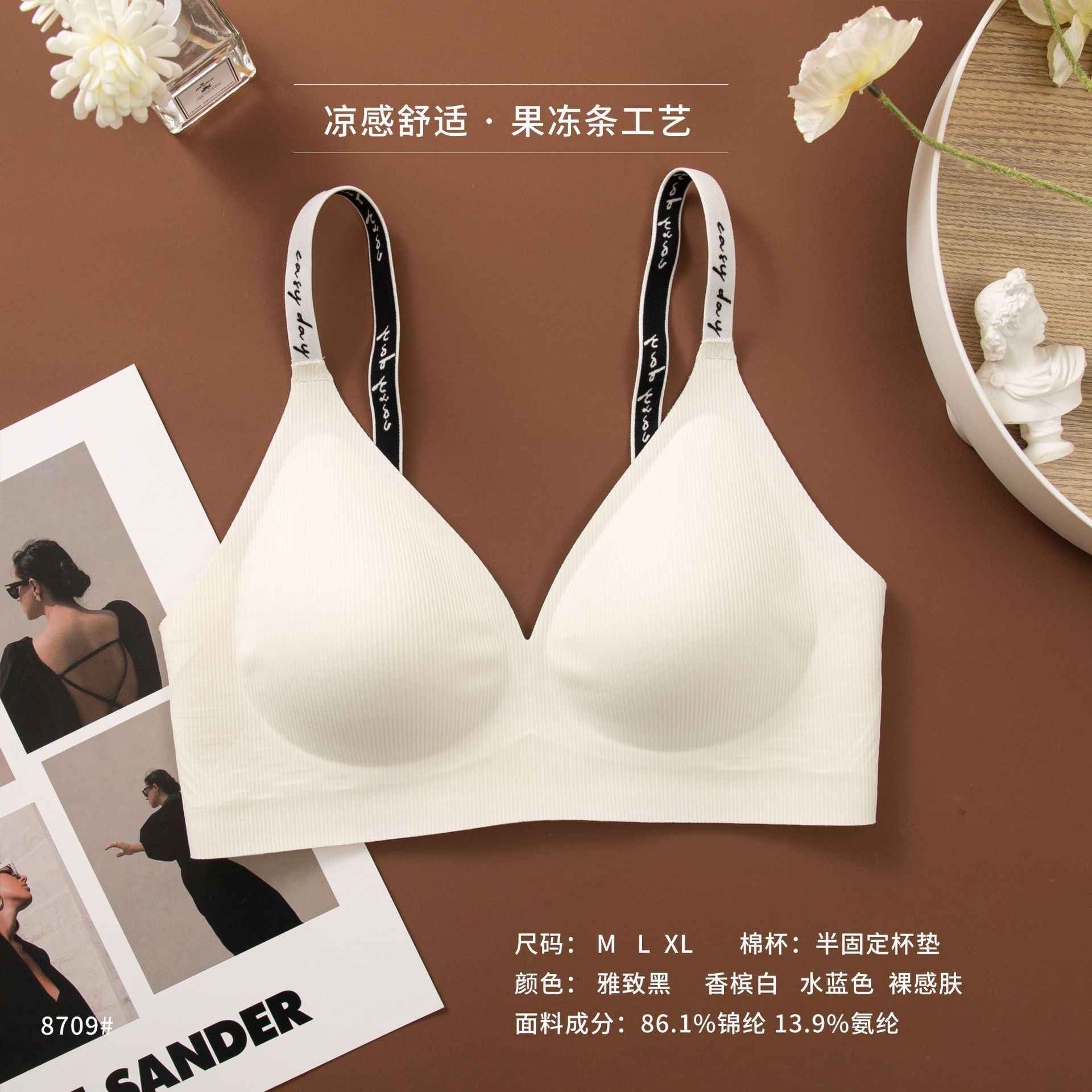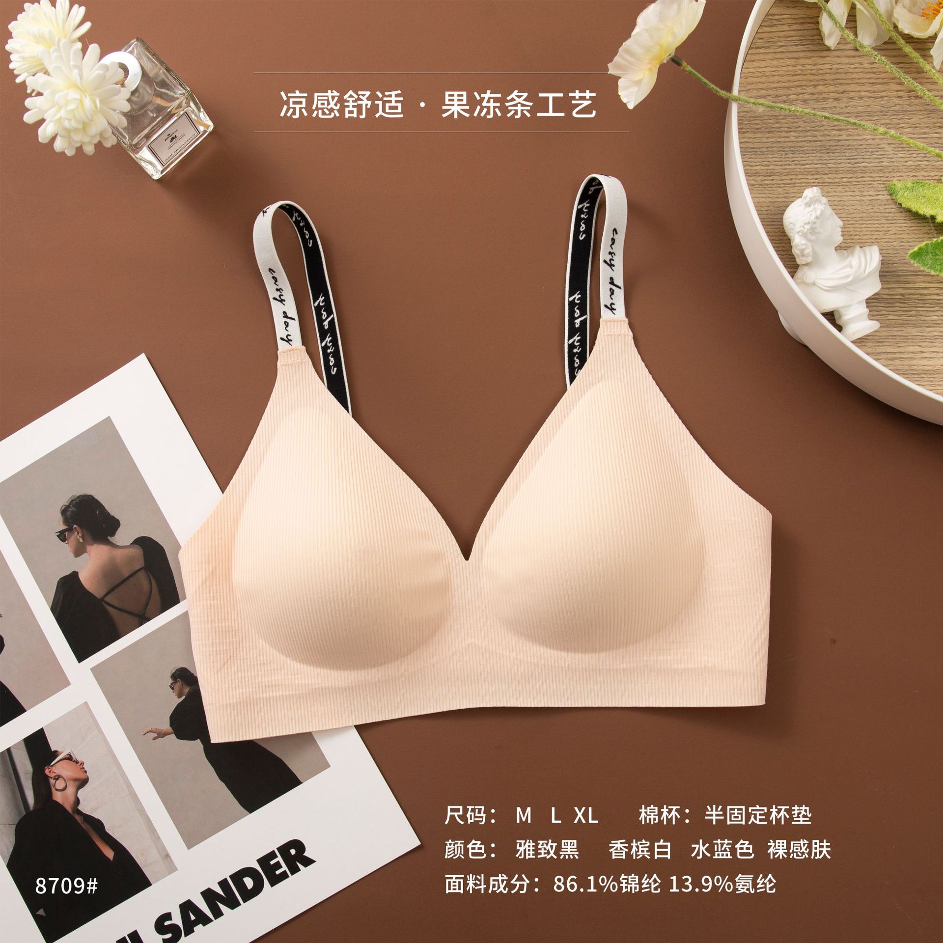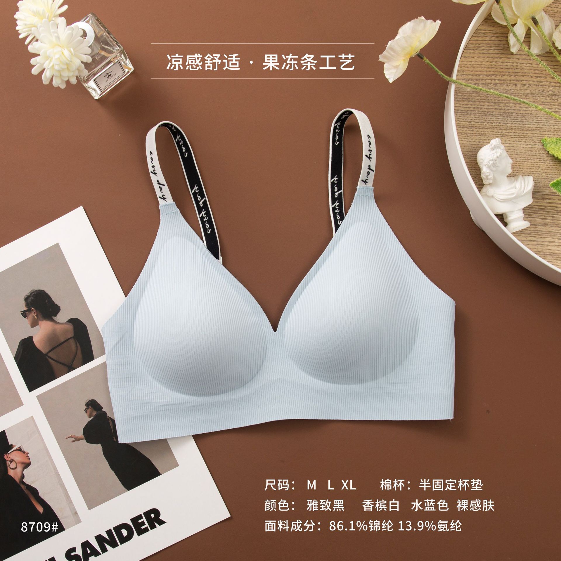 와이어 프리 젤리 스트립, 편안하고 부드러운 지지력, 스레드 문자 어깨 끈 브라, 심리스 고정 컵 조끼, 여성 속옷스토어 가기
