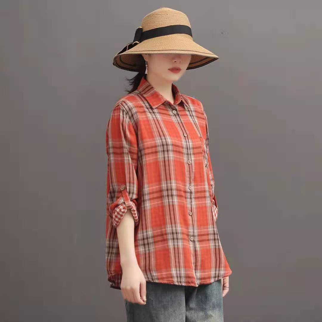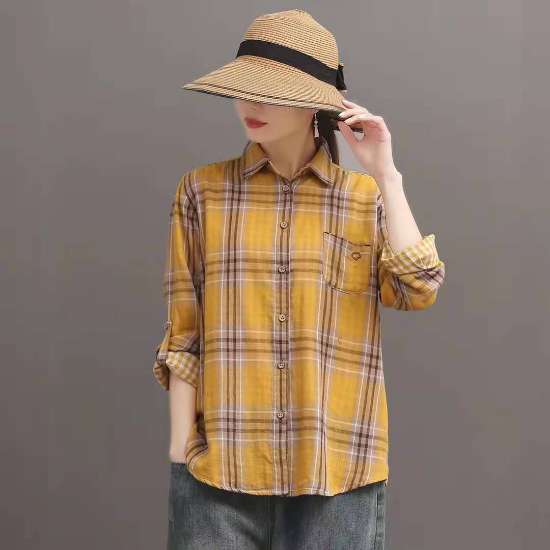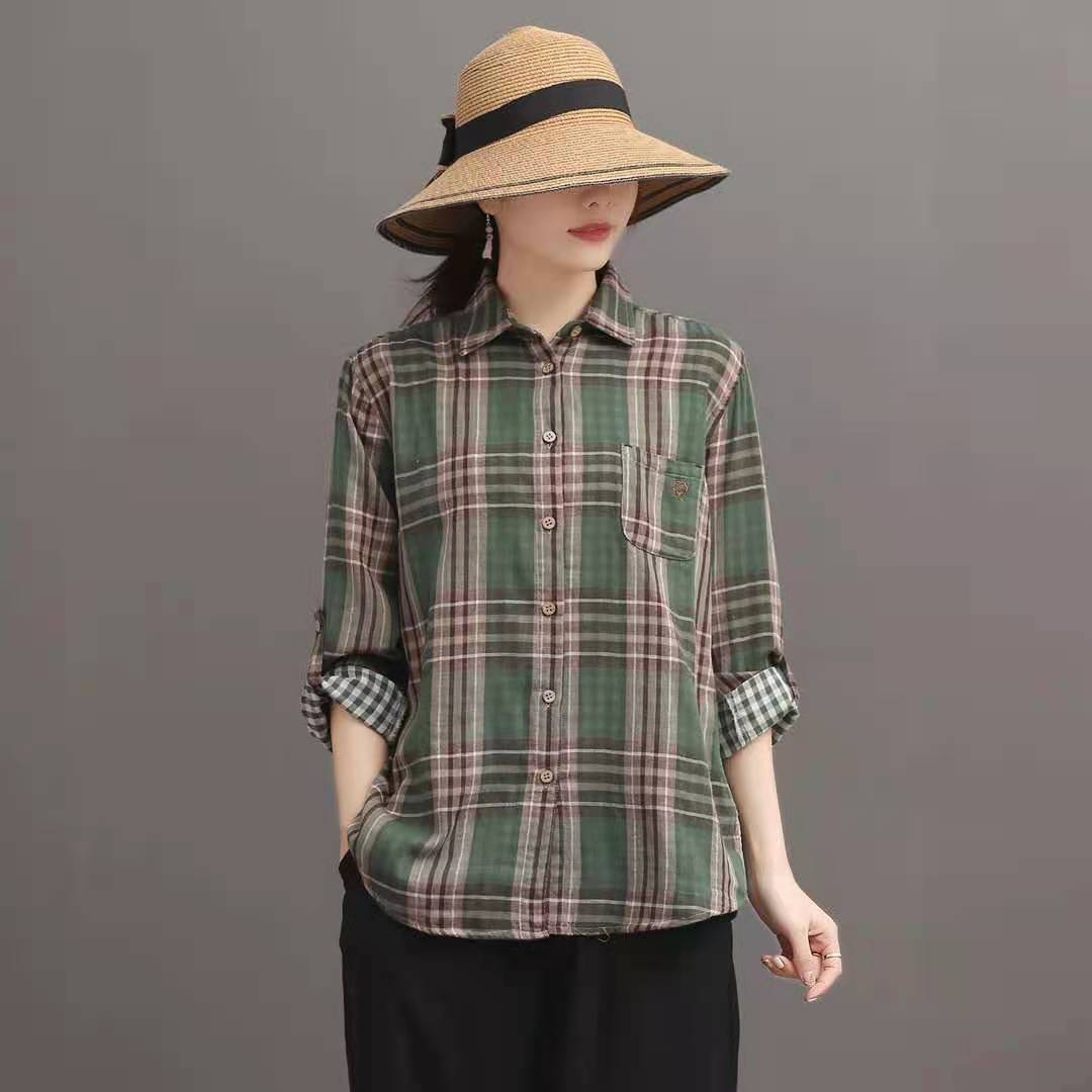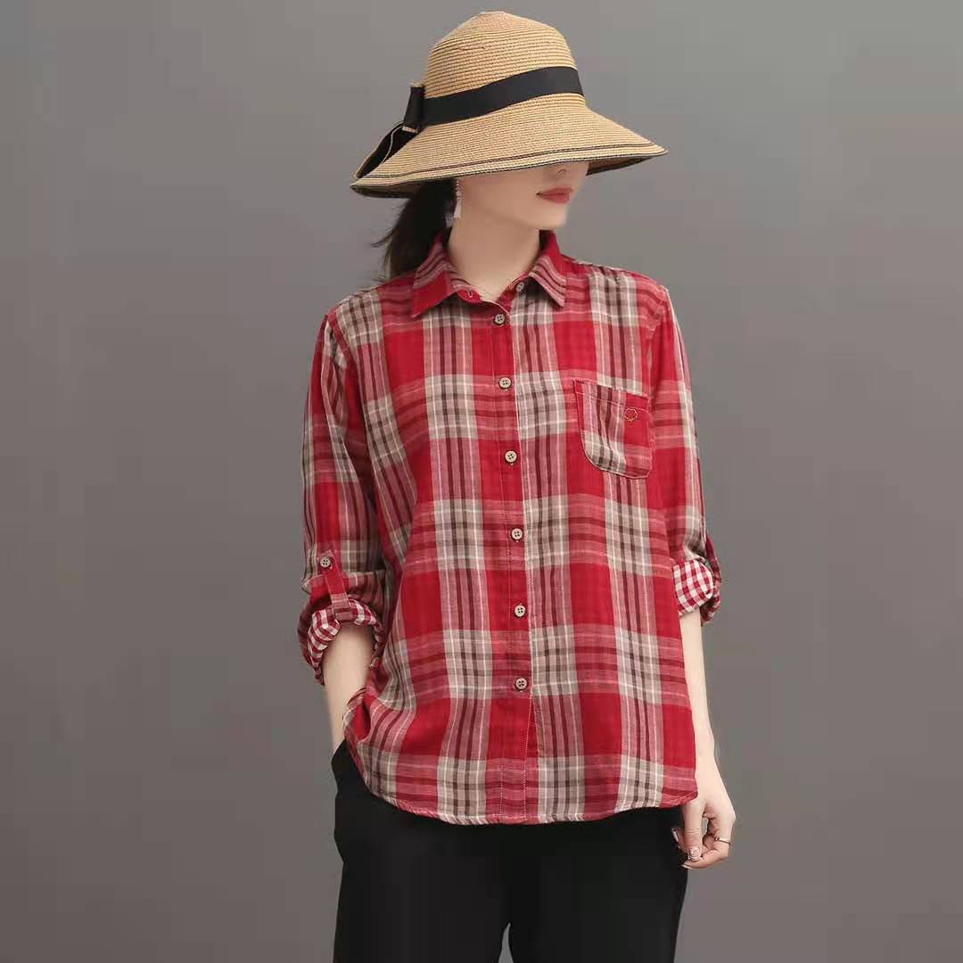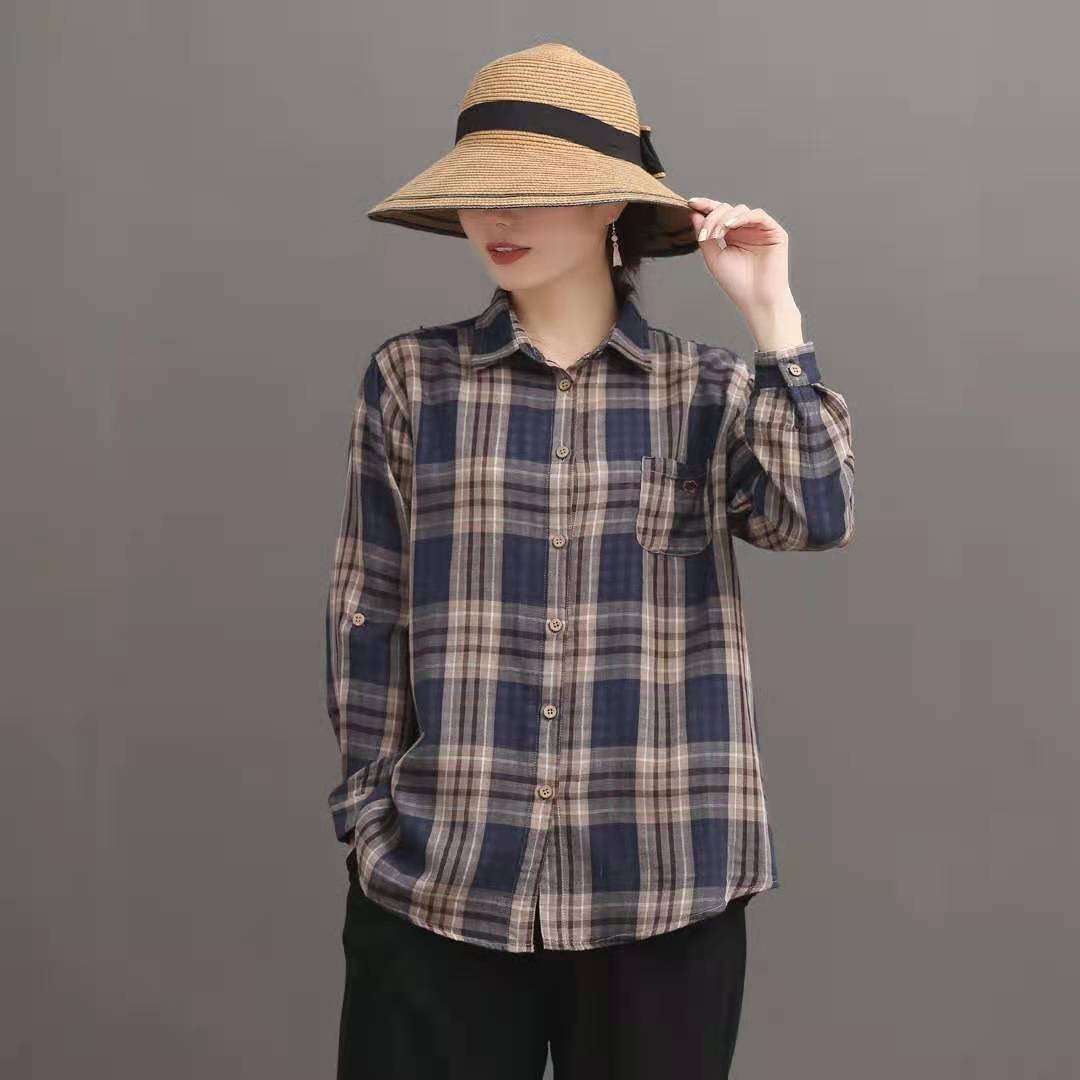 2023 봄 새로운 일본 예술 스타일 격자 무늬 자수 포켓 여성용 긴 소매 셔츠스토어 가기