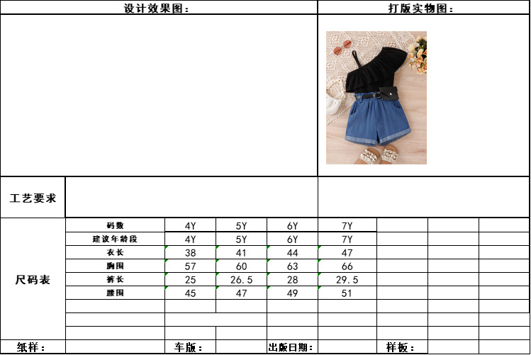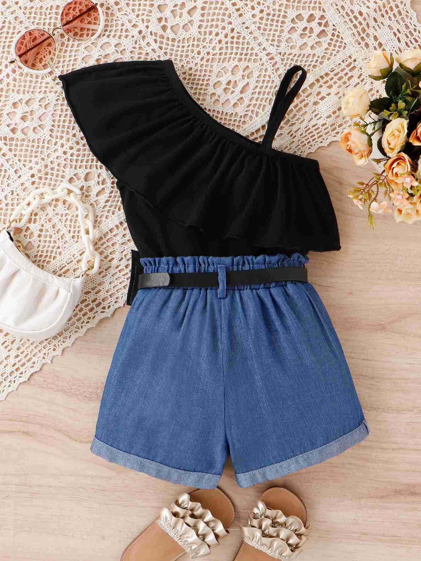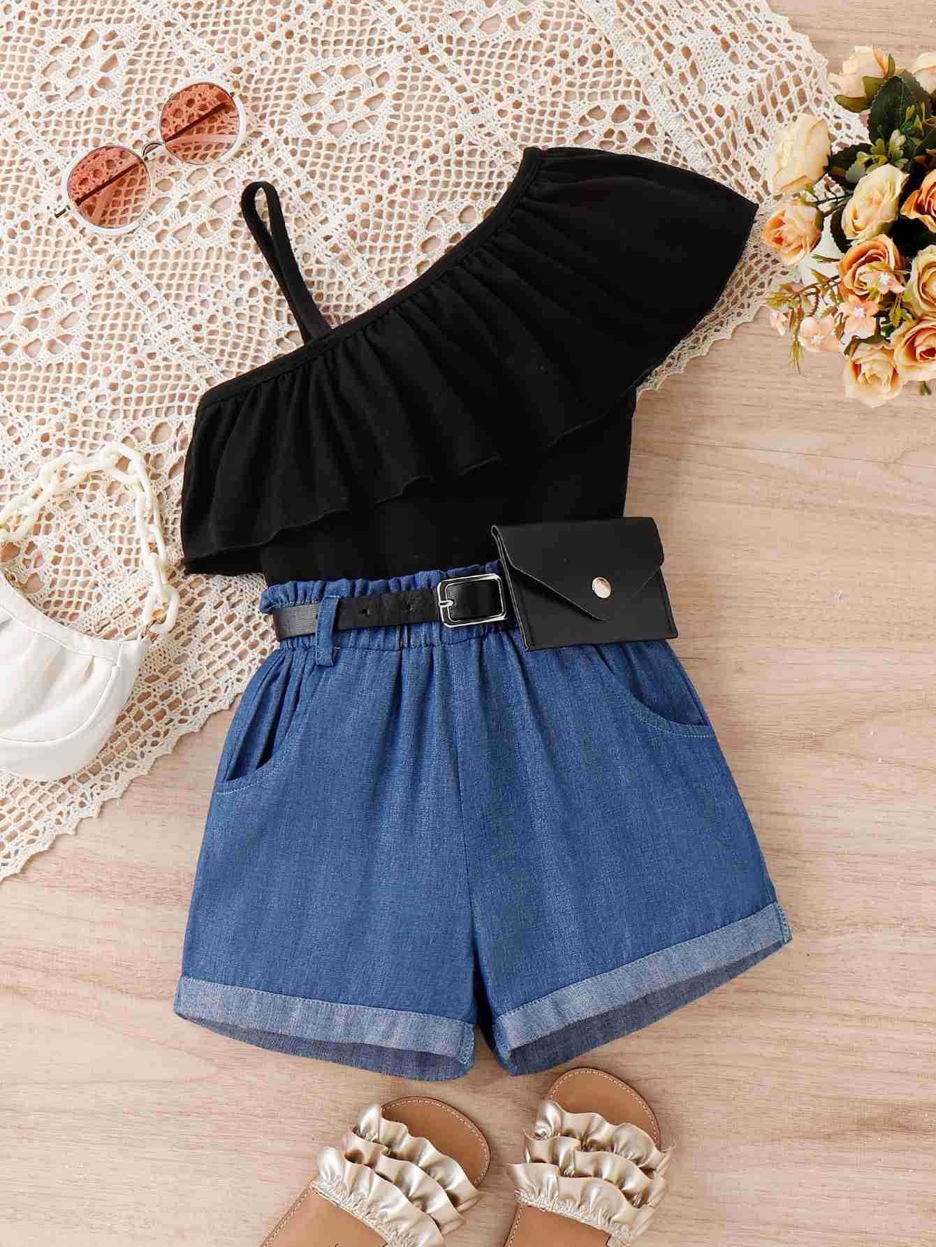 Baopin 아동복 유럽과 미국 소녀 봄과 여름 비스듬한 어깨 러플 슬링 데님 허리 가방 유행 반바지 어린이 세트
