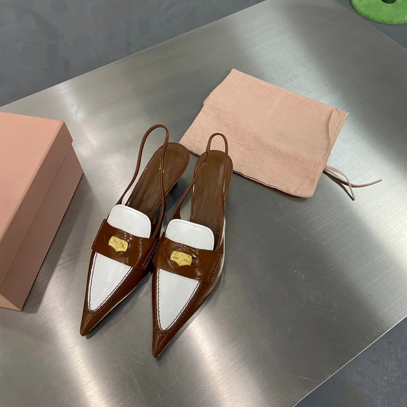 즉시 배송! 패셔너블하고 다재다능한 신상 작은 동전 모양 가죽 뾰족코 얇은 굽 오픈힐 샌들 여성용 OL 출퇴근 신발 봄스토어 가기