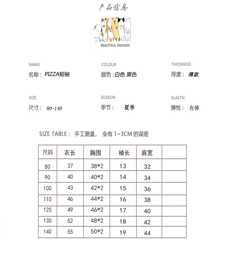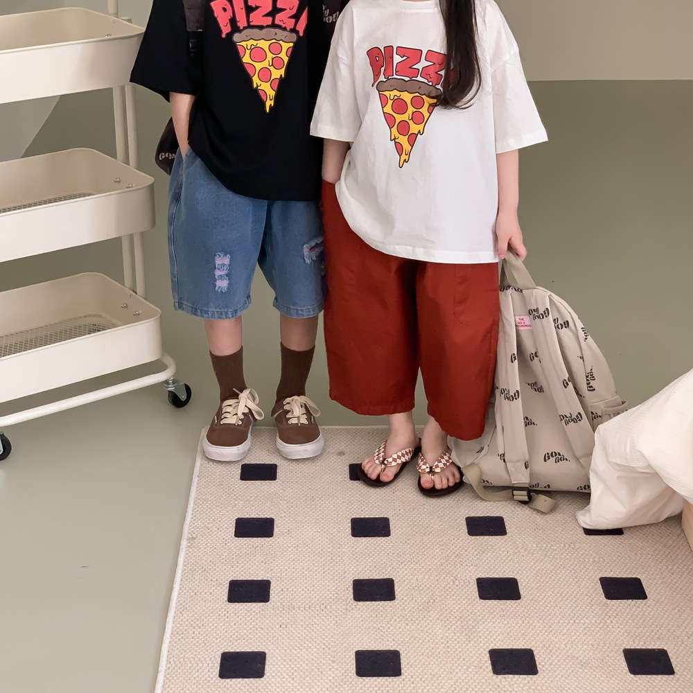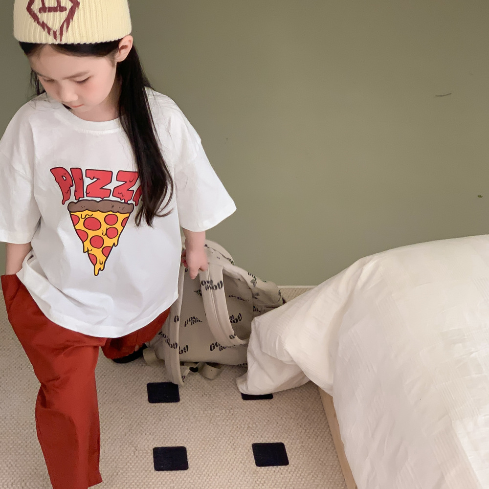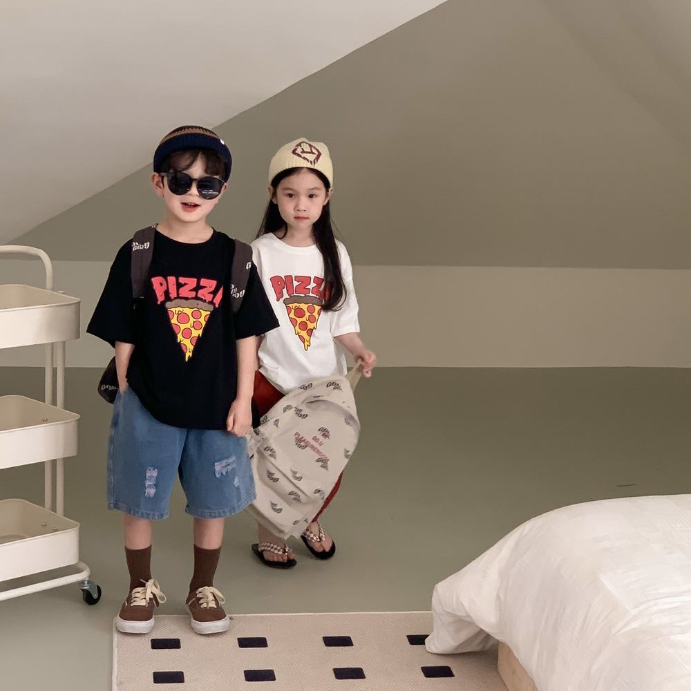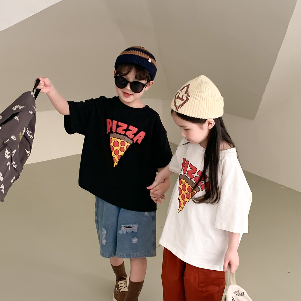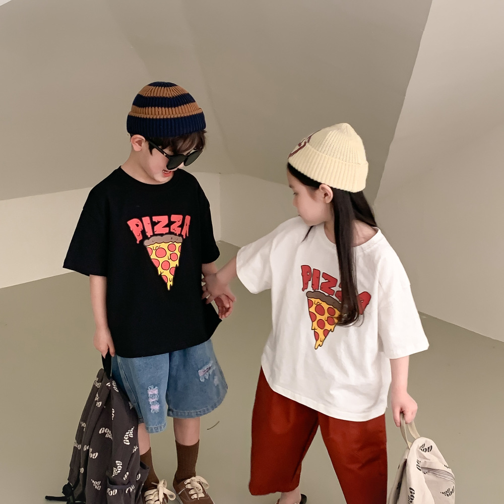 아동 티셔츠 2026 여름 스타일 남아 여아 한국 스타일 캐주얼 루즈핏 피자 레터 프린트 반팔 상의