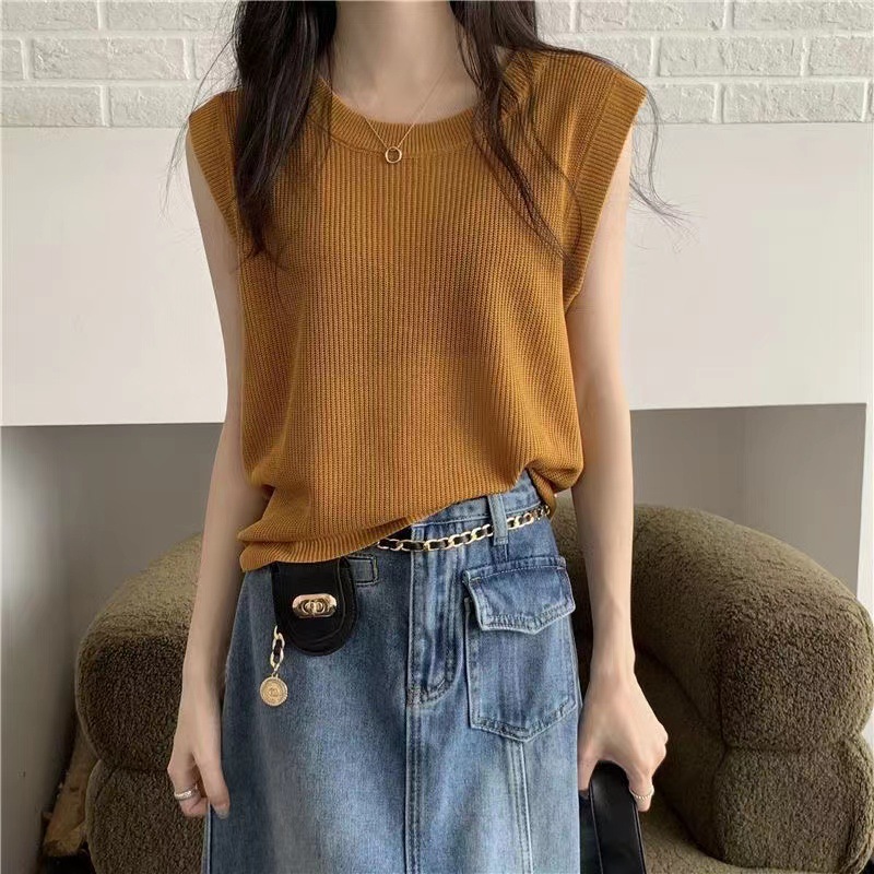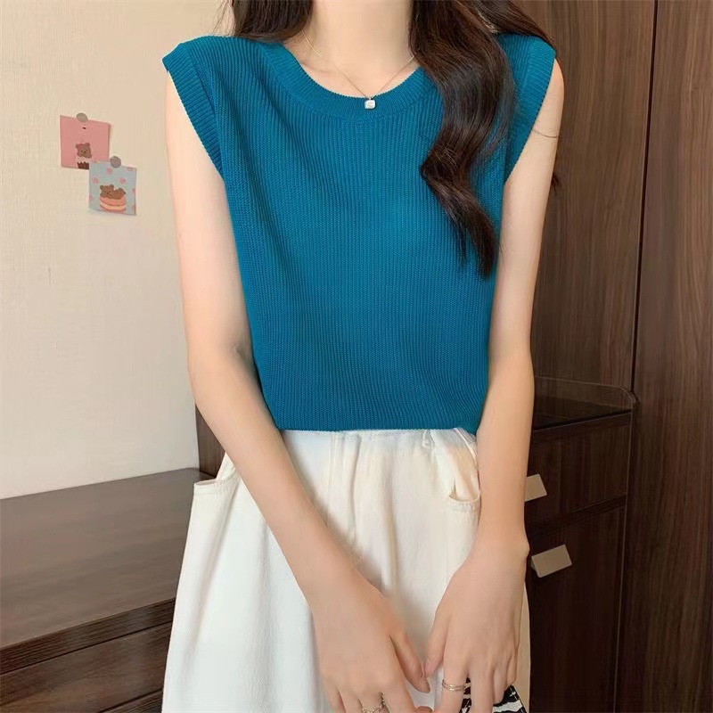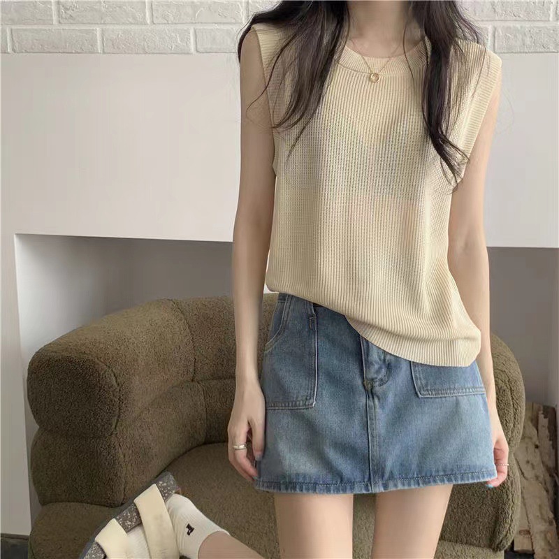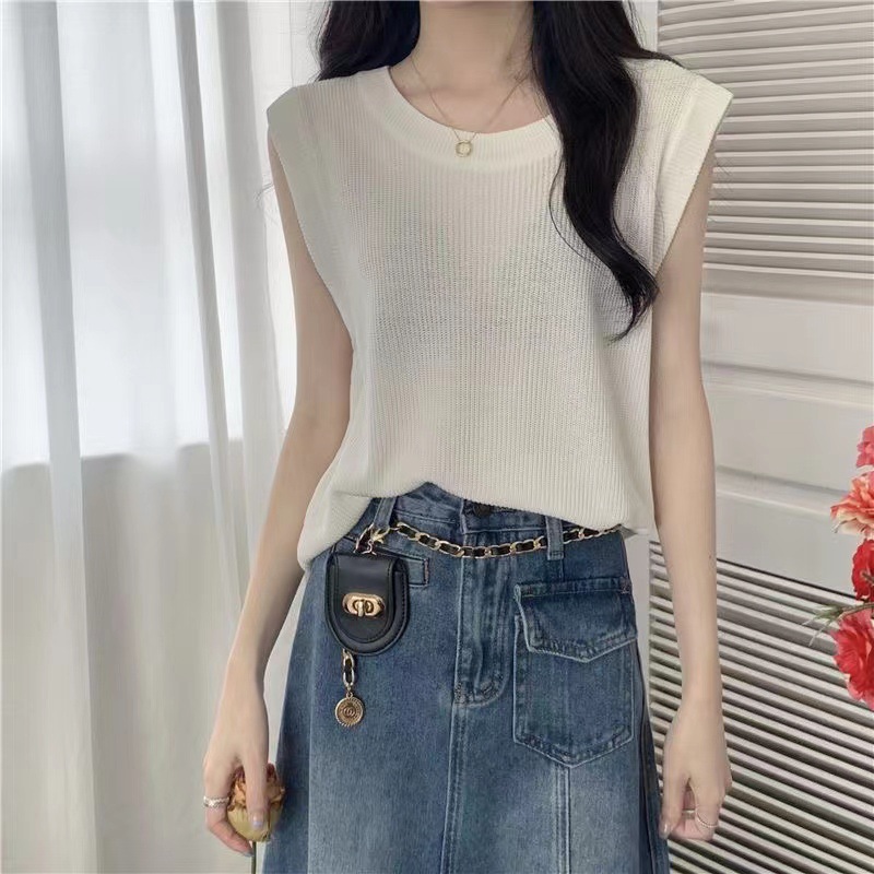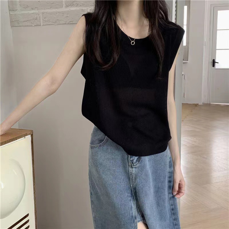 라운드 넥 얇은 민소매 스웨터 여성용 여름 2023 새로운 스타일 내부 착용 겉옷 단색 마이크로 투명 탑 여성 트렌디 한 작은 셔츠스토어 가기