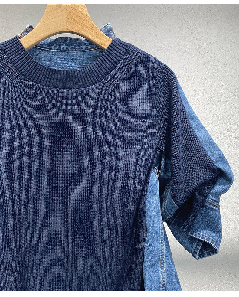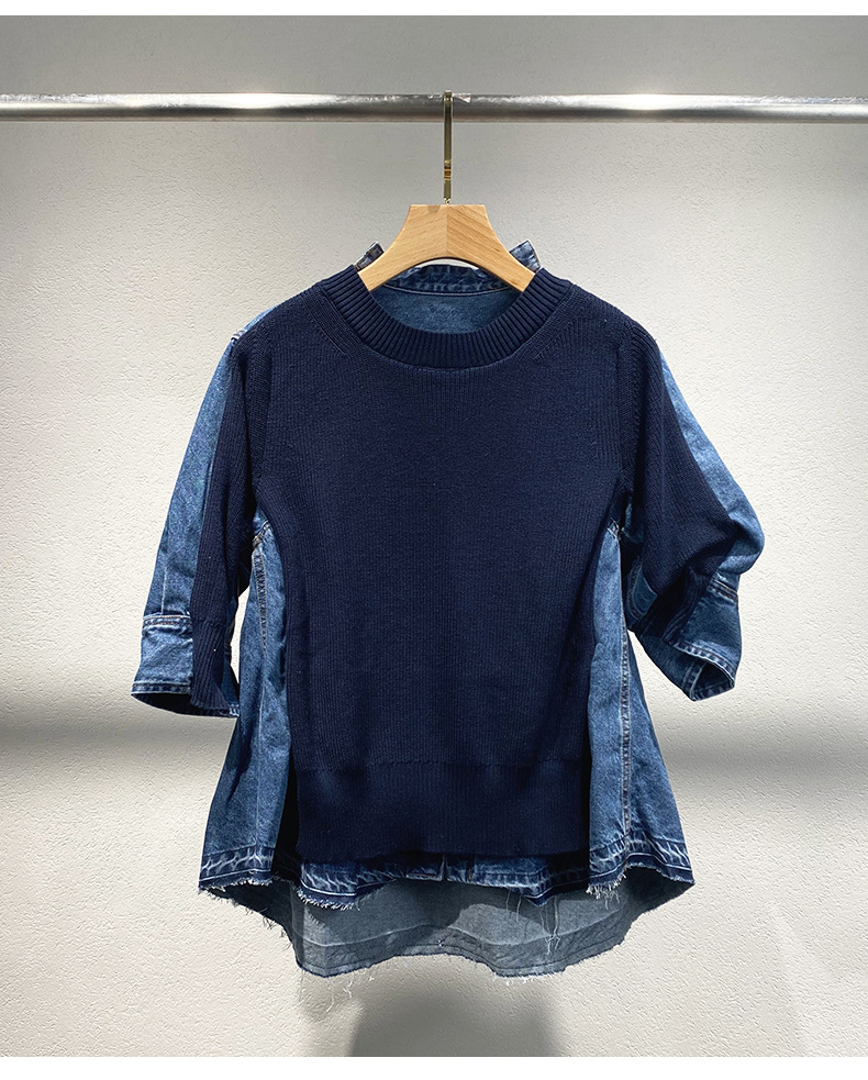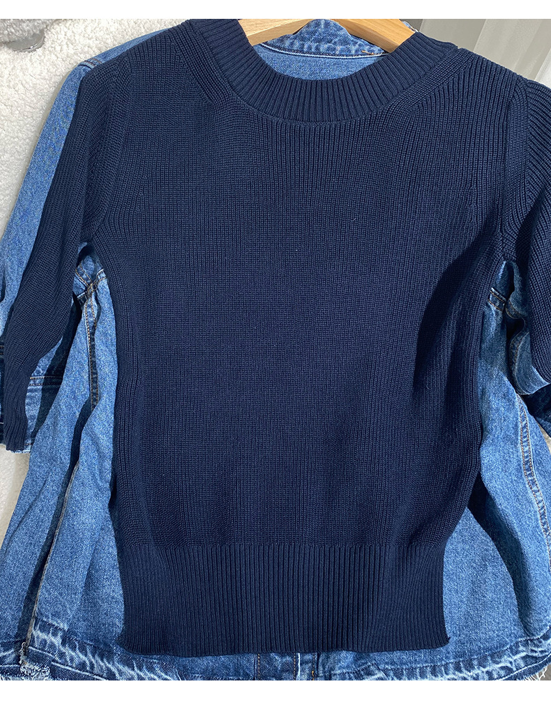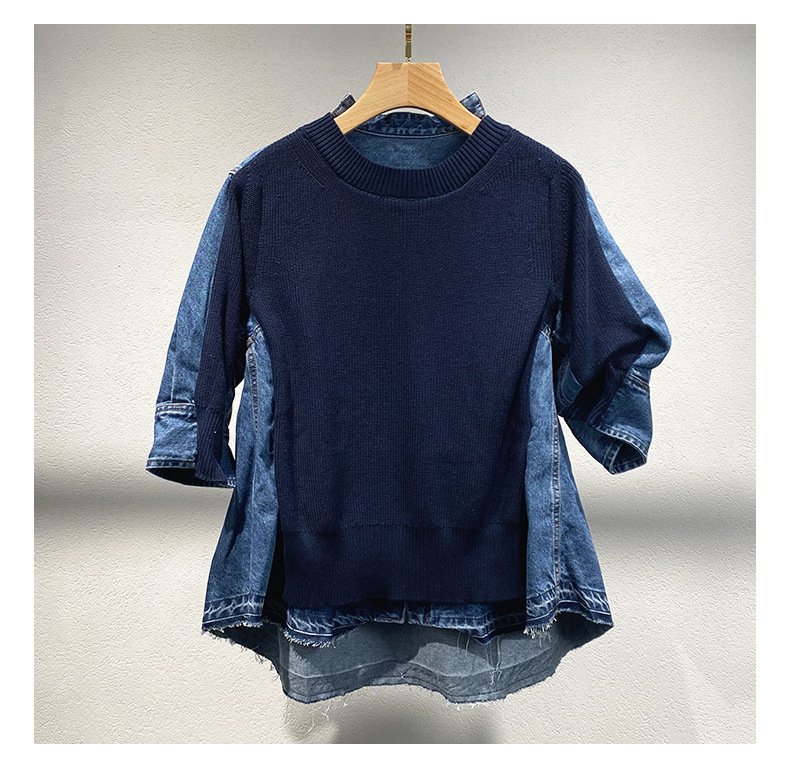 틈새 2023 봄 새로운 풀오버 올 매치 스웨터 탑 패션 데님 바느질 반팔 스웨터 여성 트렌드스토어 가기