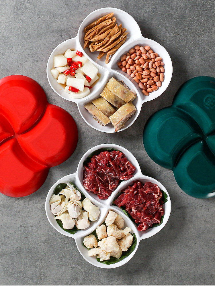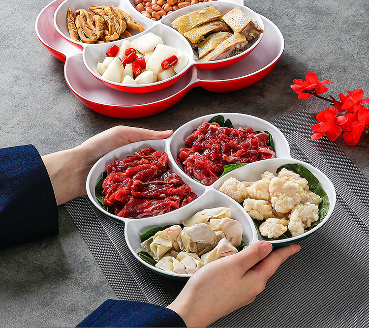 멜라민 식기 플레이트 모방 도자기 플레이트 스낵 플레이트 상업 플라스틱 4 그리드 플레이트 창조적 인 말린 과일 너트 플레이트 그리드 플레이트 플레이트