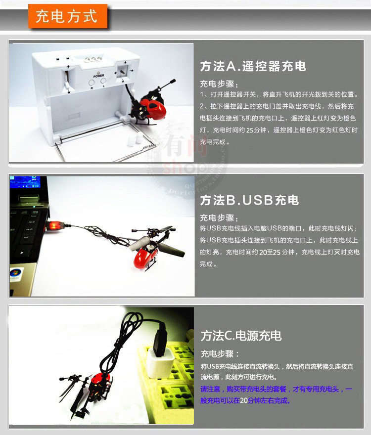 两款机头、四种颜色混装、功能:上升、下降、左转、右转、前进、后退、机身3.7伏75毫安高能锂电池,遥控器要4粒1.5AA电池。A,B两个频点。遥控器直接充电30分钟左右。电路板有带记忆和带电池保护功能,前进后退是走直航线的!。飞行时间6分钟左右。主电机用:610、尾电机用:4-08、飞机机身重:12.2克。本产品独具特色,可缩放入遥控器内,操作简单,携带便捷,内置陀螺仪,飞机操作更稳定。