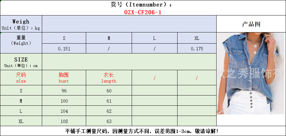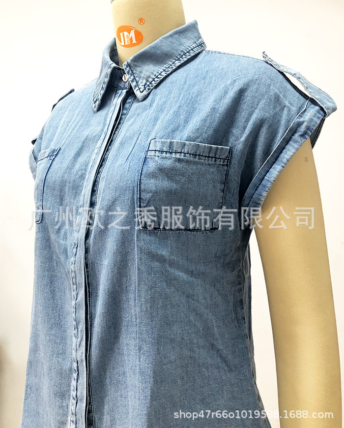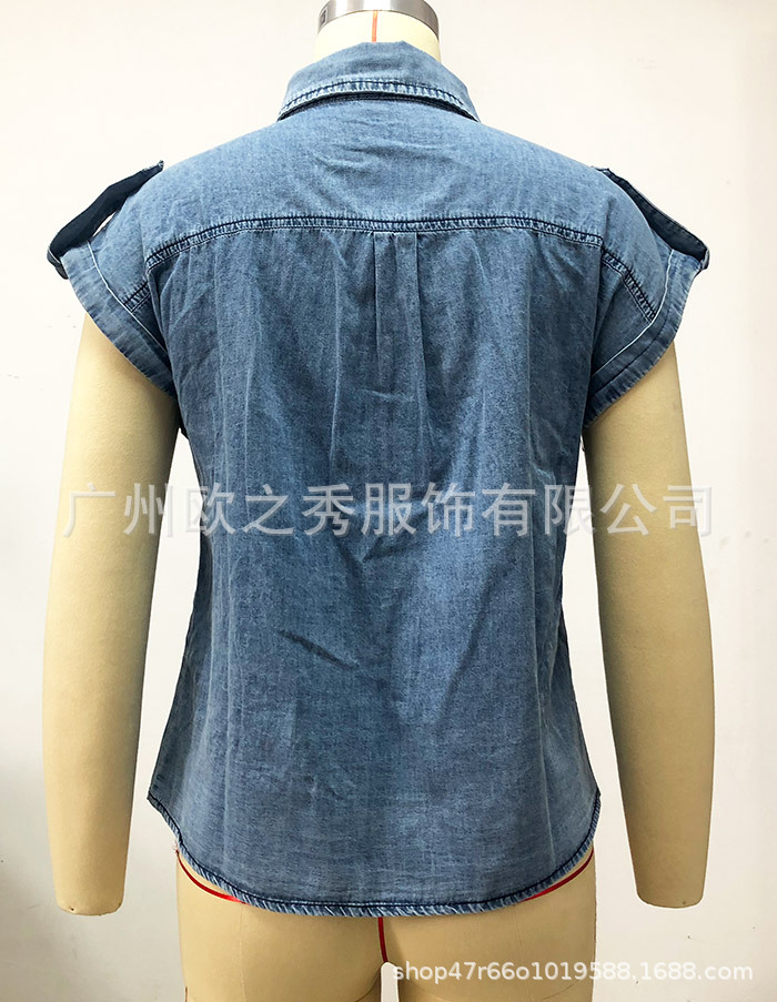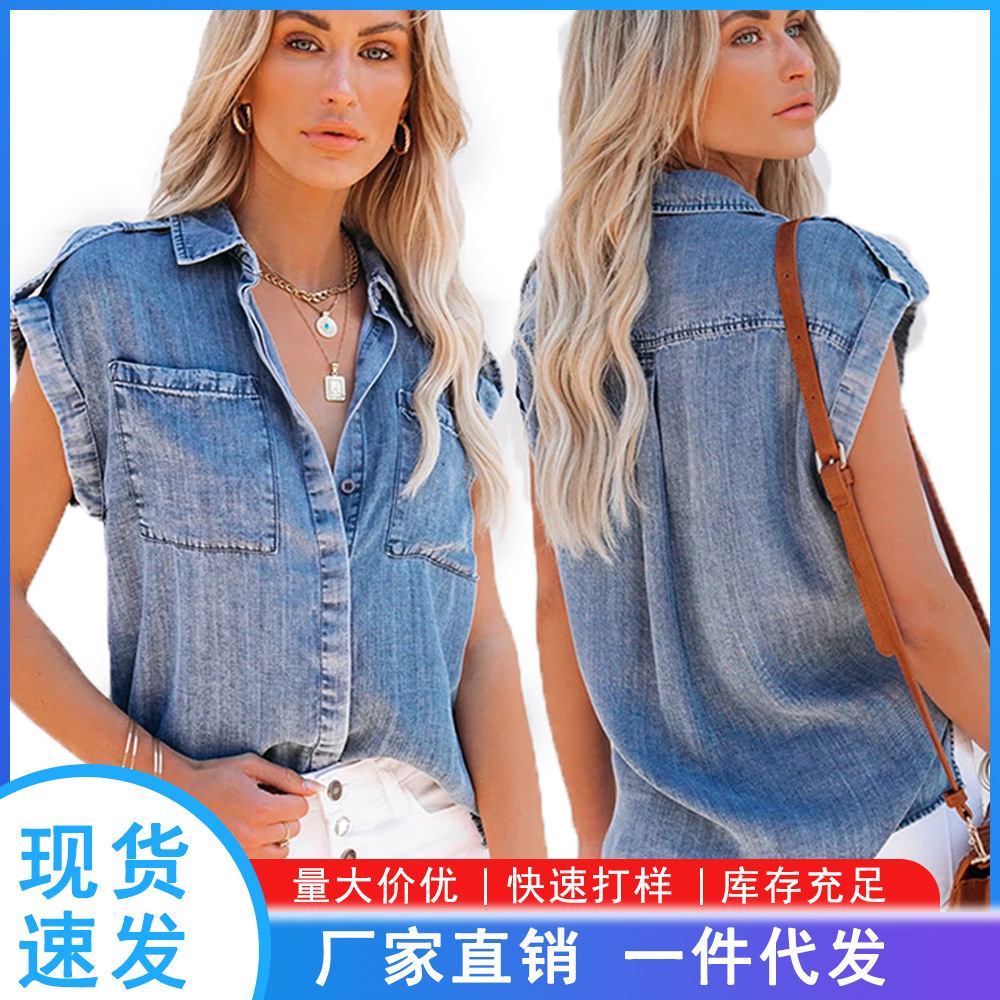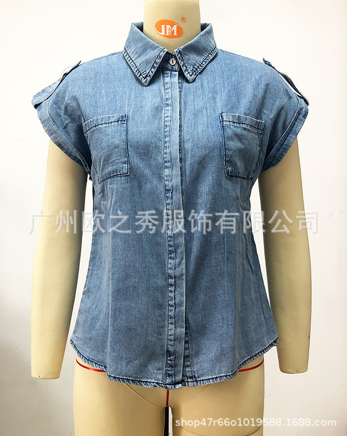 2024 여름 새로운 독립 스테이션 대외 무역 복고풍 반팔 데님 셔츠 블루 셔츠 탑 유럽과 미국 스타일의 여성 의류