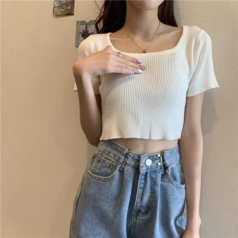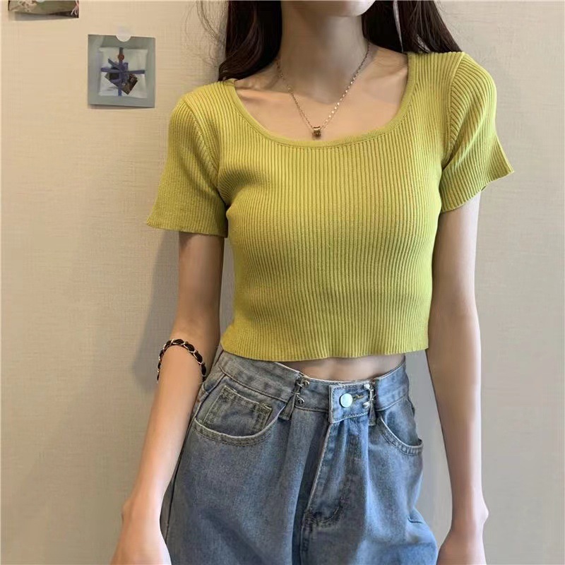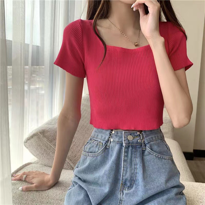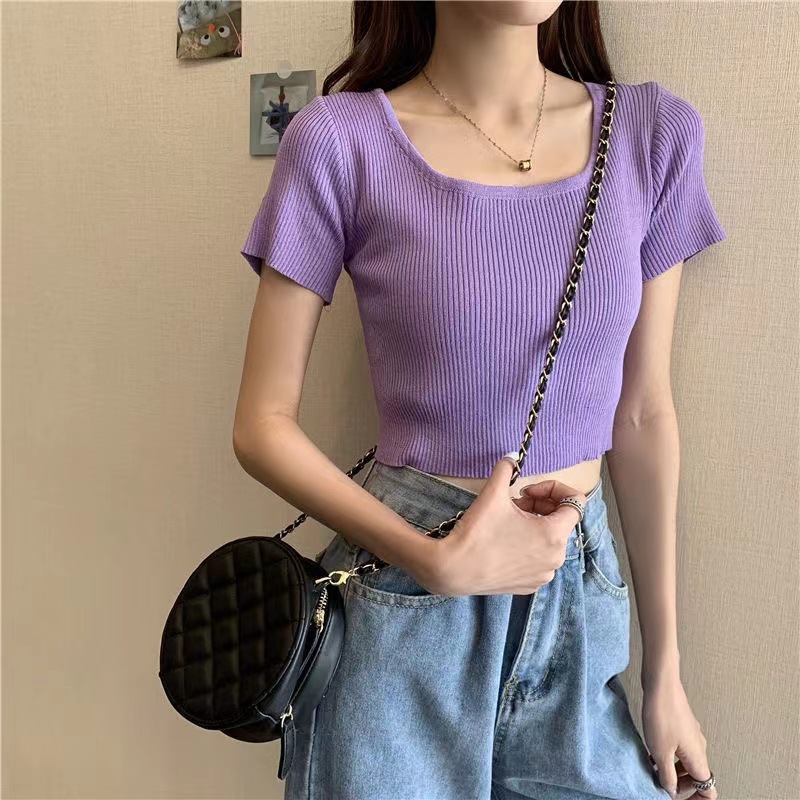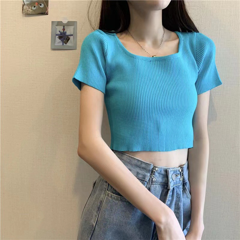 짧은 배꼽 탑 여성용 스퀘어 칼라 쇄골 니트 여름 2023 트렌디 한 티셔츠의 새로운 타이트 반팔 캔디 컬러스토어 가기
