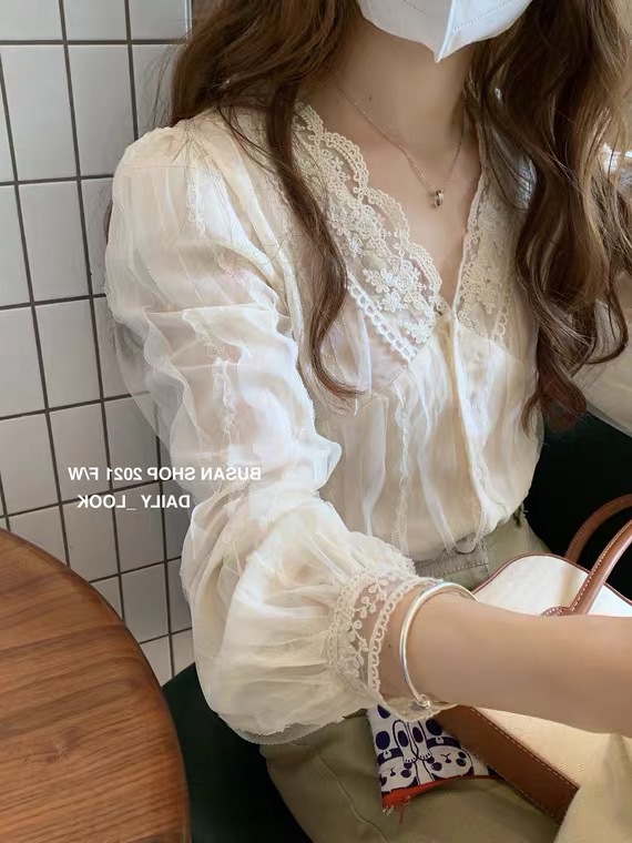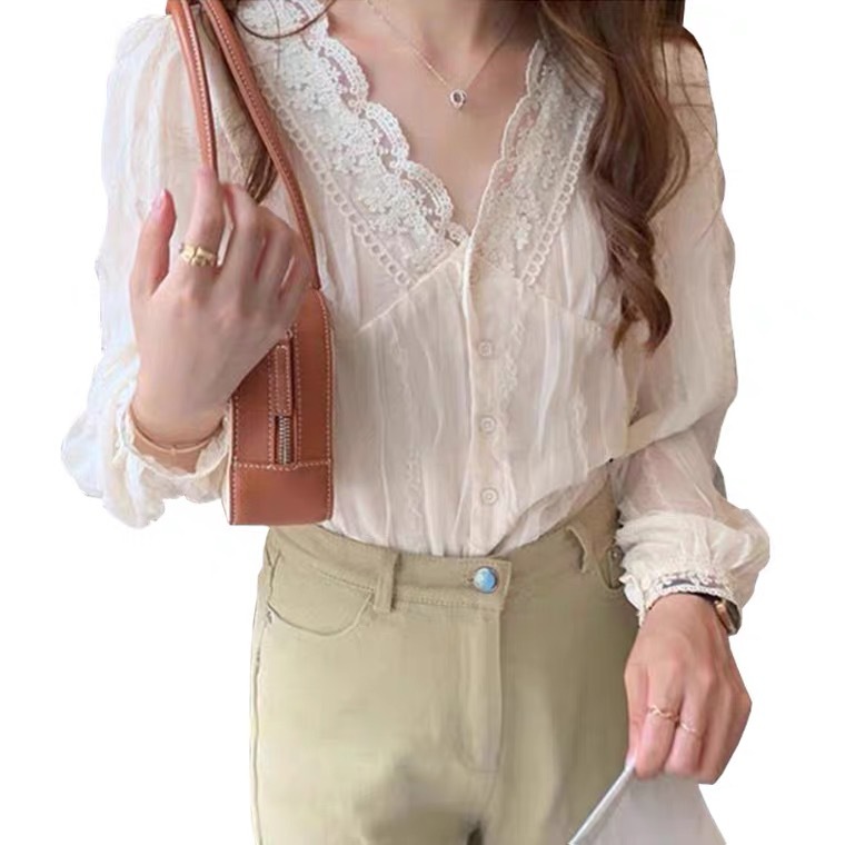 한국 동대문 브이넥 레이스 쉬폰 셔츠 여성 상의 2025 봄 가을 신상 디자인 프렌치 스타일 셔츠