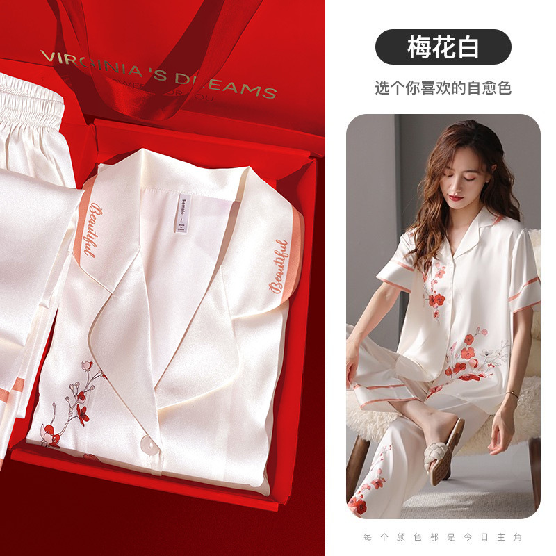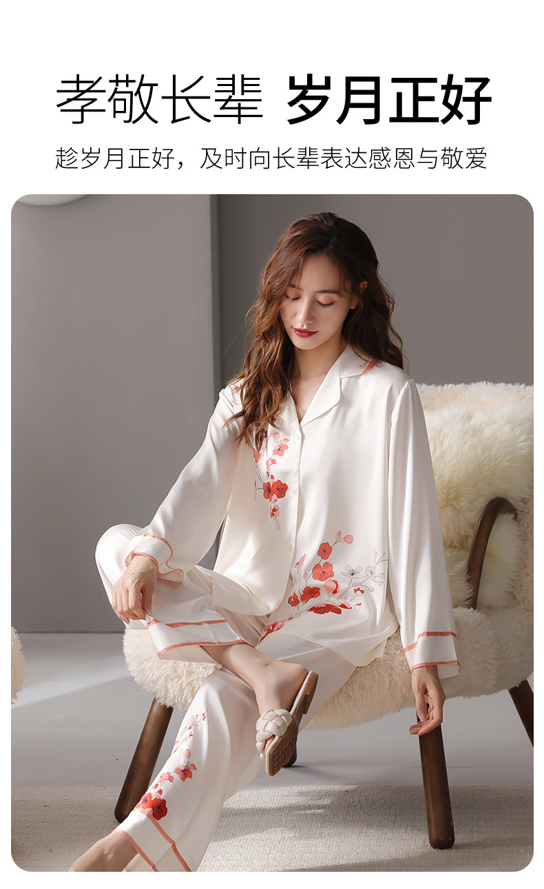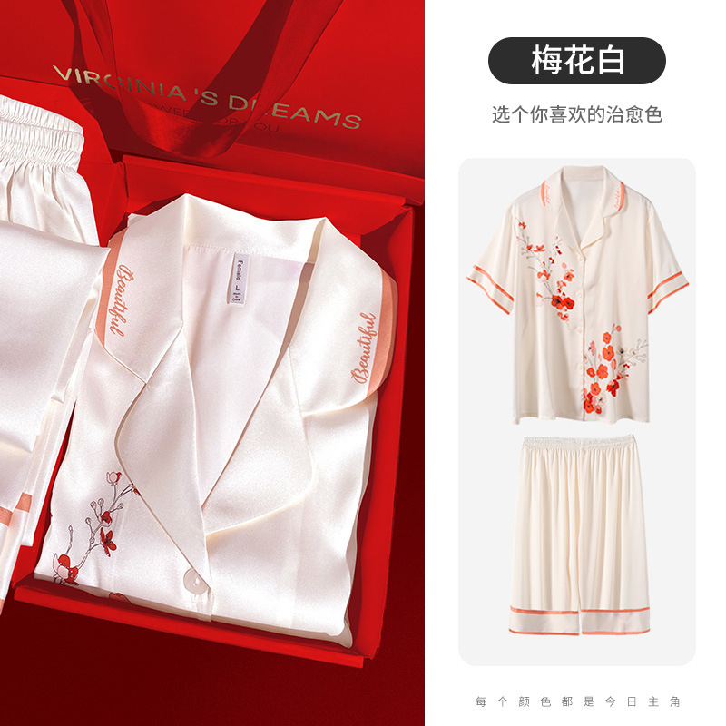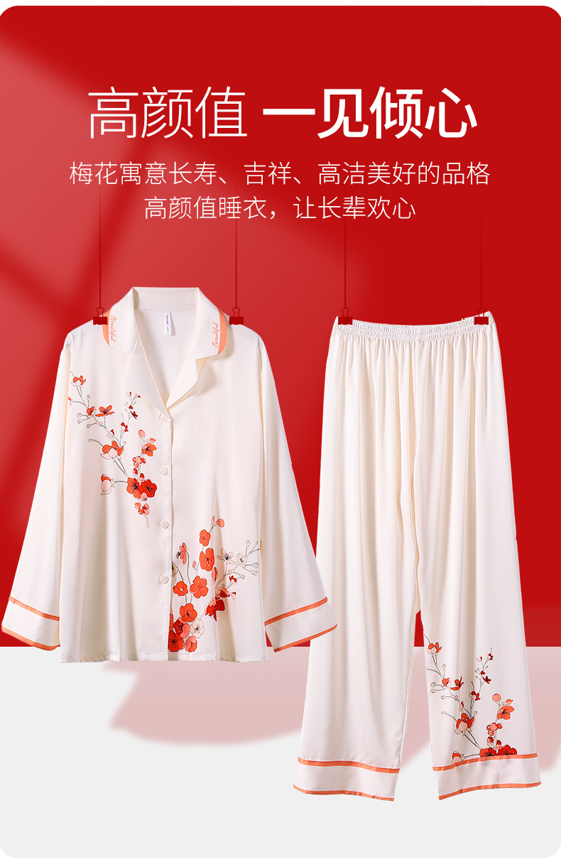 여름에 입기 좋은 매우 부드럽고 아름다운 여성용 잠옷, 매화 프린트 화이트 아이스 실크 잠옷, 여성용 여름 홈웨어, 중년 여성용스토어 가기