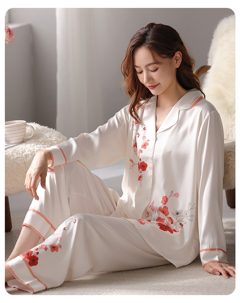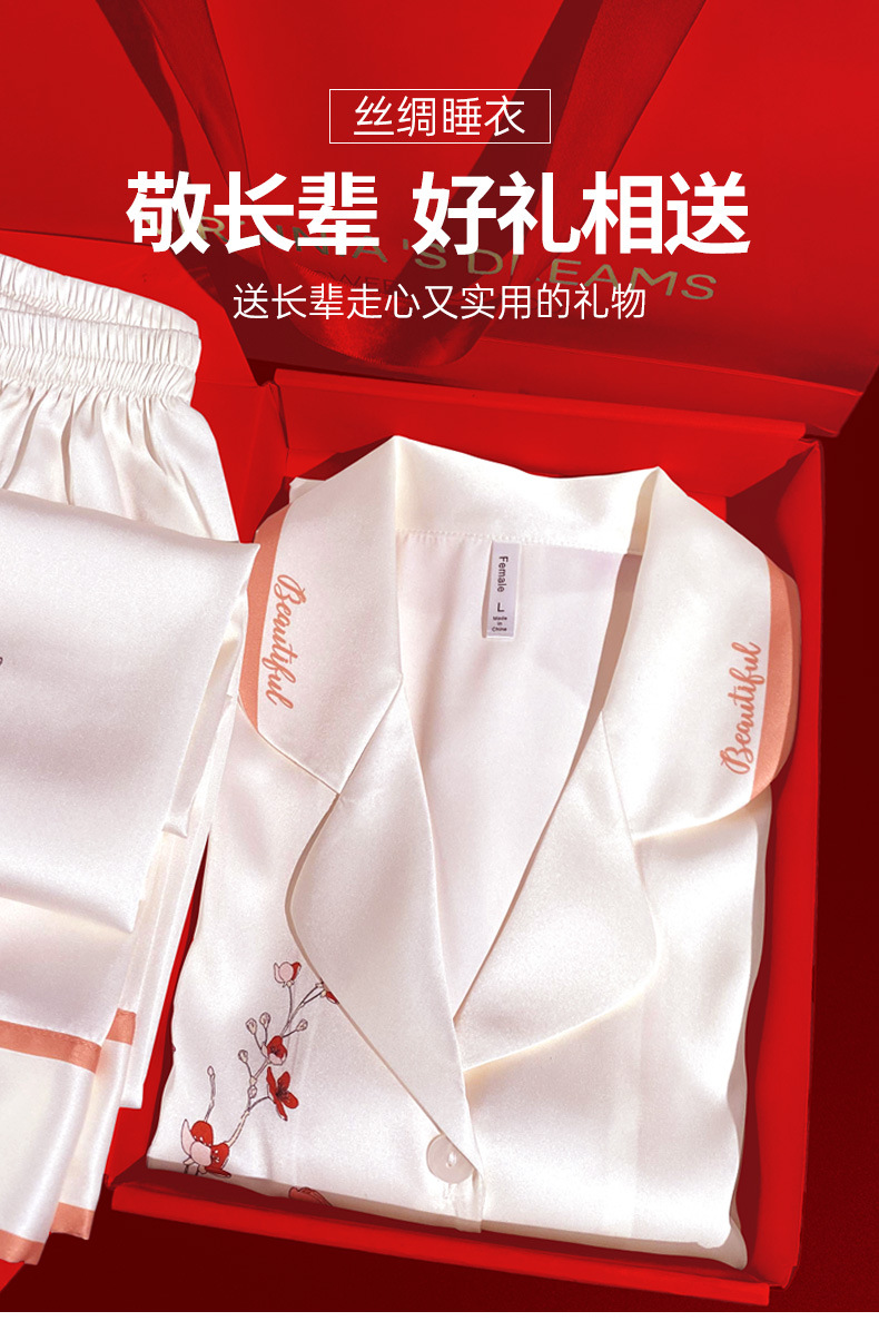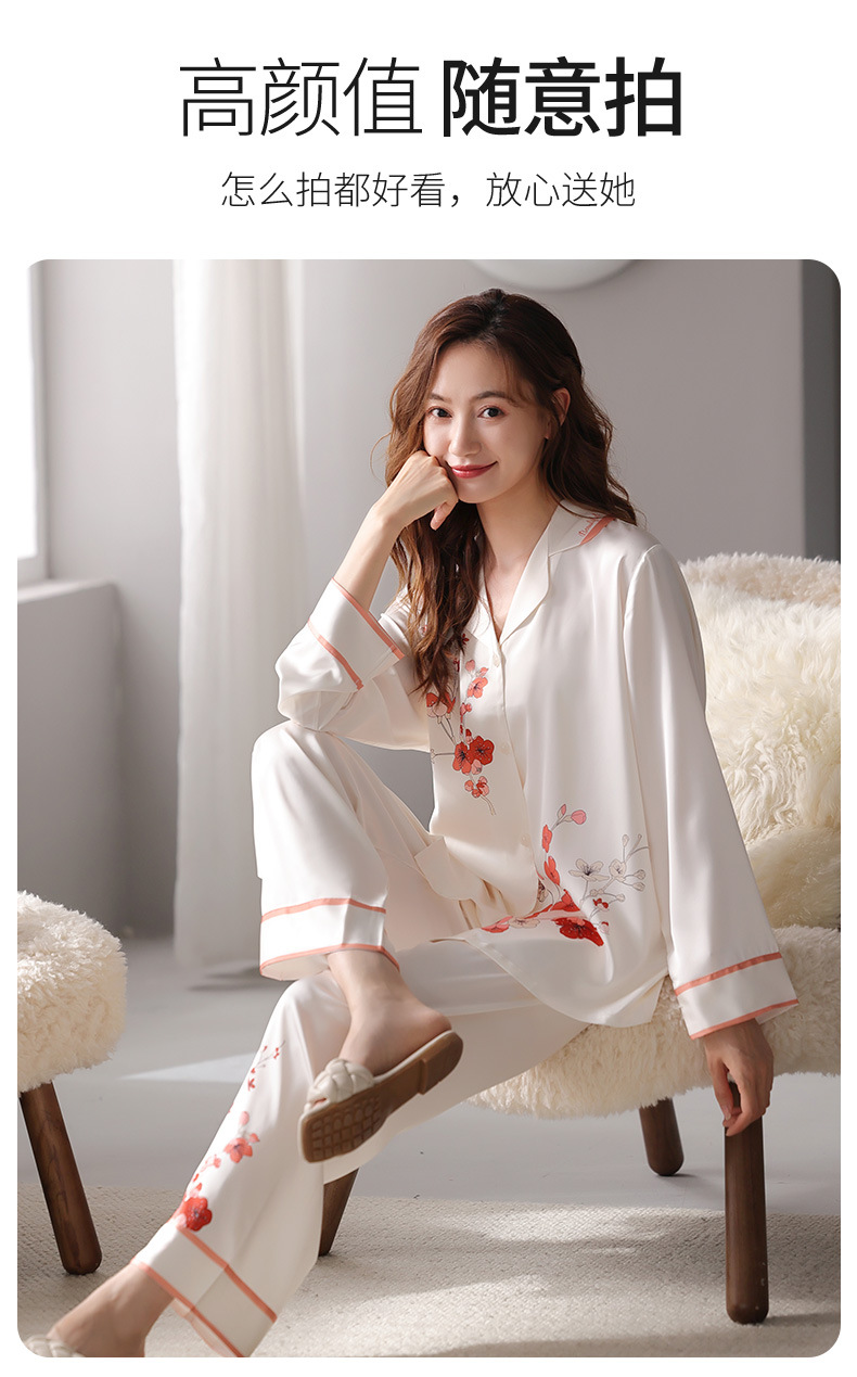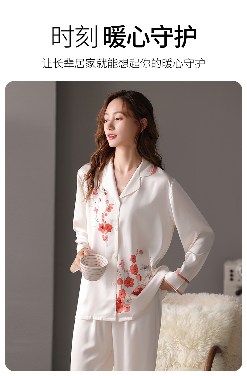 여름에 입기 좋은 매우 부드럽고 아름다운 여성용 잠옷, 매화 프린트 화이트 아이스 실크 잠옷, 여성용 여름 홈웨어, 중년 여성용스토어 가기