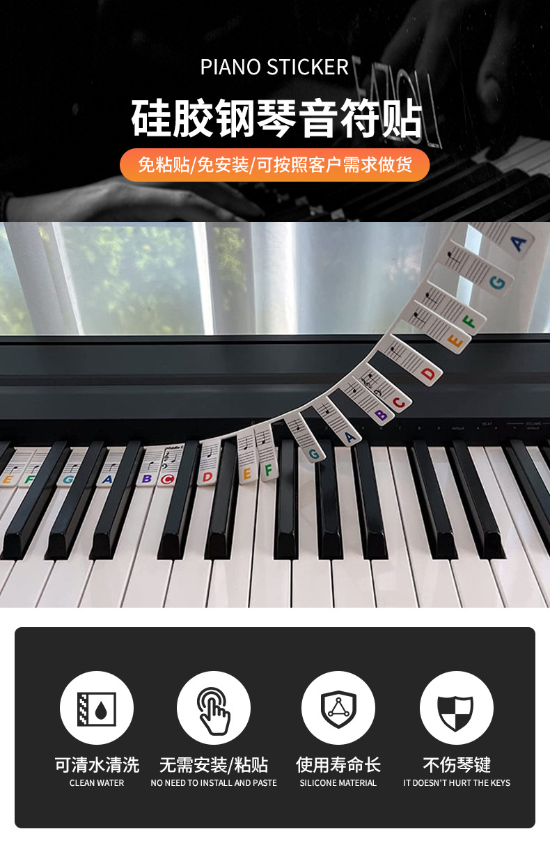 名称:88键硅胶钢琴贴材质:环保型硅胶用途:钢琴音符指南