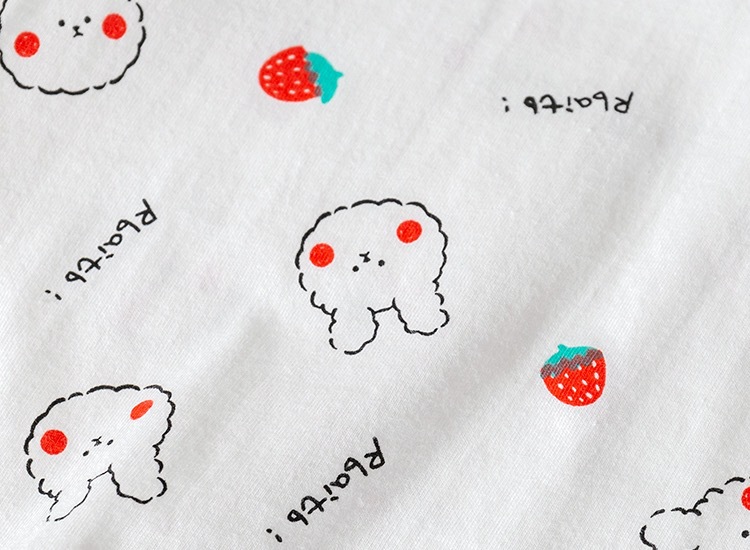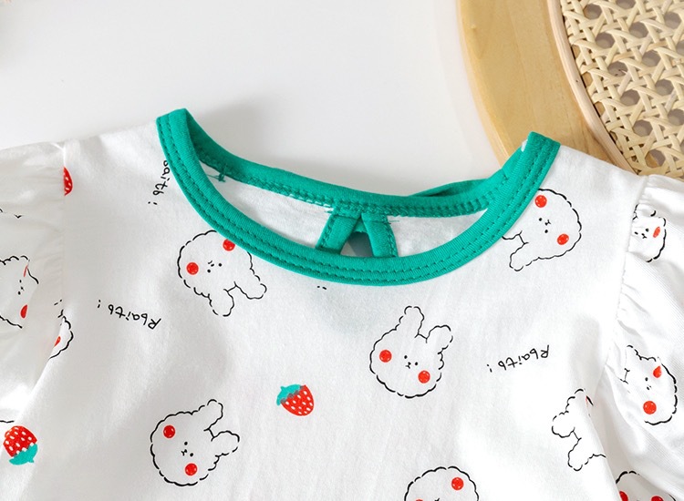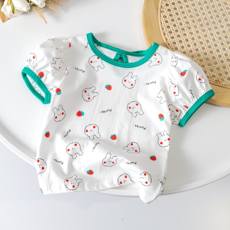 소녀 귀여운 티셔츠 여름 새로운 캐주얼 얇은 딸기 토끼 반팔 보우 탑 여성용 보물베이스 셔츠 3스토어 가기
