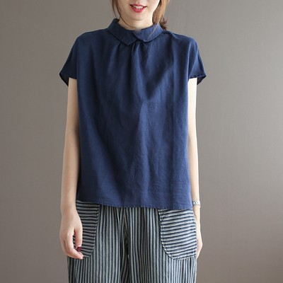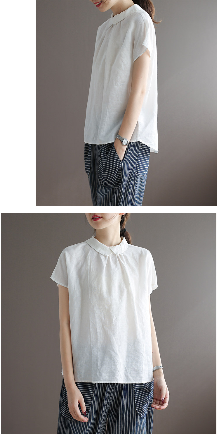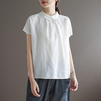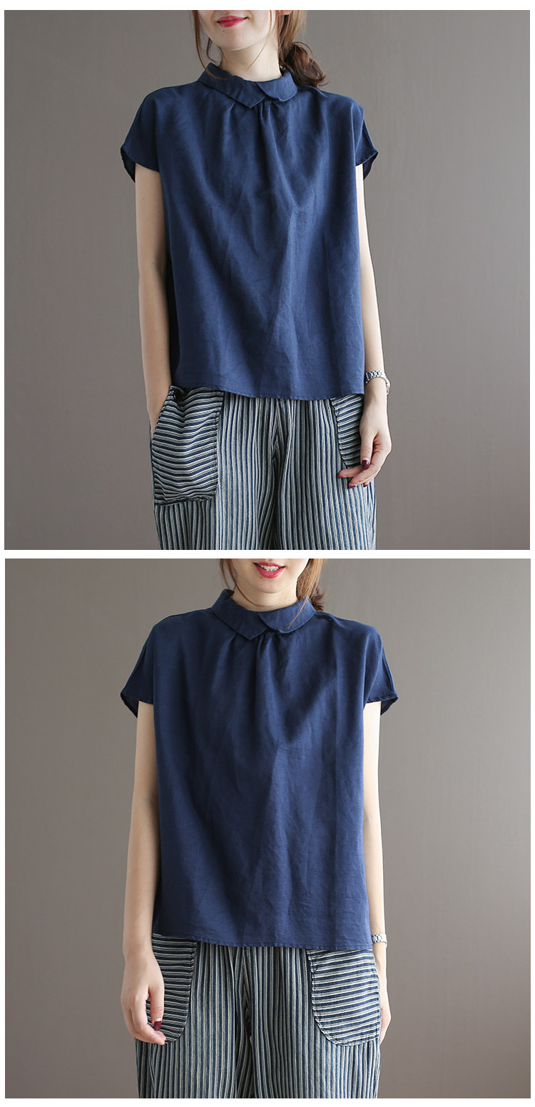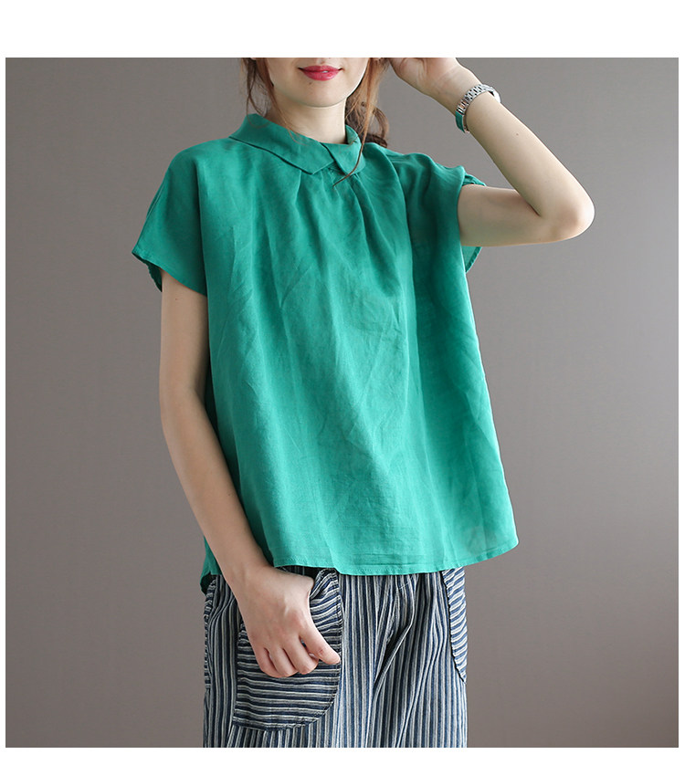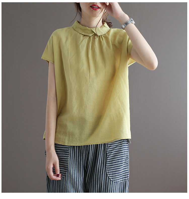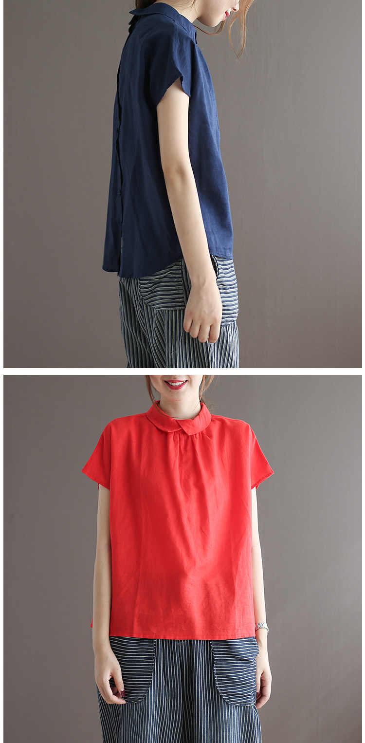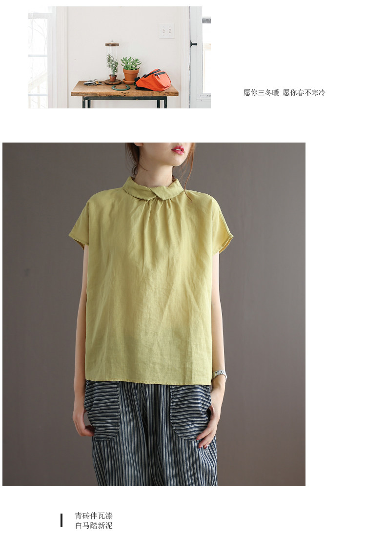 여름 새로운 라미 단색 작은 옷깃 어깨 짧은 소매 뒤 단추 8336 예술적 탑스토어 가기