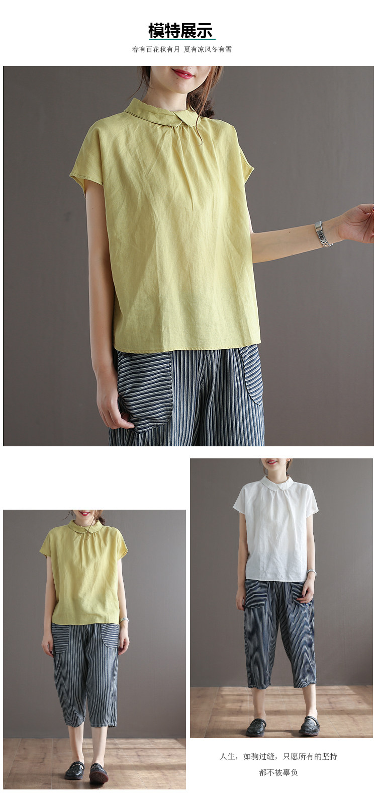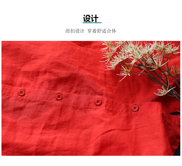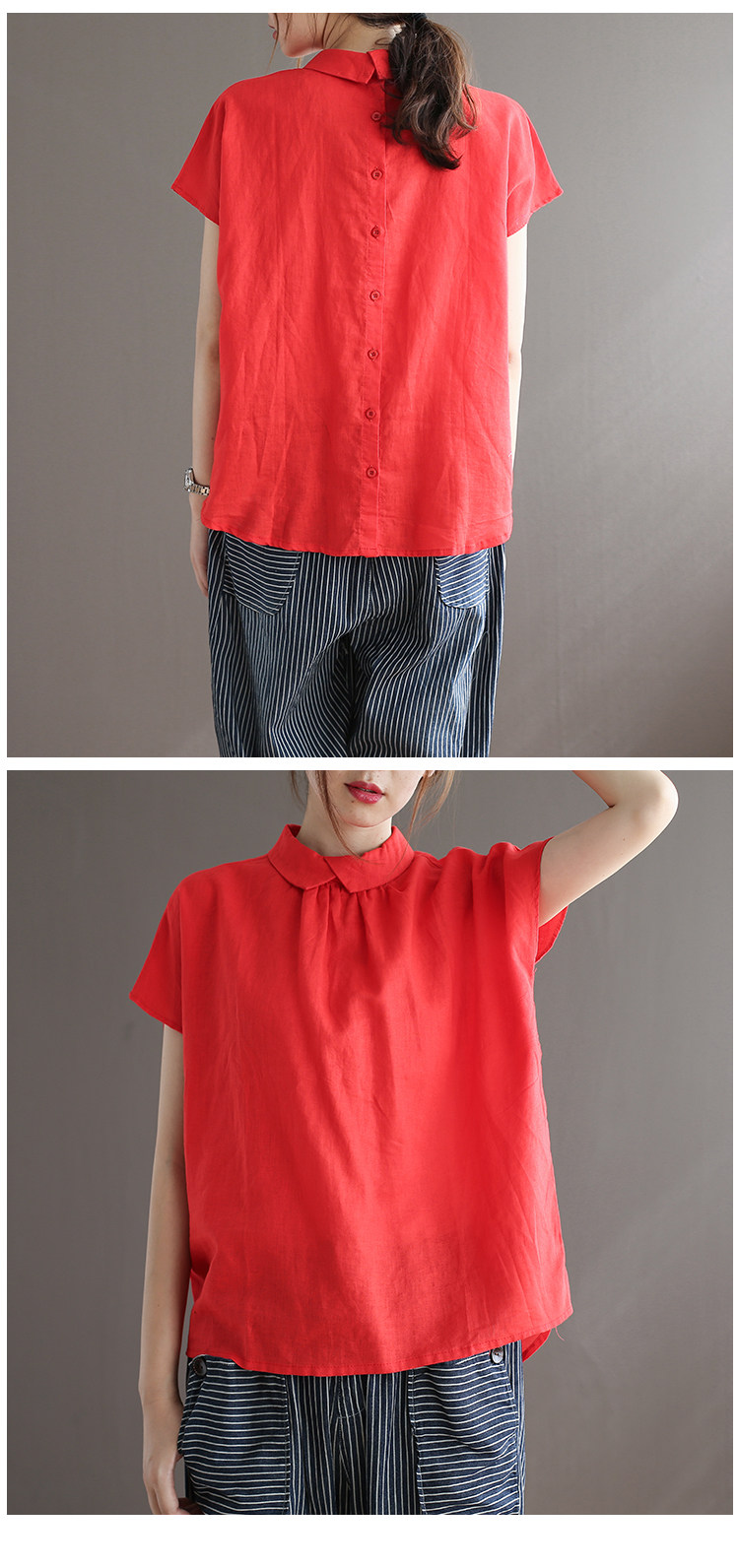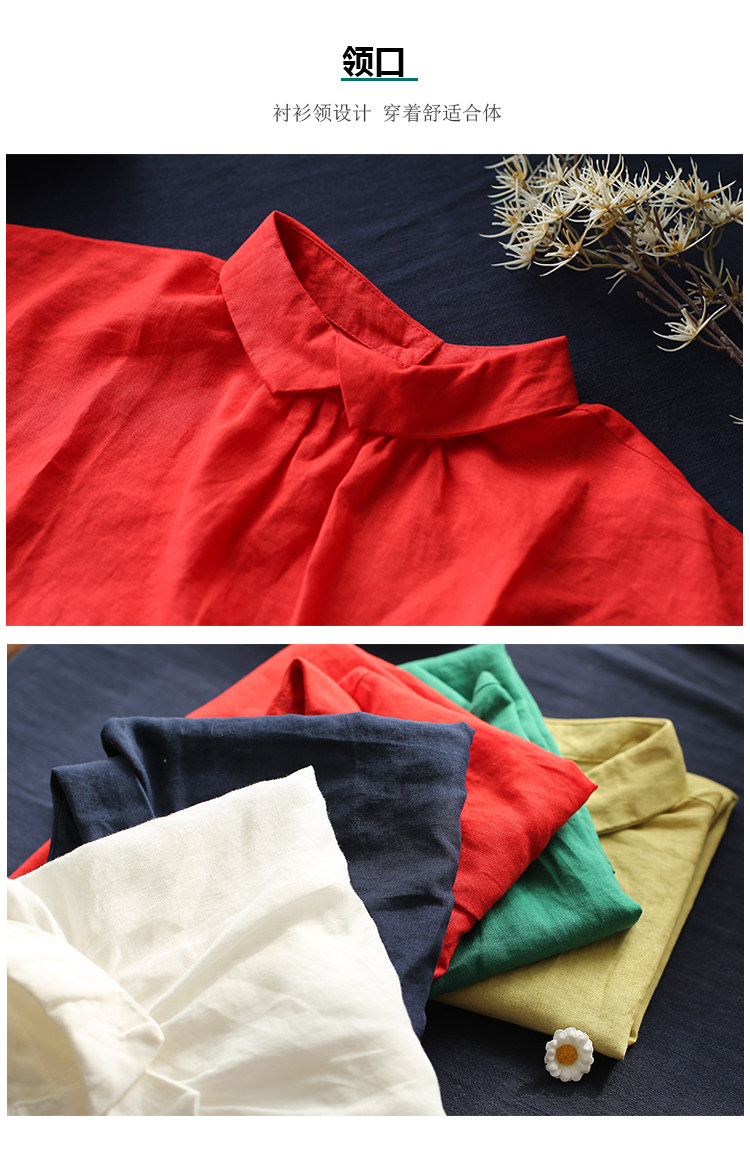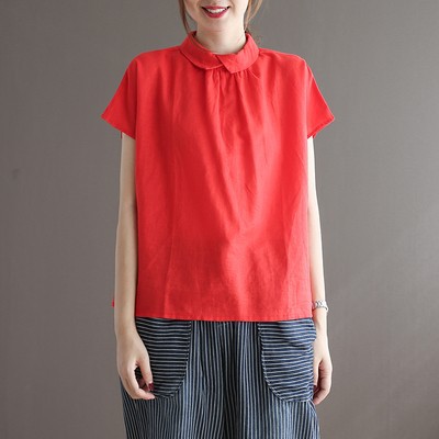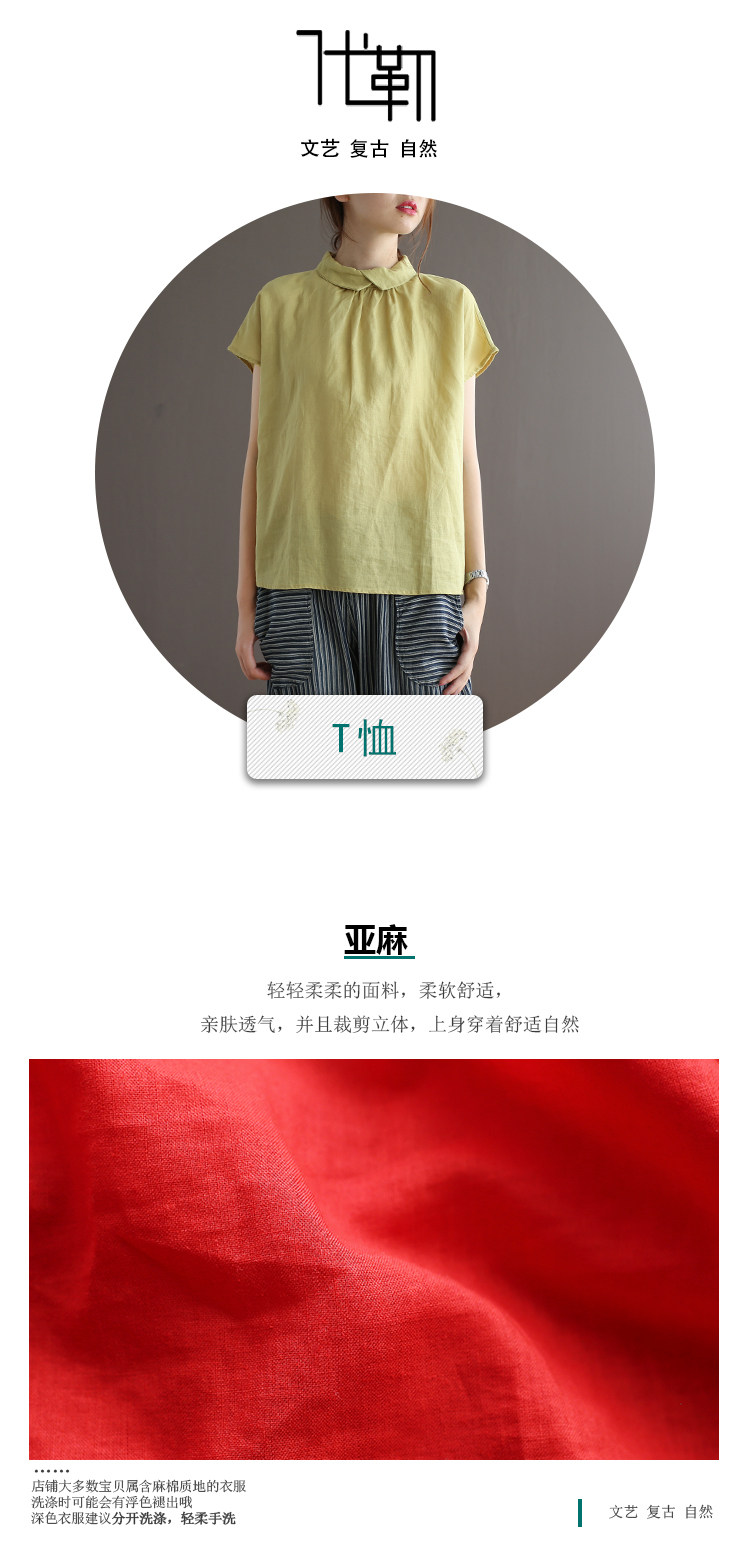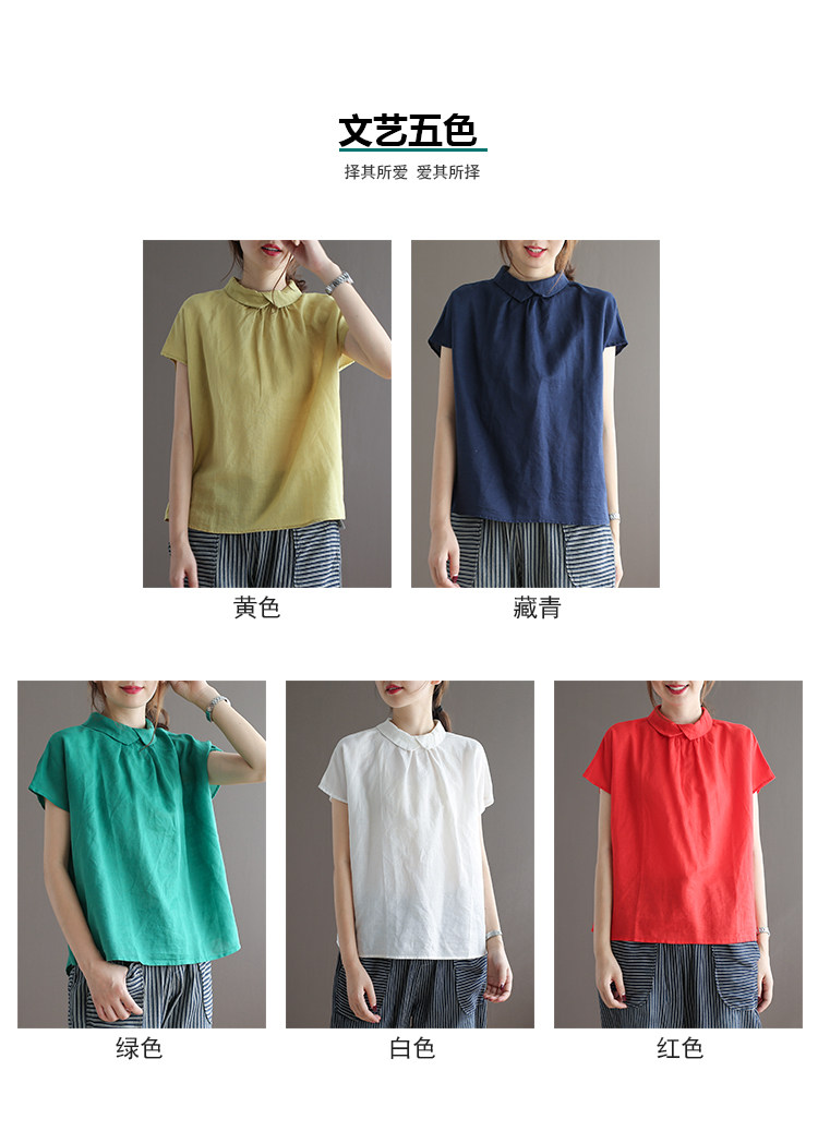 여름 새로운 라미 단색 작은 옷깃 어깨 짧은 소매 뒤 단추 8336 예술적 탑스토어 가기