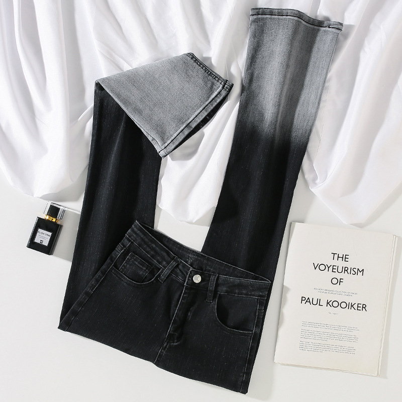 디자인 센스 그라디언트 블랙 마이크로 플레어 진 여성용 봄과 가을 틈새 슬림핏 하이 웨이스트 말굽 바지스토어 가기