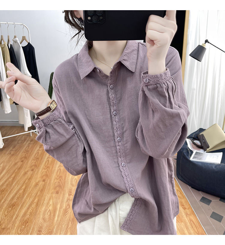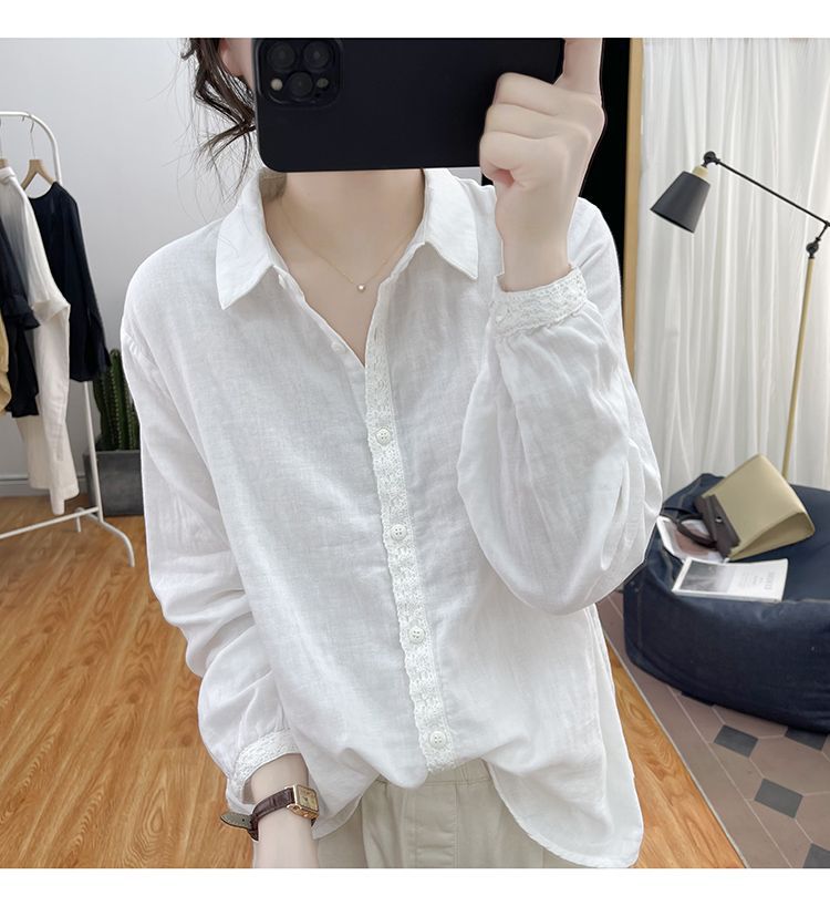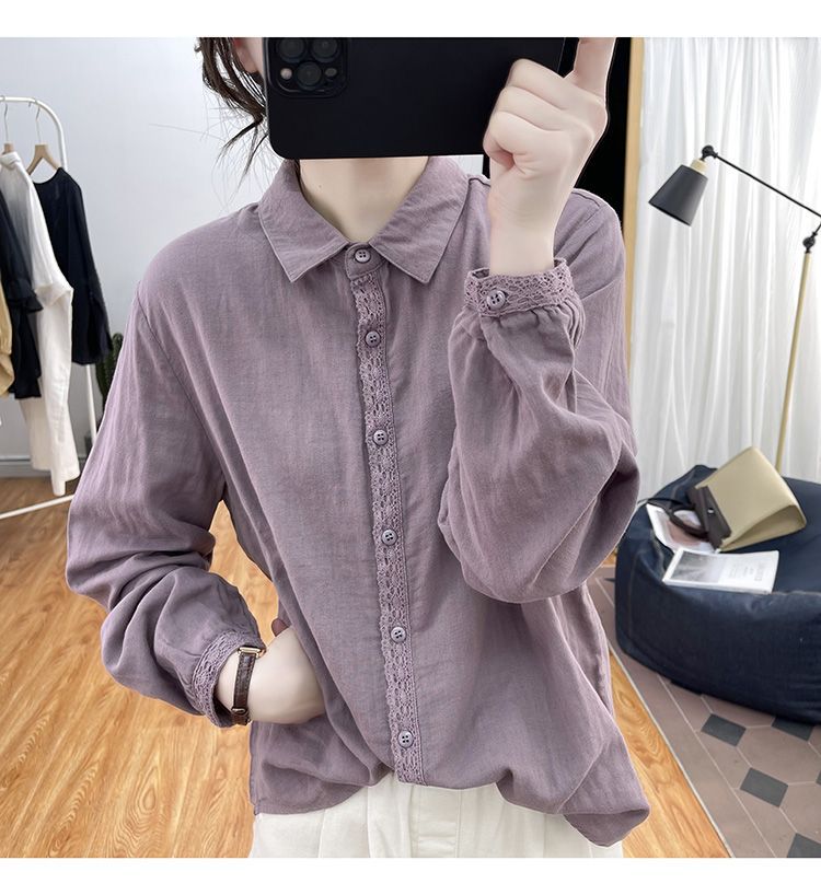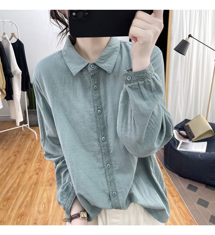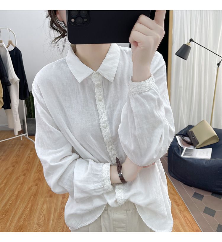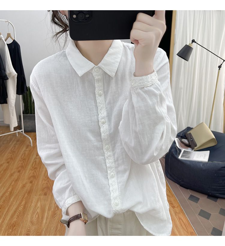 봄과 여름 새로운면 및 린넨 셔츠 여성 레이스 스티칭 코튼 긴 소매 느슨한 나이 감소 탑 복고풍 바닥 셔츠스토어 가기