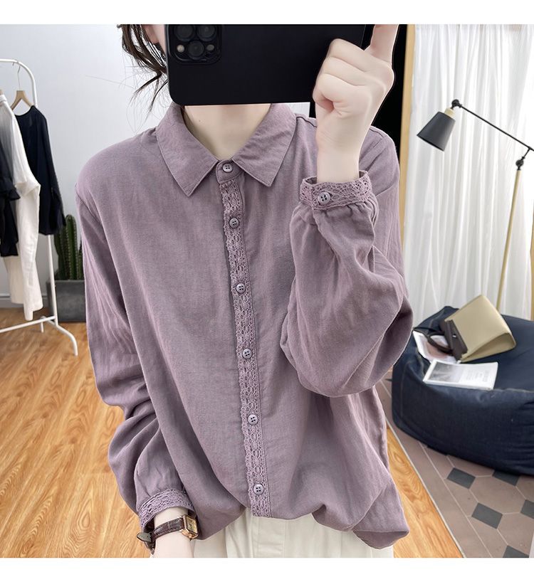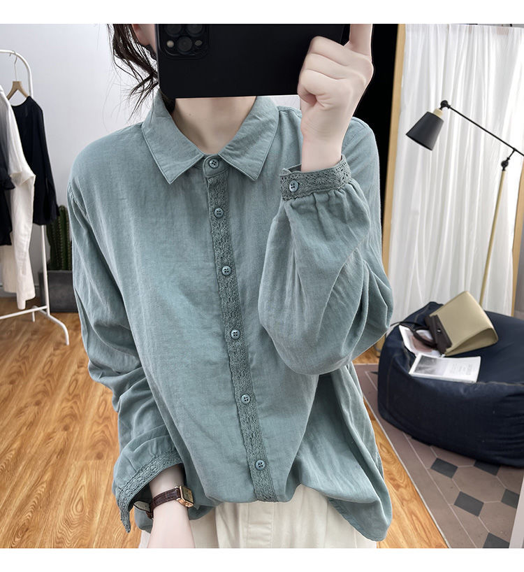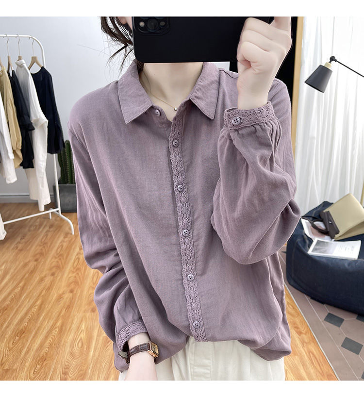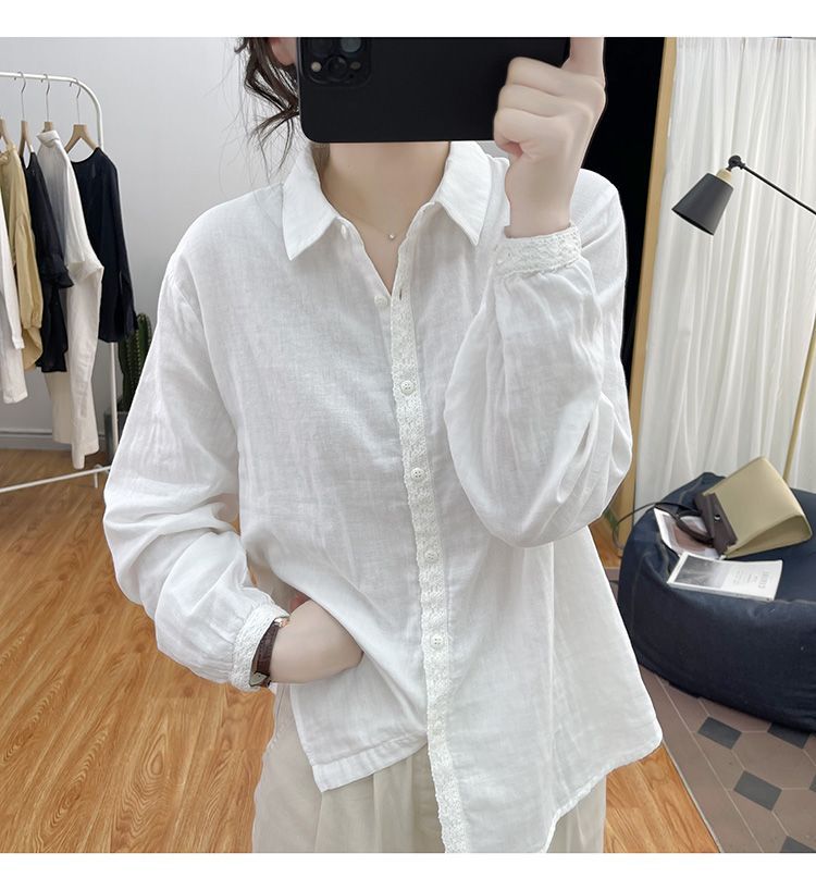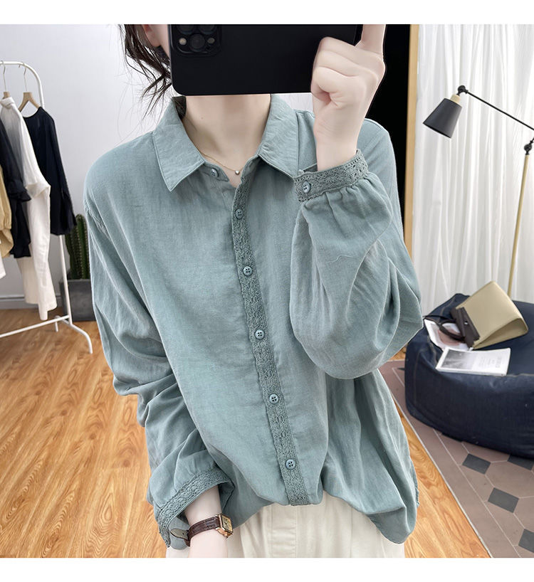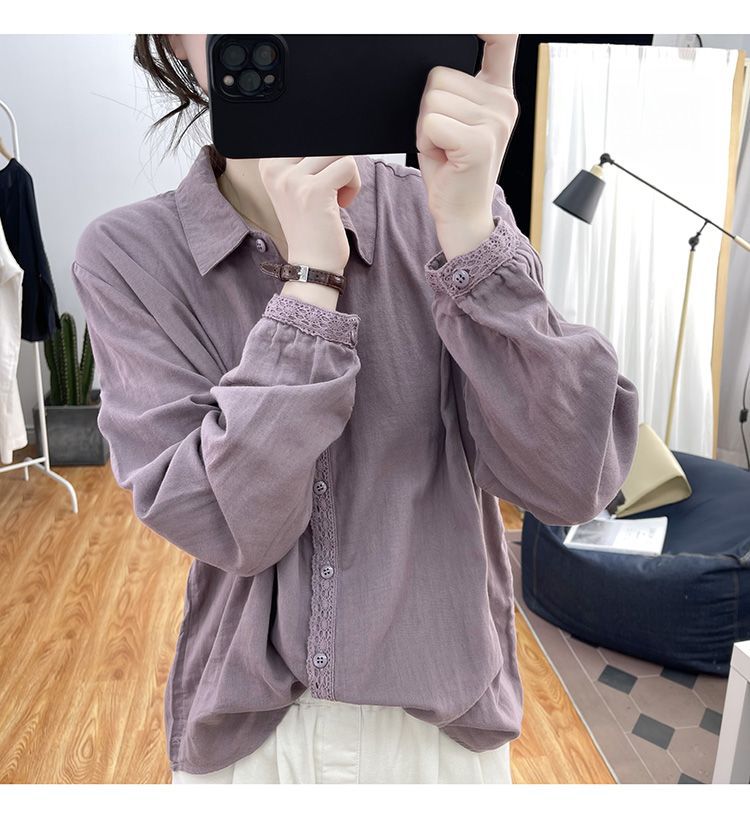 봄과 여름 새로운면 및 린넨 셔츠 여성 레이스 스티칭 코튼 긴 소매 느슨한 나이 감소 탑 복고풍 바닥 셔츠스토어 가기
